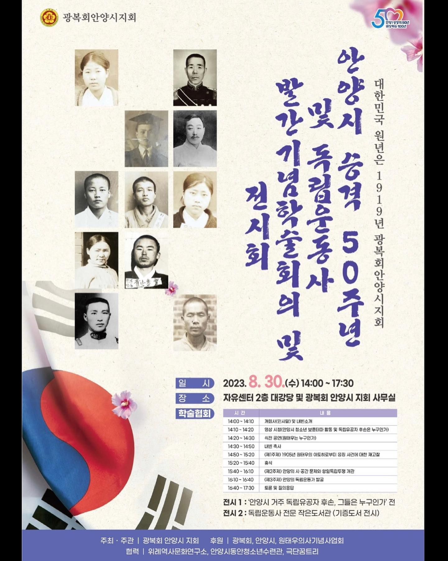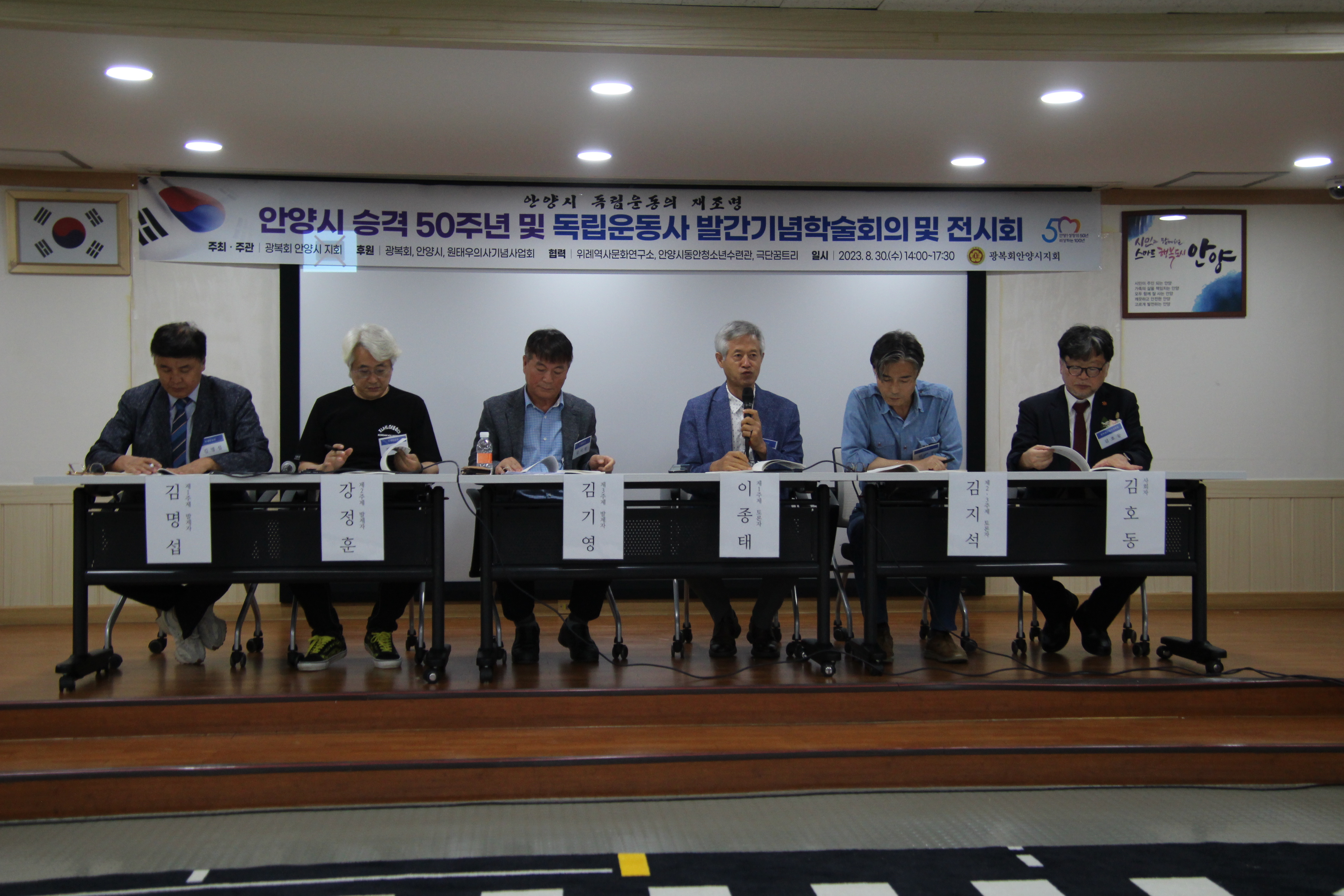 안양시 승격 50주년을 기념 및 안양 독립운동사 발간 기념 학술회의와 전시회가 광복회 안양시지회 주최 주관으로 지난 8월 30일 오후 2시-5시30분 안양 자유센터 2층 대강당 및 광복회 안양지회(평촌 자유공원)에서 열렸다.