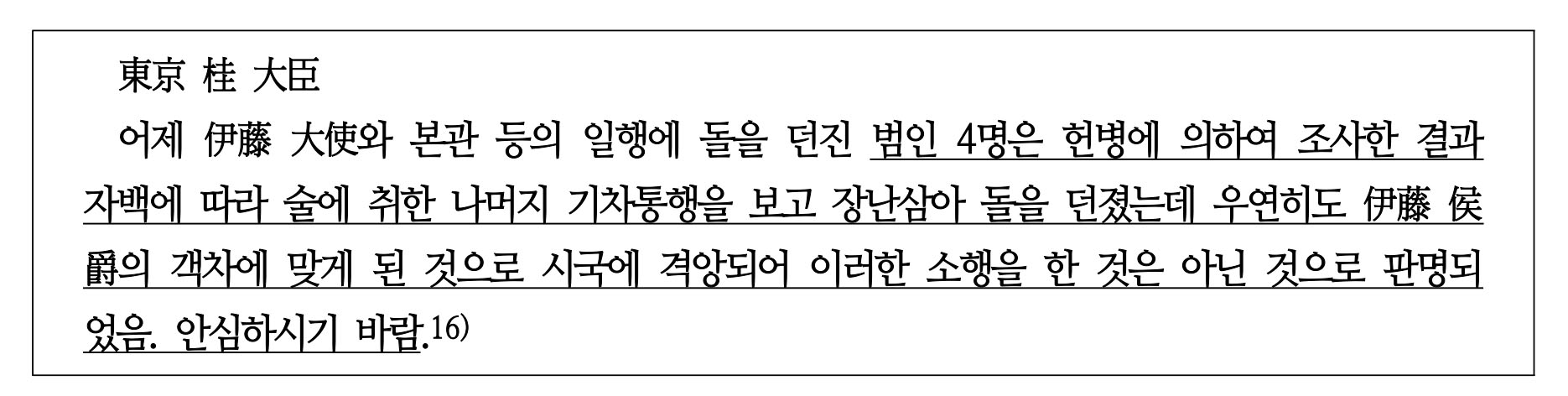 16) <伊藤 侯 탑승 열차 投石 사건에 관한 건3(1905년 11월 23일)>(『주한일본공사관기록』