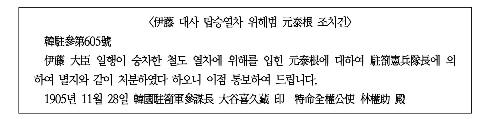 7) <伊藤 대사 탑승열차 위해범 元泰根 조치건>(1905년 11월 25일)