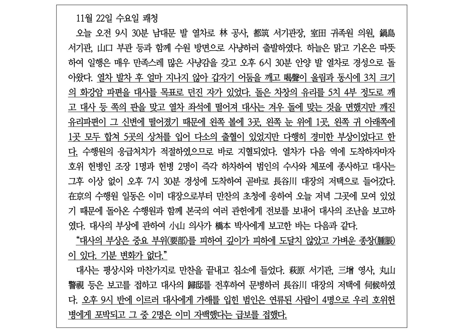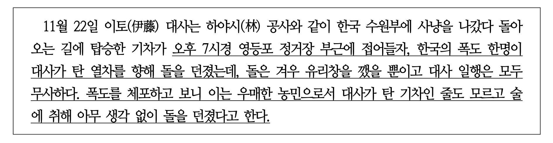 11월 22일 이토(伊藤) 대사는 하야시(林) 공사와 같이 한국 수원부에 사냥을 나갔다 돌아오는 길에 탑승한 기차가 오후 7시경 영등포 정거장 부근에 접어들자, 한국의 폭도 한명이 대사가 탄 열차를 향해 돌을 던졌는데, 돌은 겨우 유리창을 깼을 뿐이고 대사 일행은 모두 무사하다. 폭도를 체포하고 보니 이는 우매한 농민으로서 대사가 탄 기차인 줄도 모르고 술에 취해 아무 생각 없이 돌을 던졌다고 한다.