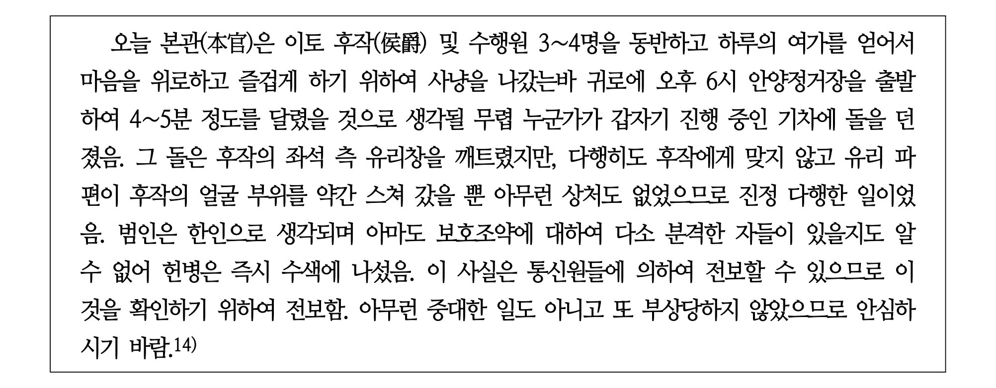 14) <伊藤 侯 탑승 열차 投石 사건에 관한 건(1905년 11월 22일)>(『주한일본공사관기록』