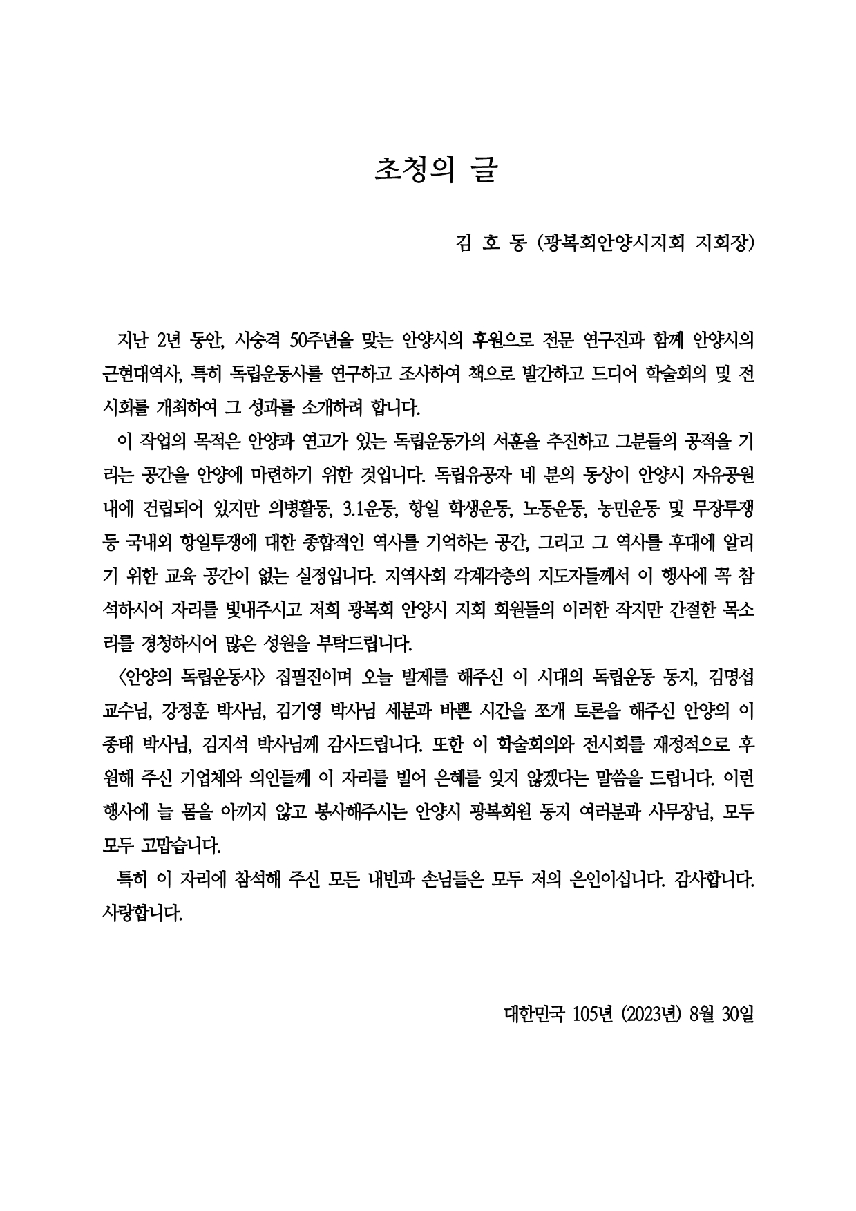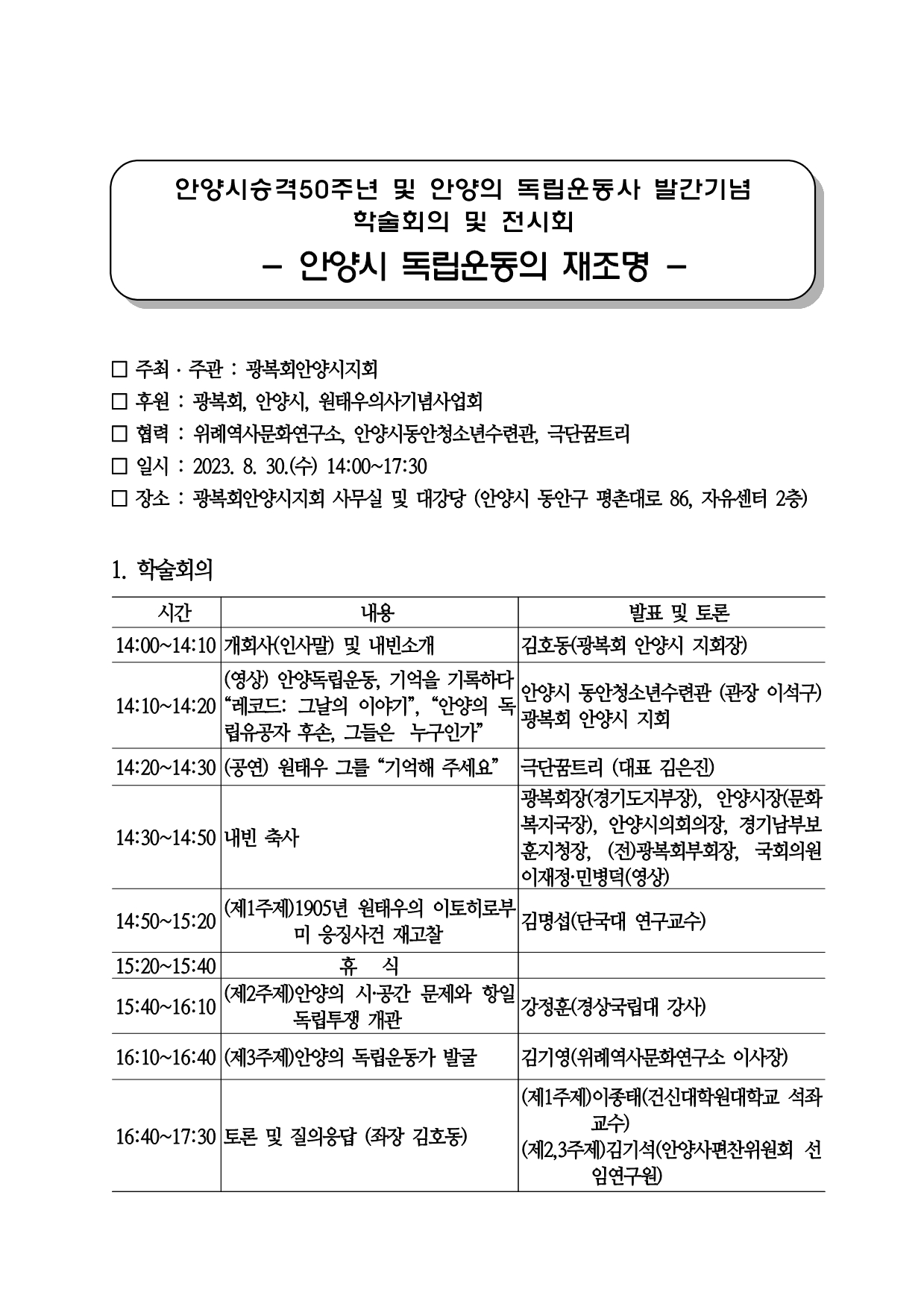 안양시 승격 50주년을 기념 및 안양 독립운동사 발간 기념 학술회의와 전시회가 광복회 안양시지회 주최 주관으로 지난 8월 30일 오후 2시-5시30분 안양 자유센터 2층 대강당 및 광복회 안양지회(평촌 자유공원)에서 열렸다.