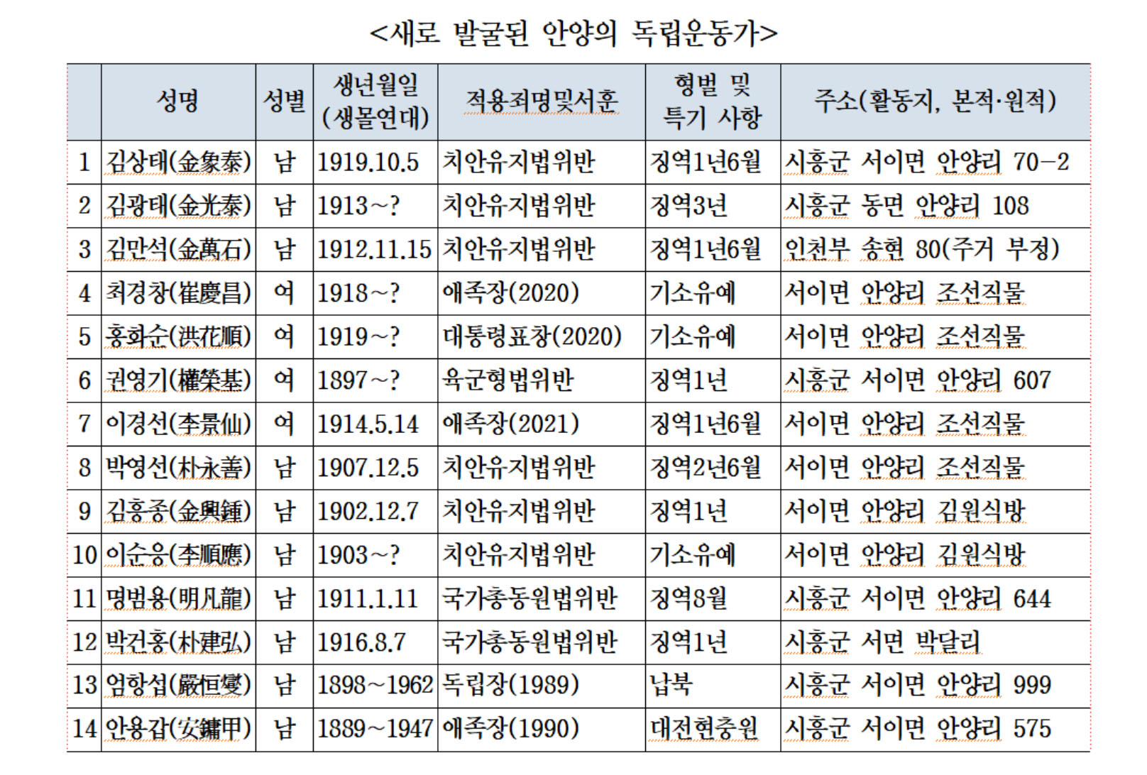 - 일제 침략에 맞서 싸운 안양의 독립운동가들을 조명하였는바 대표적인 인물로 이영래(李永來1873-1949), 하영홍(河泳弘1879-1915), 원태우(元泰祐1882-1950), 한흥이(韓興履1897-1979), 이재천(李在天1913-?), 이재현(李在賢1917-1997)등이 있으며, 더불어 일제의 감시대상에 올라있던 인물들, 즉 김흥종(金興鍾1902-?), 박영선(朴永善1907-?), 명범용(明凡龍1911-?), 이경선(李景仙1914-?), 김상태(金象泰 1919-?) 등과 안양 지역과 연고가 있는 안용갑(安鏞甲, 1889-1947), 김국주(金國柱, 1924-2021) 등의 독립운동에 대해서도 새롭게 조명하였음