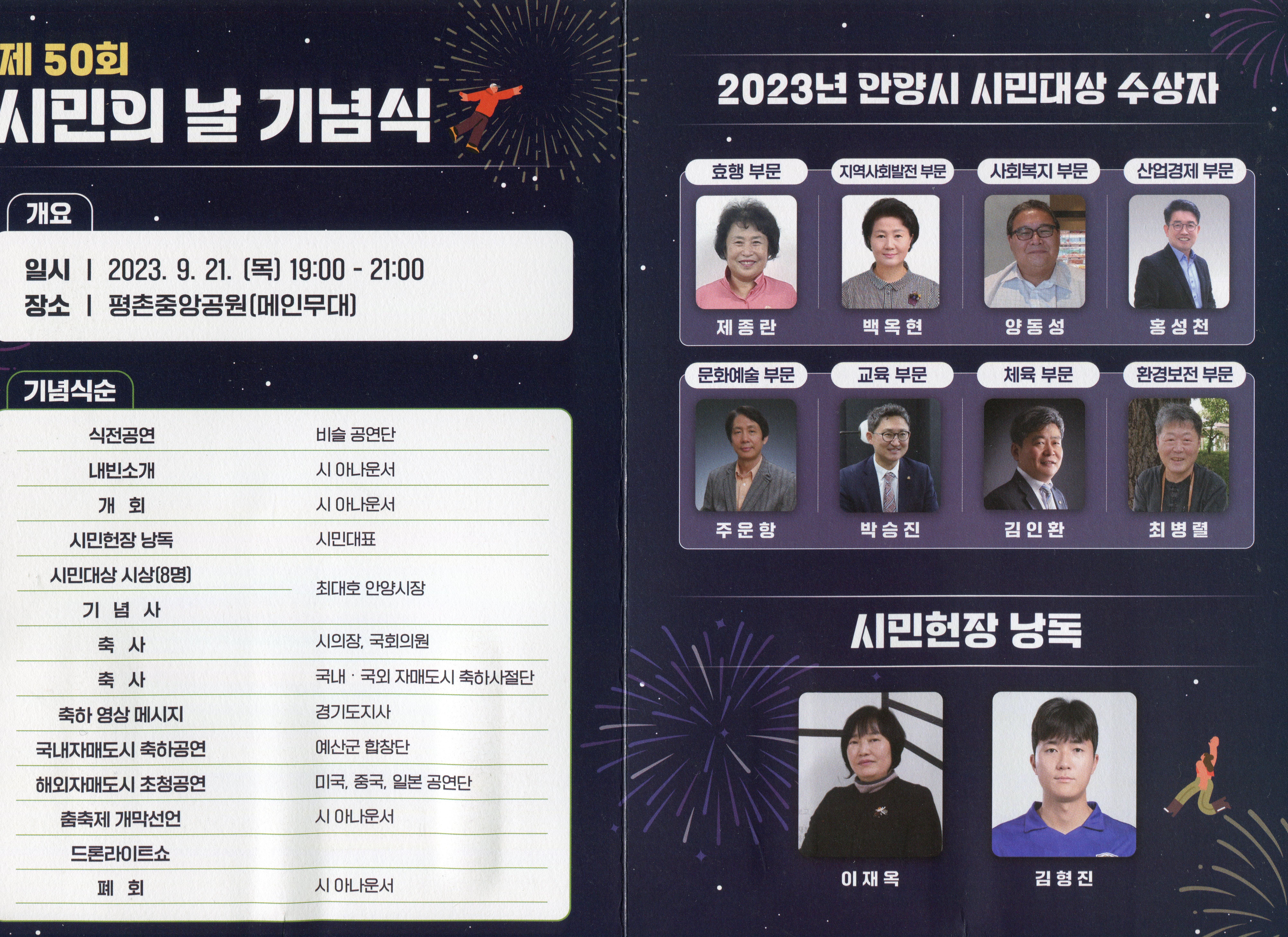 최대호 안양시장은 “자신의 분야에서 열정을 갖고 활동하며 안양을 위해 애써주신 시민들께 감사드린다”고 전했다.