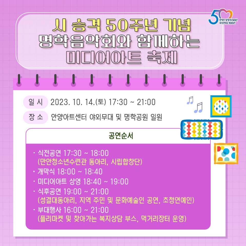 10월 11일 수요일에는 석수3동에서 ‘충훈낭만음악회’, 10월 13일 금요일에는 비산1동에서 진행하는 ‘수푸푸지음악회’와 비산2동에서 진행하는 ‘쌍개울예능한마당축제’, 10월 14일 토요일에는 갈산동에서 진행하는 ‘갈산동 이야기’와 안양8동에서 진행하는 ‘명학음악회’가 열리고 28일에는 관양동 동편마을 중앙도로에서 동편마을축제가 열린다.