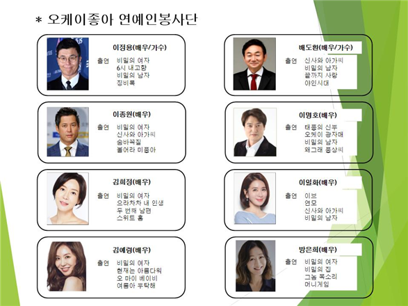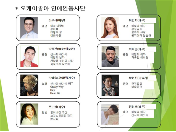 행사관계자에 따르면 오케이좋아 연예인봉사단은 KBS드라마 [신사와아가씨] 출연진이 오케이좋아 연예인봉사단을 창단하고 첫 행사로 안양을 찾아와 지난달 6월8일 안양아트센터 야외광장에서 연예인 공연과 함께 안양의 어르신 500여분께 사랑의 짜장 나눔 행사를 실시한바 있어 이번 10월 행사가 안양에서의 두번째 봉사활동이다.