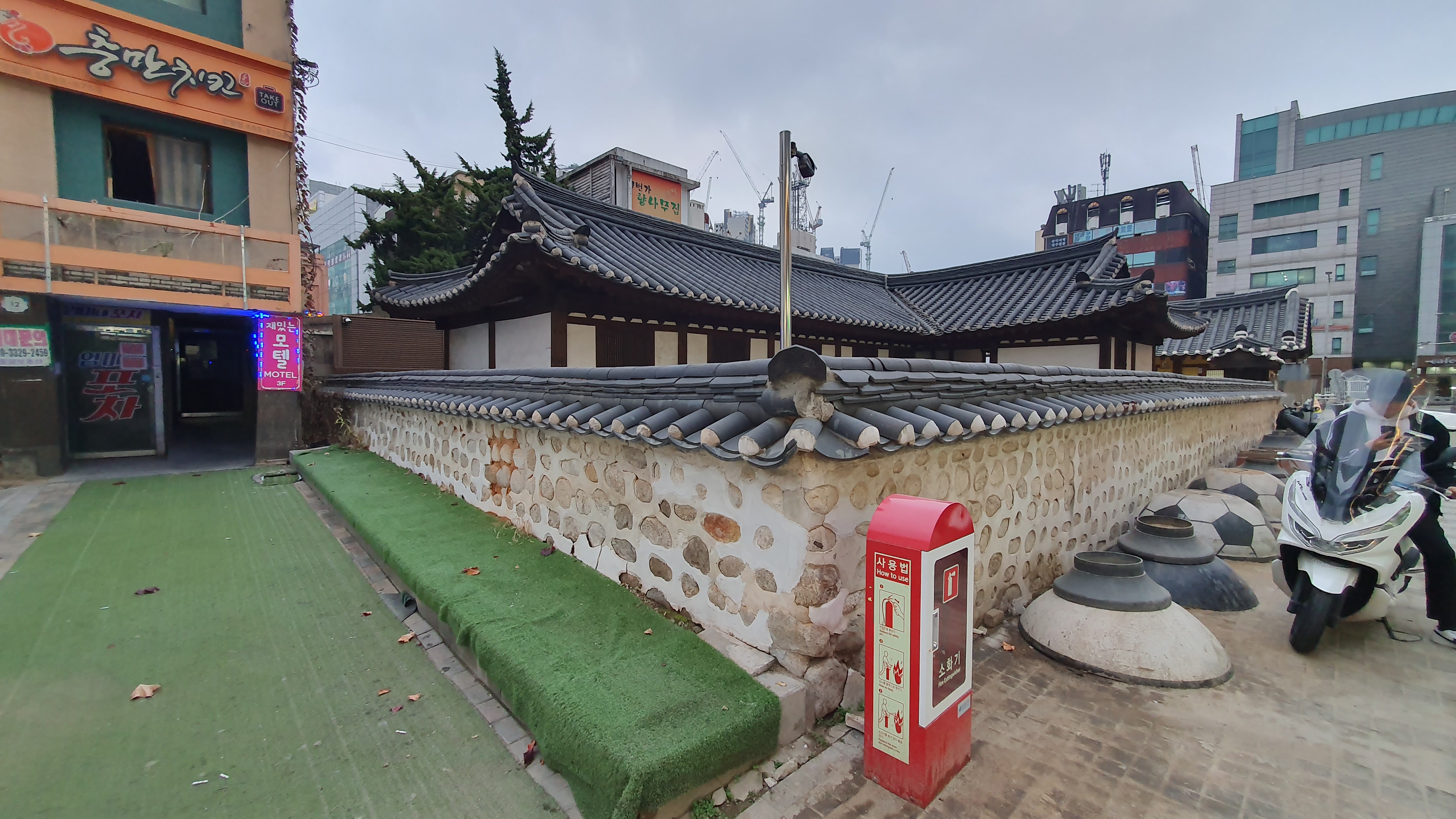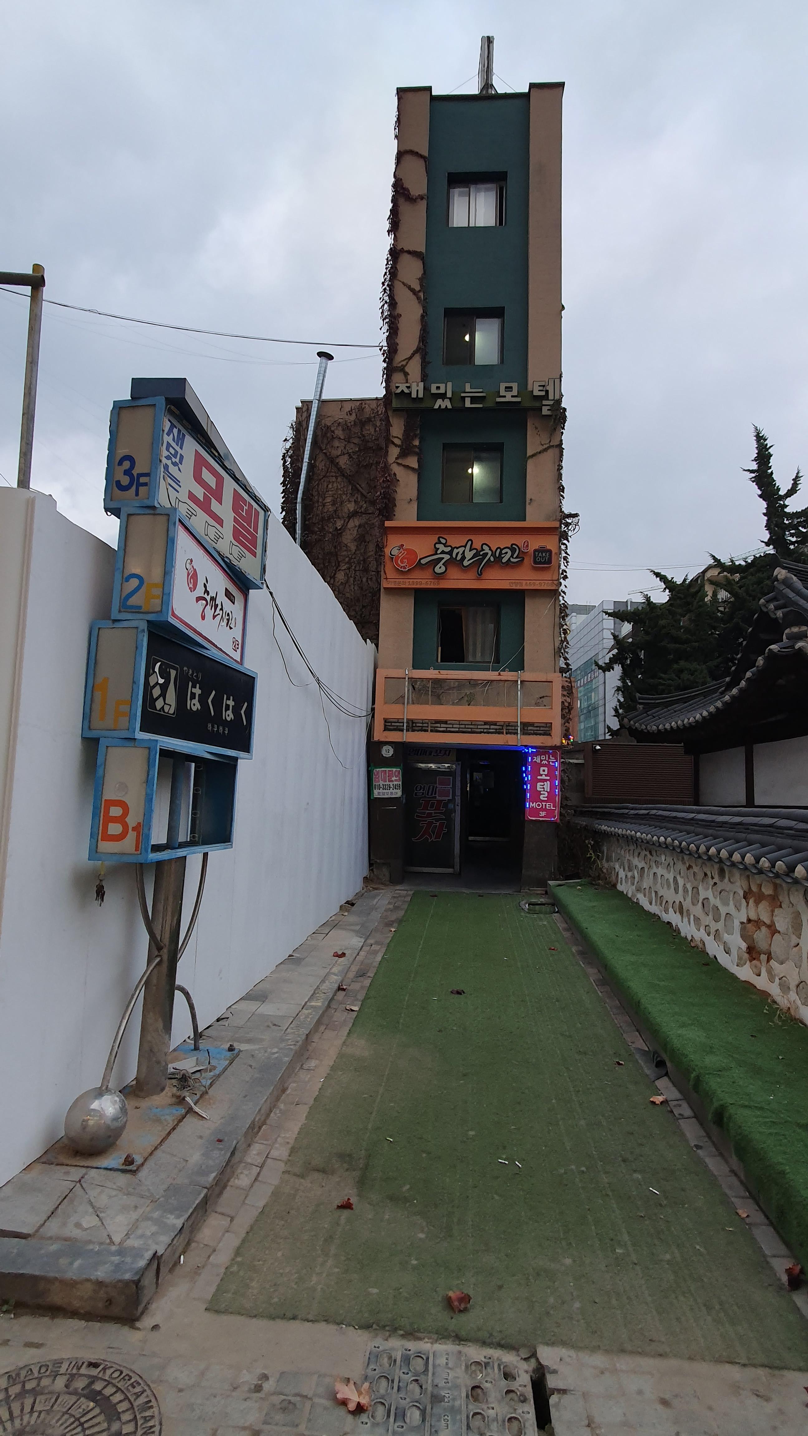 2023.11.06/ #도시기록 #안양 #안양일번가 #안양1동/ 안양일번가 쌈지공원(청년공간 건립 준비중)과 구 서이면사무소 건물 중간에 자리한 3층 건물. 폭은 불과 3-4미터에 길이는 15-20미터 정도 되는 길죽한 건물로 1.2층에는 음식점과 3층에는 모텔이 자리하고 있다, 안양시가 안양옥갈비집(현 서이면사무소)를 매입할 당시에 안양1동사무소, 서이면사무소와 두 건물 사이에 낀 사진속 건물 그리고 주변 가게들(안양감자탕, 양화원꽃집, 서서갈비 등)을 매입하여 안양일번가문화공원 조성을 추진했었다. 이후 서이면사무소의 대들보 상량문이 발견되고 친일 논란이 불거지며 문화공원 조성 기획은 무산되고 말았다. 안양일번가 상권이 몰락하다시피 침체한 현재가 안양일번가 발전을 새롭게 모색하고 새로운 그림을 그릴수 있는 적기가 아닌가 싶다. 안앙시와 지역정치인들이 만안구의 미래를 고민해야 한다.