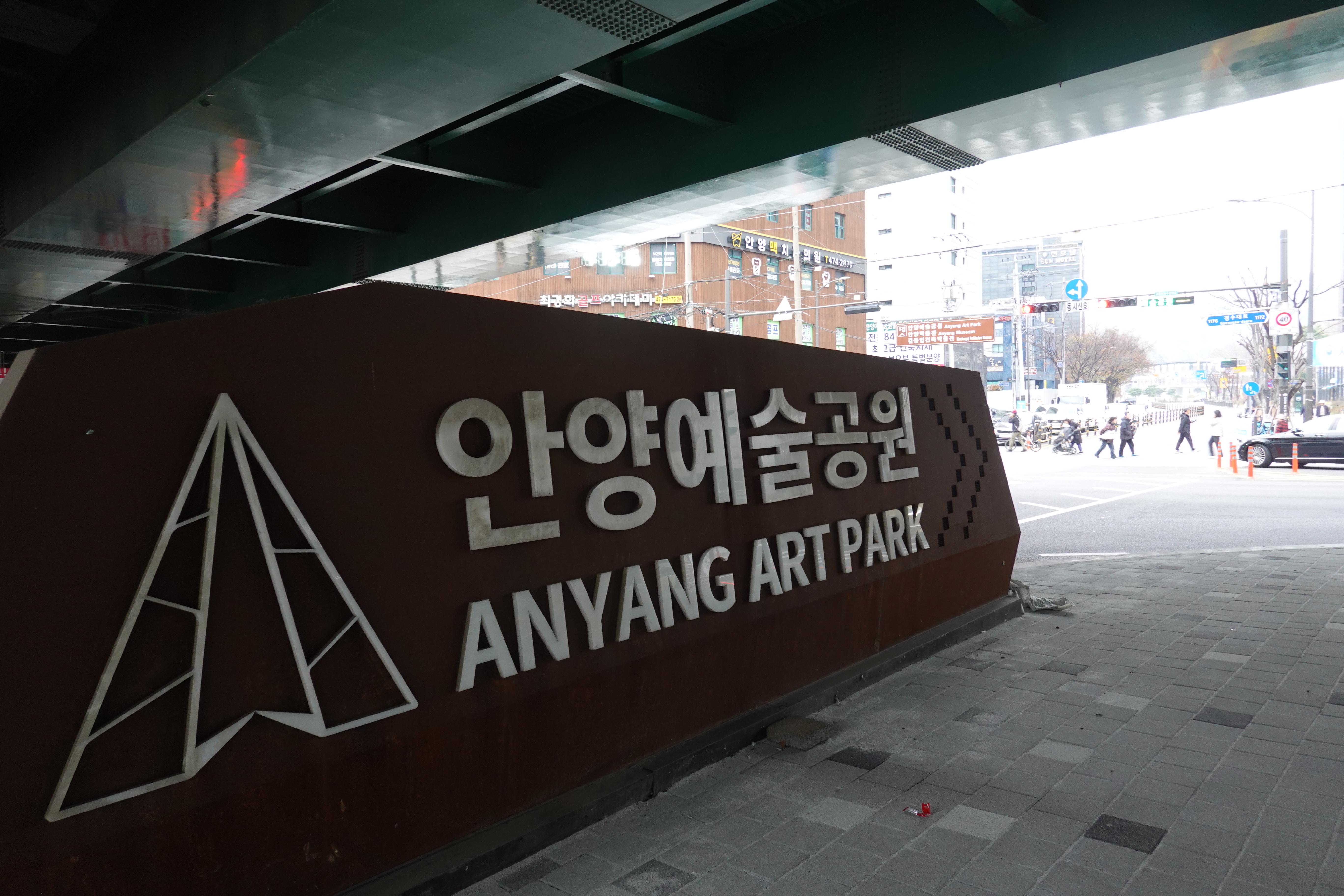 2023.11.15/ #도시기록 #안양 #안양예술공원사거리/ 안양예술공원입구 이기에 행정구역상 석수동일것 같지만 안양2동지역이다. 사거리 위를 경수산업도로 고가차도가 지나간다. 10여년 전부터 안양예술공원 입구 주변의 상권활성화와 도시미관, 미세먼지, 소음, 주거지 분리등으로 인해 철거 요구 민원이 제기됐다. 이에 안양시가 고가차도 철거 타당성조사 용역을 발주한결과 2018년 11월 안양시청에 제출된 용역결과 보고서는 철거공사비 76억원과 경제성, 평면교차로 접속, 우회도로 계획등을 검토할때 철거는 어렵다고 결론냈다.