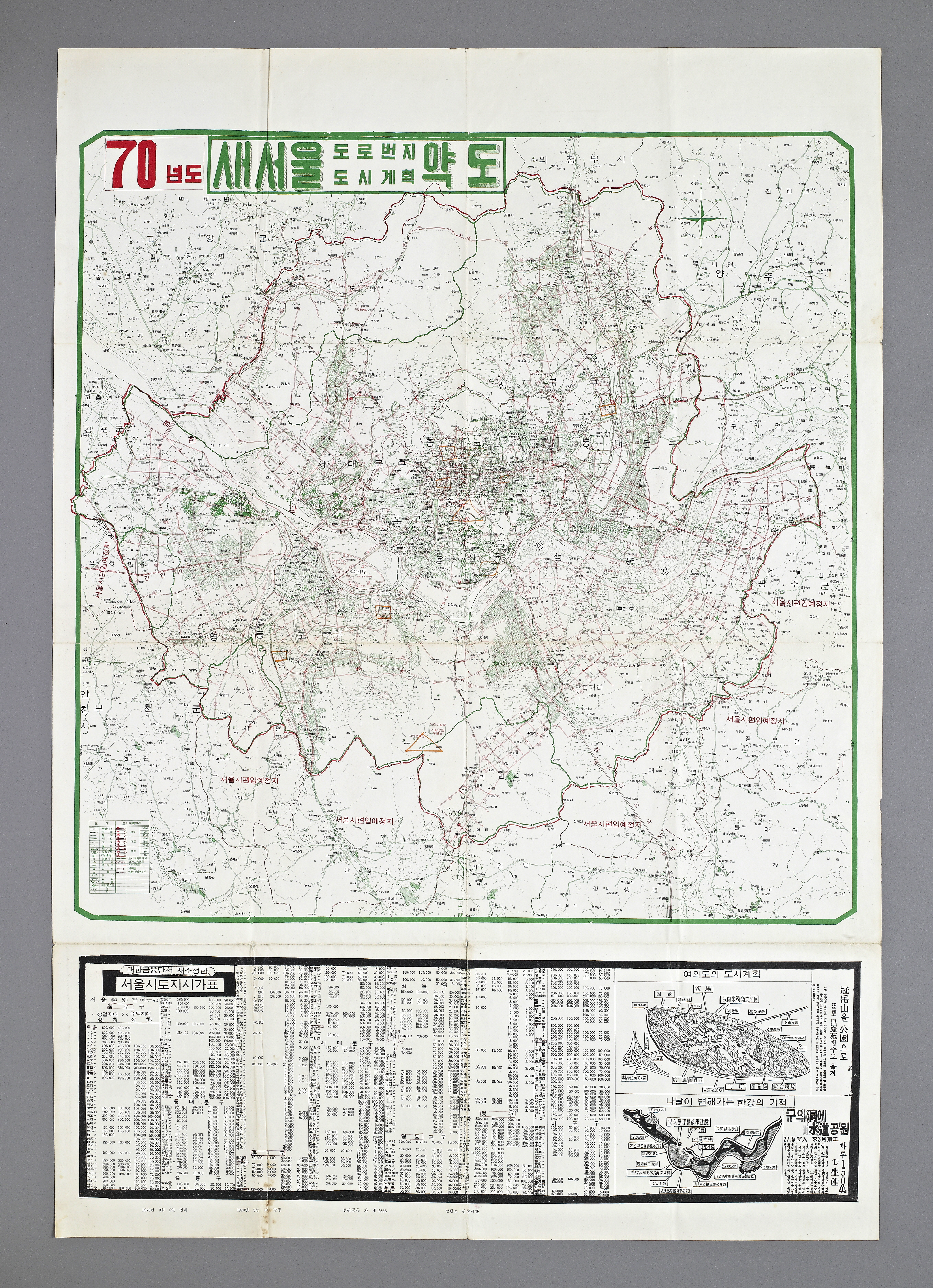 서울역사박물관에 보관된 70년도새서울도로번지도시계획약도.1970년대 필중서관에서 발행한 도시계획도이다. 새로 편입될 지역을 표시하고 있으며 지도 하단에는 서울시 토지가격과 한강개발 관련내용이 삽입되어 있다.