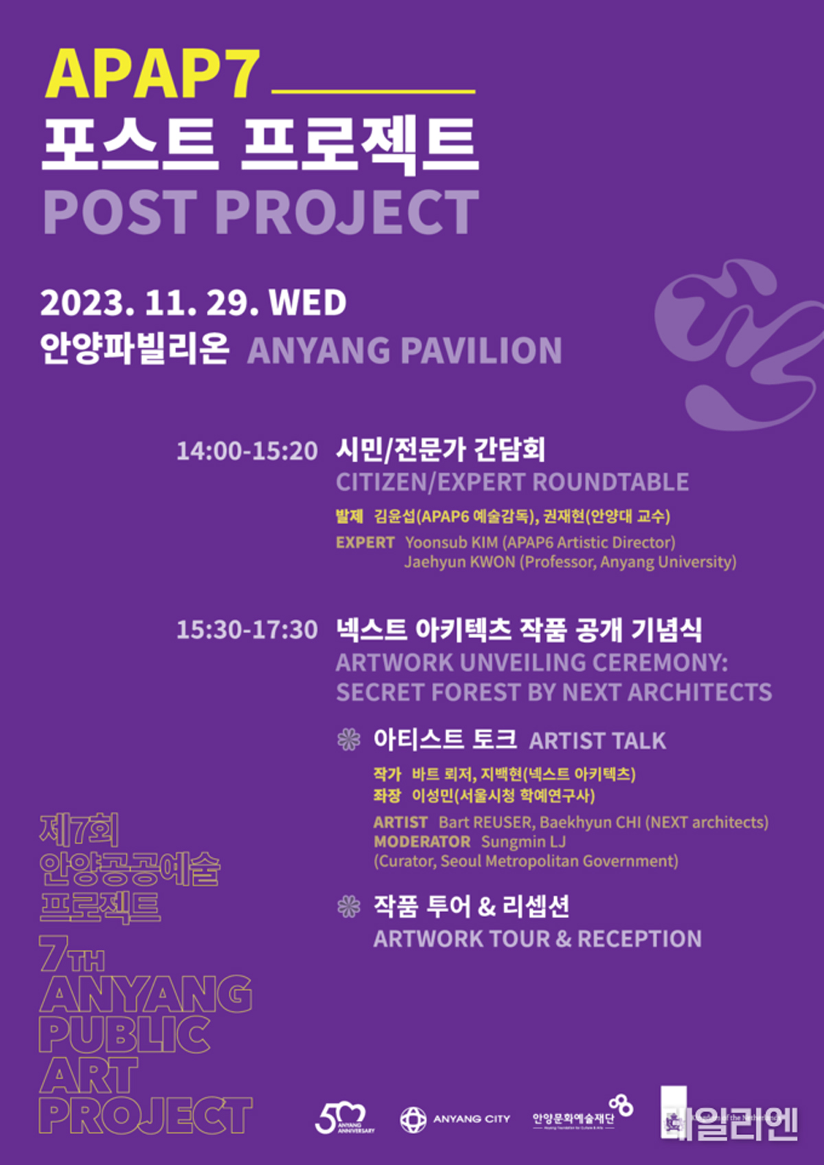 주한네덜란드대사관이 후원한 이날 ‘포스트 프로젝트’는 2022년부터 안양 시민과 함께한 ‘프레 프로젝트’, 그리고 지난 8월 야외 및 실내 전시가 이뤄진 ‘메인 프로젝트’에 이어 진행되는 사후 프로젝트로서, 지난 2년 동안 진행한 APAP7의 성과를 공유하고 향후 발전 방안에 대해 논의하는 ▲시민/전문가 사후 간담회와 APAP7 마지막 출품작인 ▲넥스트 아키텍츠 작품 공개 기념식에 이어 작품이 설치되고 있는 현장을 돌아보고 리셉션을 갖는 순서로 진행됐다.