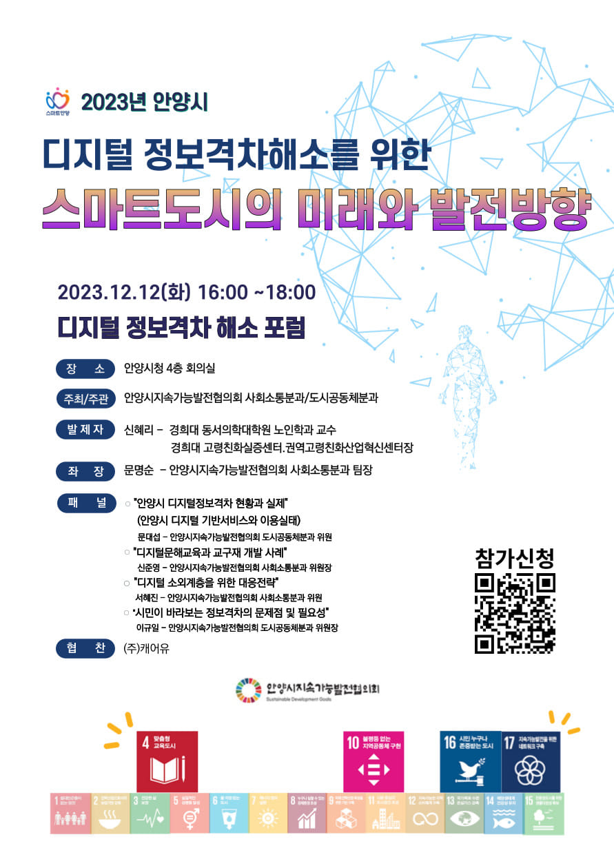 안양지속협 사회소통분과와 도시공동체분과에서 공동 주관하고 (주)캐어유 협찬으로 열리는 이날 포럼은 "스마트도시의 미래와 발전방향"이라는 주제로 국내외의 디지털격차해소를 위한 사례와 안양의 스마트 도시 발전을 위한 토론으로 2시간 동안 진행된다.
