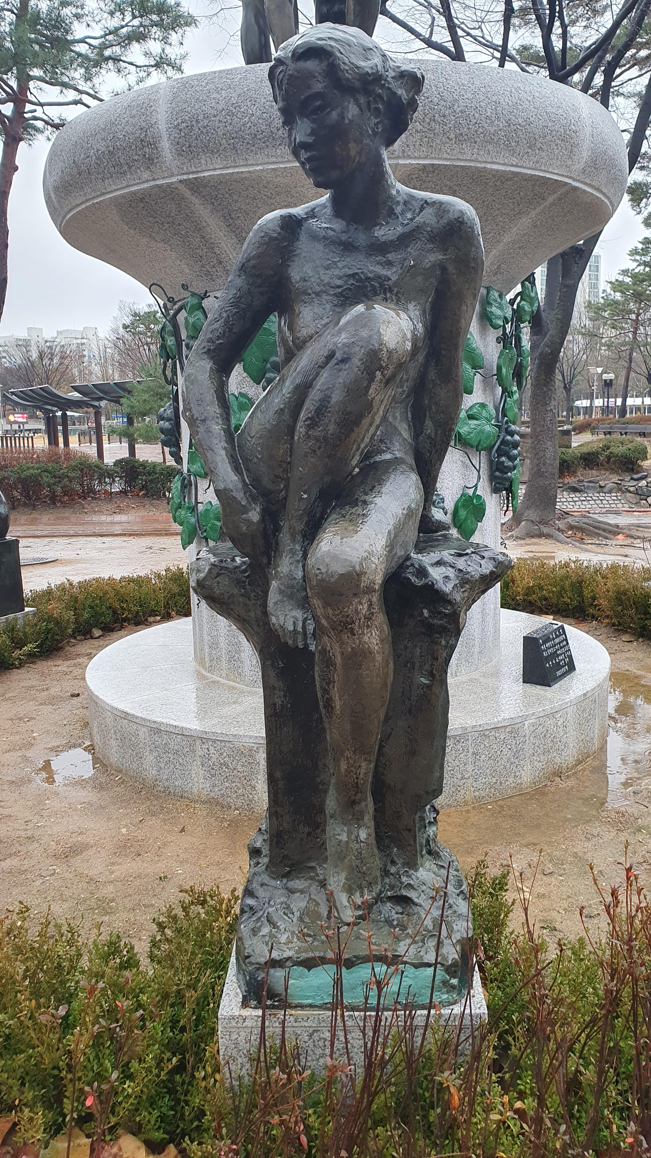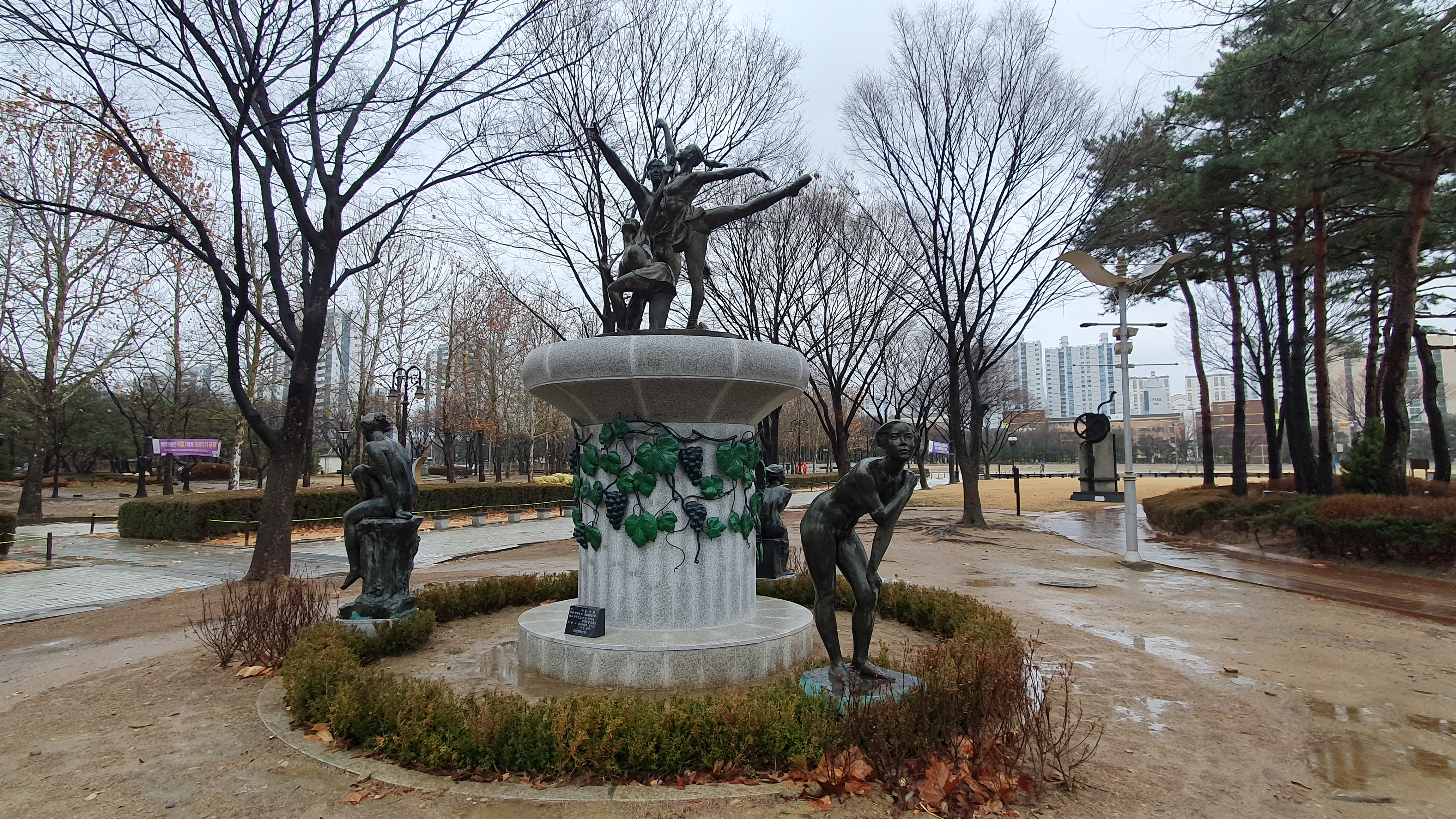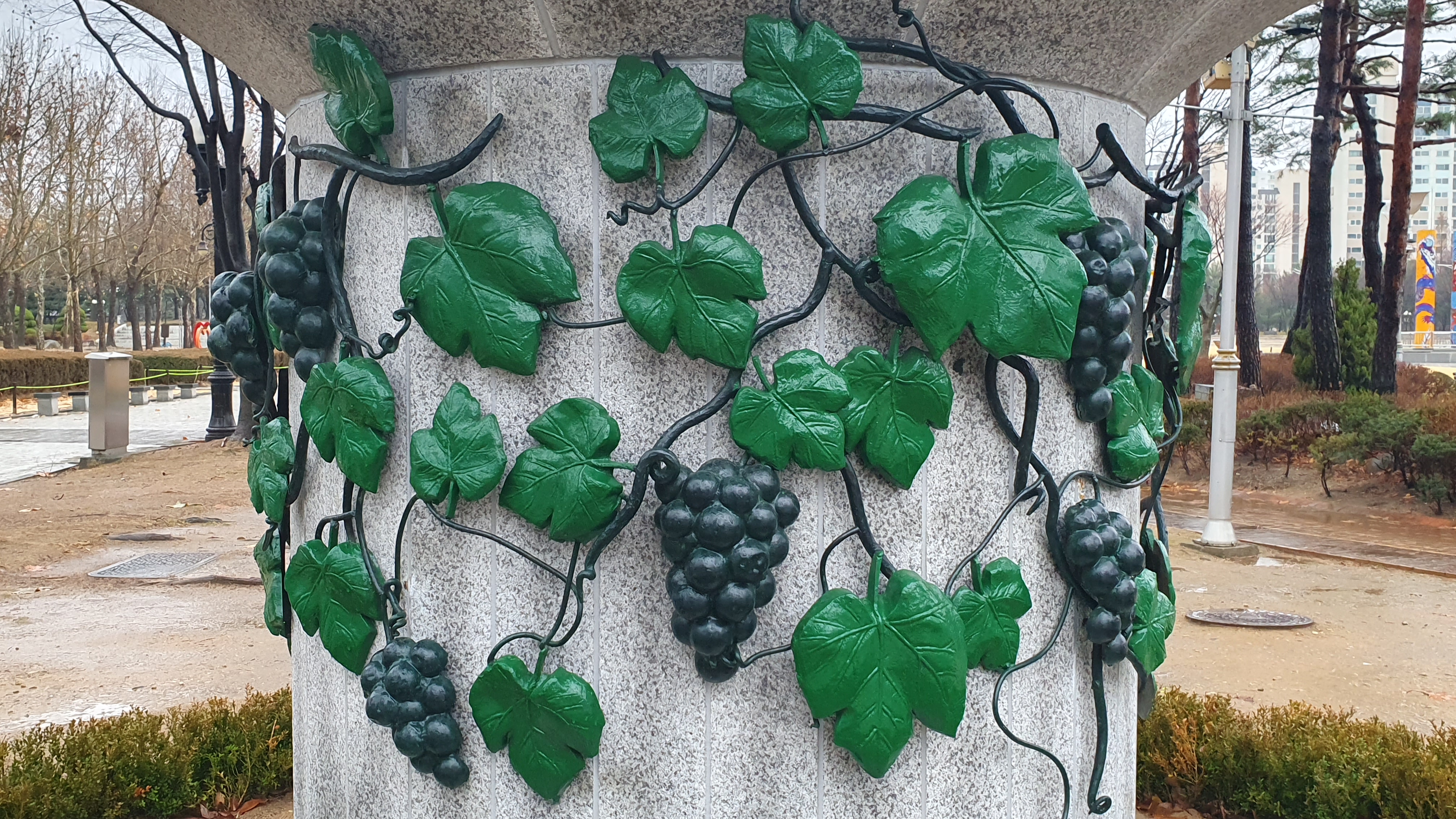 2023.12.15/ #도시기록 #미술작품 #안양 #평촌중앙공원 #홍사영/ 안양 평촌중앙공원 동쪽구역에 처음보는 대형 조형물(공공미술작품)이 생겼다. 2023년 apap7 개막을 앞두고 공사가 한창이기에 안양공공예술프로젝트 영구작품인가 했더니 2009년 작고하신 홍사영 화백(전 안양미술협회 지부장) 작품이다. 작품앞 표지석을 보니 1996년 7월에 제작하여 비산사거리에 이마트앞 교통섬에 설치했던 것인데 월곶-판교 지하철 공사로 인해 평촌중앙공원으로 이전 설치한 것이다. 그런데 작품명이 없다. 새 표지석에 작품명도기록하면 좋았을것을. 포도장식이 있는걸 보니 작품명이 포도와 연관 추정.