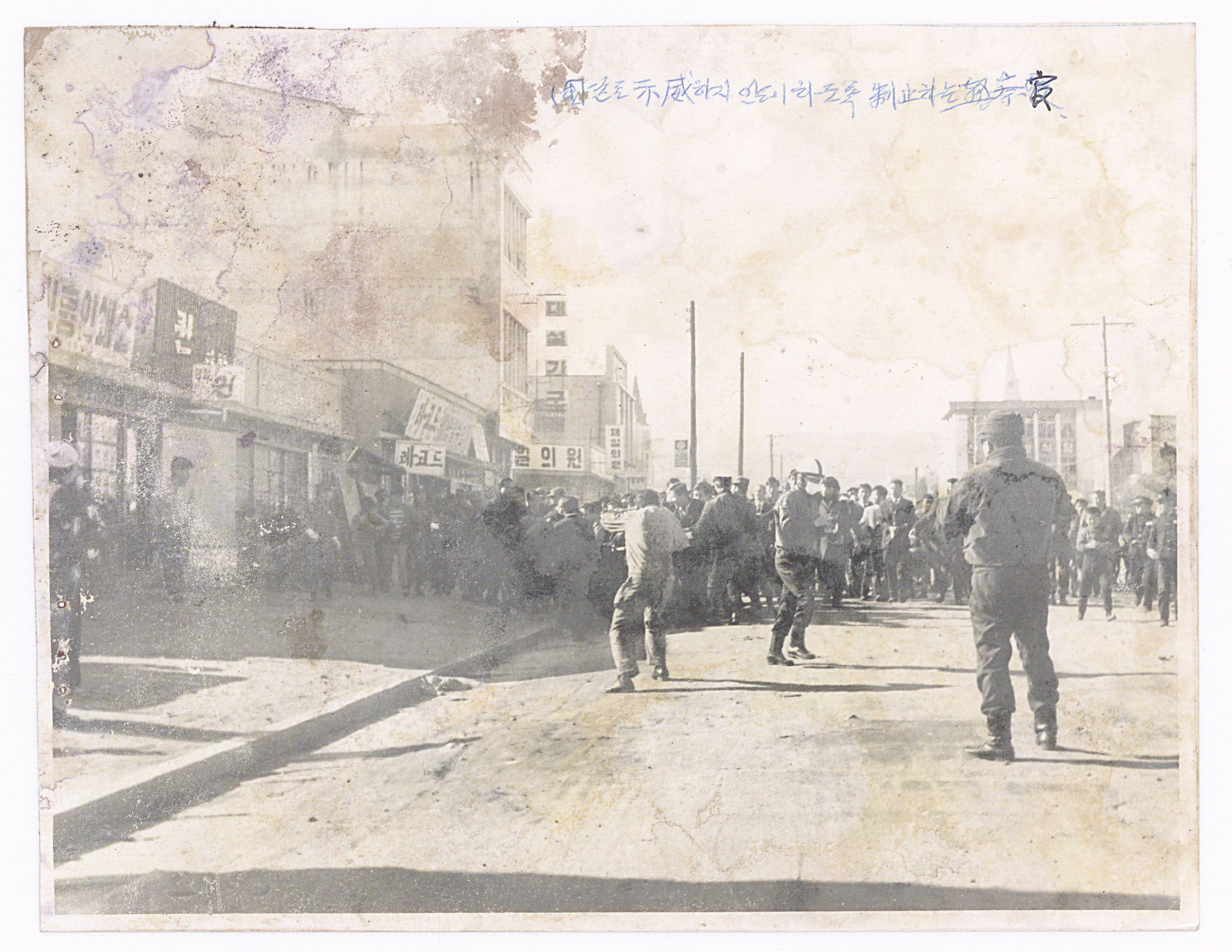 사진 설명으로 안양극장으로 운집하는 읍민으로 기록돼있는데 사진 왼쪽에원앙예식장 간핀이 있는 것을 볼때 안양역 광장으로 몰려드는 읍민들이 맞다.사진 설명에 국도로 시위하지 않도록 제지하는 경찰관이라 적혀있다. 사진 윗쪽이 현 벽산사거리로 위 오른쪽 건물에 예식장과 다방, 도서실, 시흥군문화원이 있었다.(지금도 건물 현존). 사진 왼쪽에는 제일의원이 보인다. 데모대가 운집한 곳은 현 장내로 도로위로 읍민관에서 궐기대회를 하고 나선 읍민들이 1번 국도(만안로) 쯕으로 가려고 몰려들고 있다, 사진 왼쪽에는 신도예식장, 오른쪽으로는 시흥군청이 있었다.사진 설명에 군청으로 몰려드는 데모대 읍민이라 적혀있다.사진 설명에는 거리로 행진하는 데모대라 적혀있다. 사진 우측에 문화예식장 건물이 보이는걸 볼때 사진 왼쪽이 읍민관이고 오른쯕으로 시흥군청과 읍사무소, 경찰서 가는길 중간의 흙바닥 광장이다.(현 중앙로)당시에는 도로가 개통되기 이전의 공터로 각종 행사와 집회들이 개최되던 곳이다.사진 설명으로 경찰서장이 플랜카드를 뺏고 있다고 적혀있다.사진속 배경은 원앙에식장앞으로 경찰이 국도에서 시위하는 것을 제지하는 모습이 담겨져 있다..사진 중앙에 보이는 뾰족 종탑이 있는 고딕식 형태의 성당이 당시 장내동성당(현 중앙성당)이다. 군중이 운집한 곳이 현 벽산사거리다. 왼쪽에 고려석면 안양공장(현 2001아을렛)이 보이고, 오른쪽에는 예식장, 다방, 도서관, 시흥군문화원이 있던 건물(현존)이 보인다. 당시에는 중앙로 도로가 개통되기 이전으로 시흥군청(현 삼원프라자호텔) 및 읍민관(현 안양빌딩.1층 다이소) 연결되는 이곳에서는 광복절 행사, LAL기납북규탄집회, 궐기대회 등 다양한 군중 집회와 행사들이 열렸다.