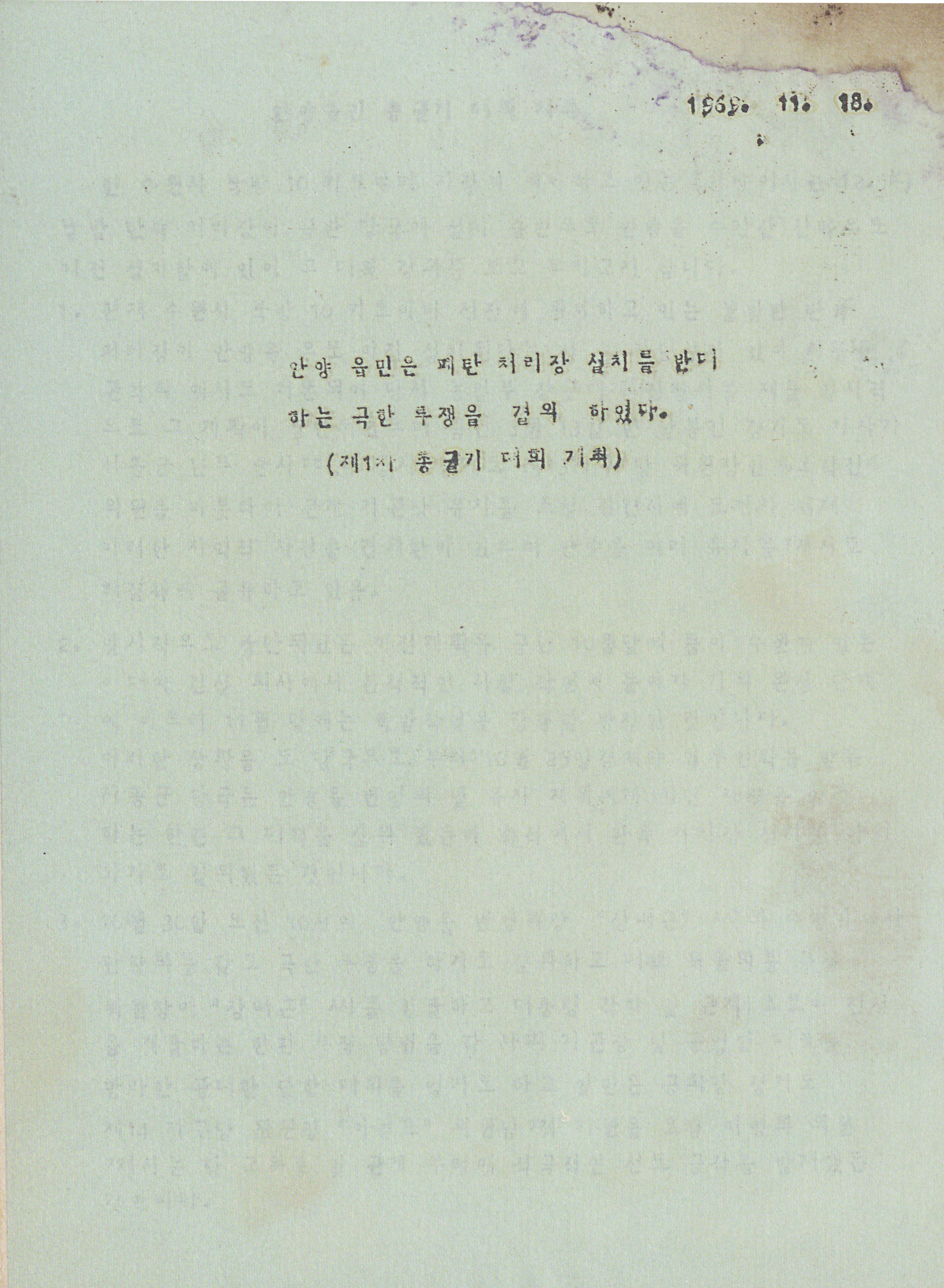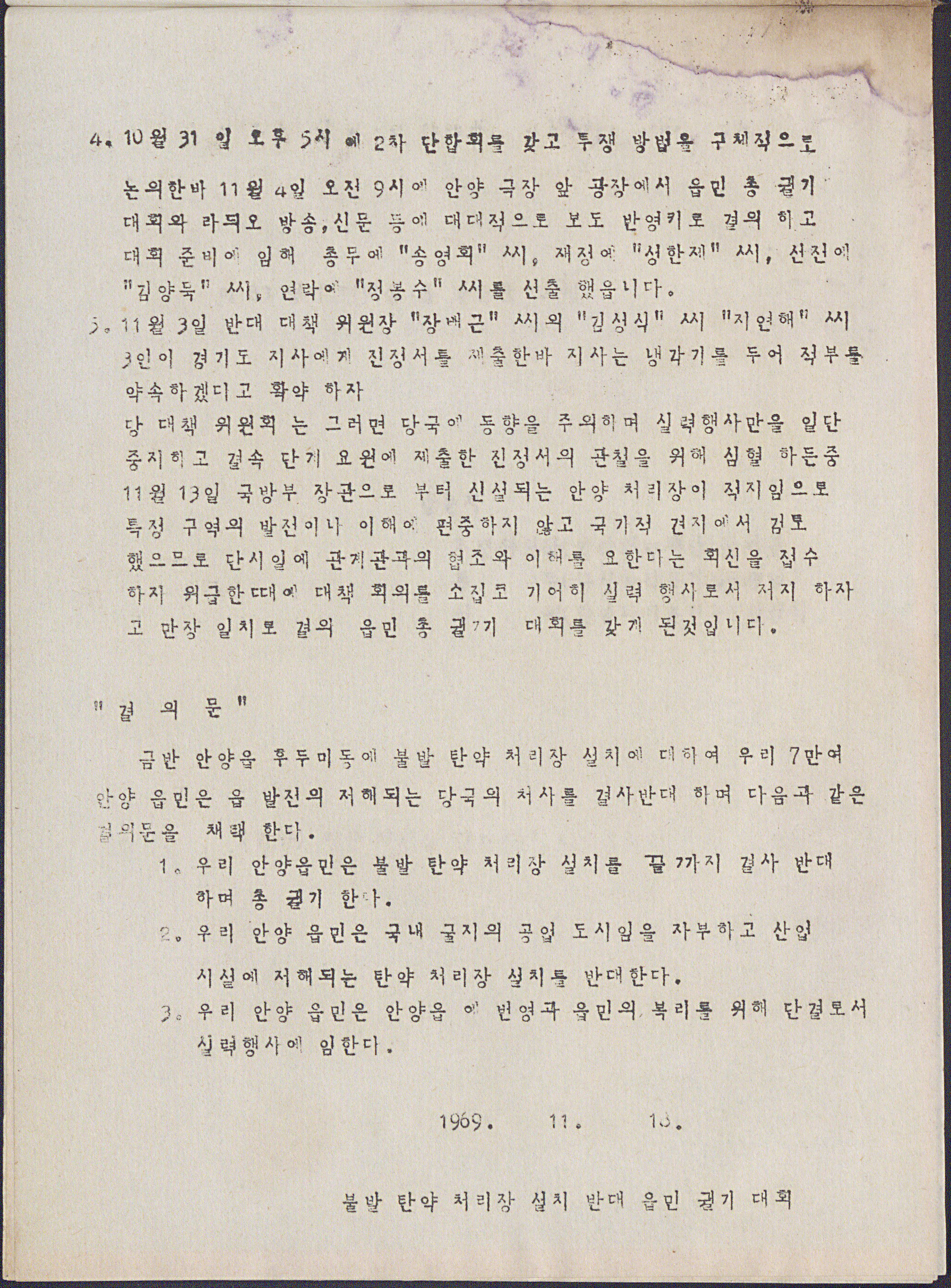 또 사진과 함께 관련 문건도 확인했다. 당시 시흥군청 또는 경찰에서 작성한것으로 보이는 문건에는 1969년 11월 18일 안양읍민이 폐탄 처리장 설치를 반대하는 극한 투쟁을 결의한내용을 담고있다. 제1차 총궐기 대회 개최 제목의 문건은 대책 경과 보고이다. 결의문 내용을 확인할 수 있다.