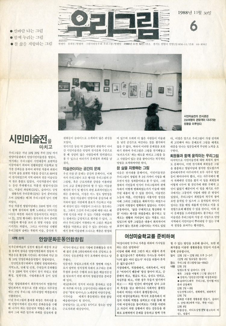 그림사랑 동우회 '우리그림' 에서 발행했던 소식지 제6호 자료다. 이 자료는 그림사랑동우회 우리그림에서 활동한 이억배 작가가 수집해 보관해왔던 기록물로 지난 2019년, 경기문화재단이 주최한 '시점時點·시점視點-1980년대 소집단 미술운동 아카이브전'을 통해 시민들에게 소개됐으며 현재는 경기도 메모리에 저장돼 있다.