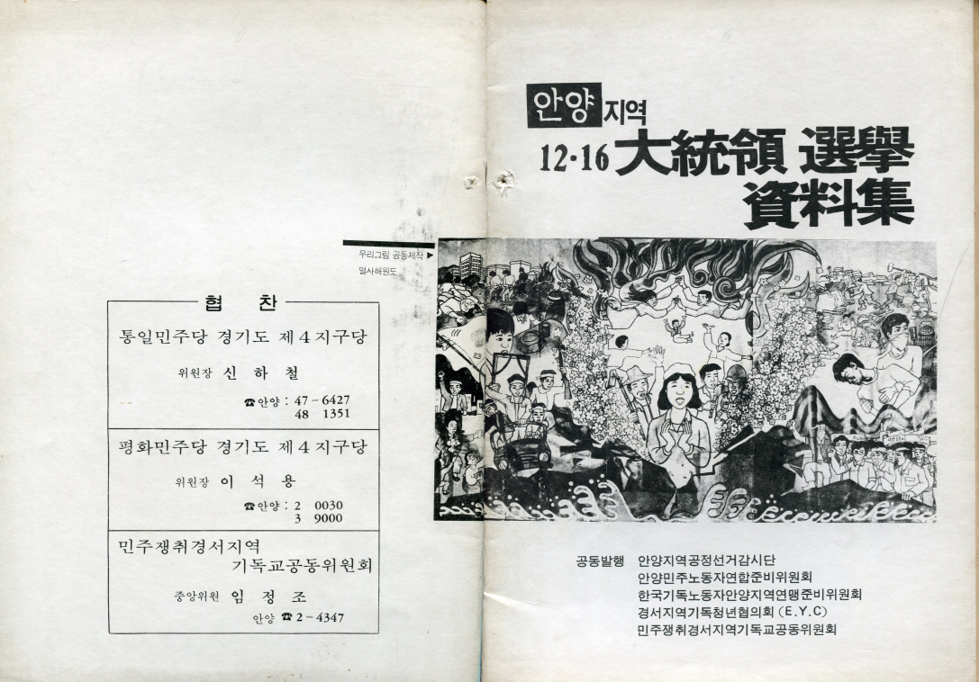 1987년 12.16 대통령선거 부정선거에 대해 규탄하는 내용을 담고 있는 안양지역 자료집으로 안양지역공정선거감시단,안양민주노동자연합준비위원회, 한국기독노동자안양지역연맹준비워원회, 경서지역기독청년협의회(EYC), 민주쟁튀경서지역기독공동위원회에서 공동발행했다.