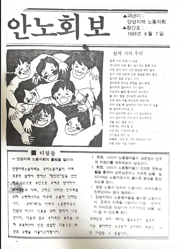 안양지역노동자회에서 발행한 안노회보 창간호(1988,08,07일자) 표지로 이 기록물은 안양군포의왕지역에서 민주화운동을 해왔던 정성희 소통과혁신연구소장(안양노동자회 초대회장)이 보관해 왔던 자료다.