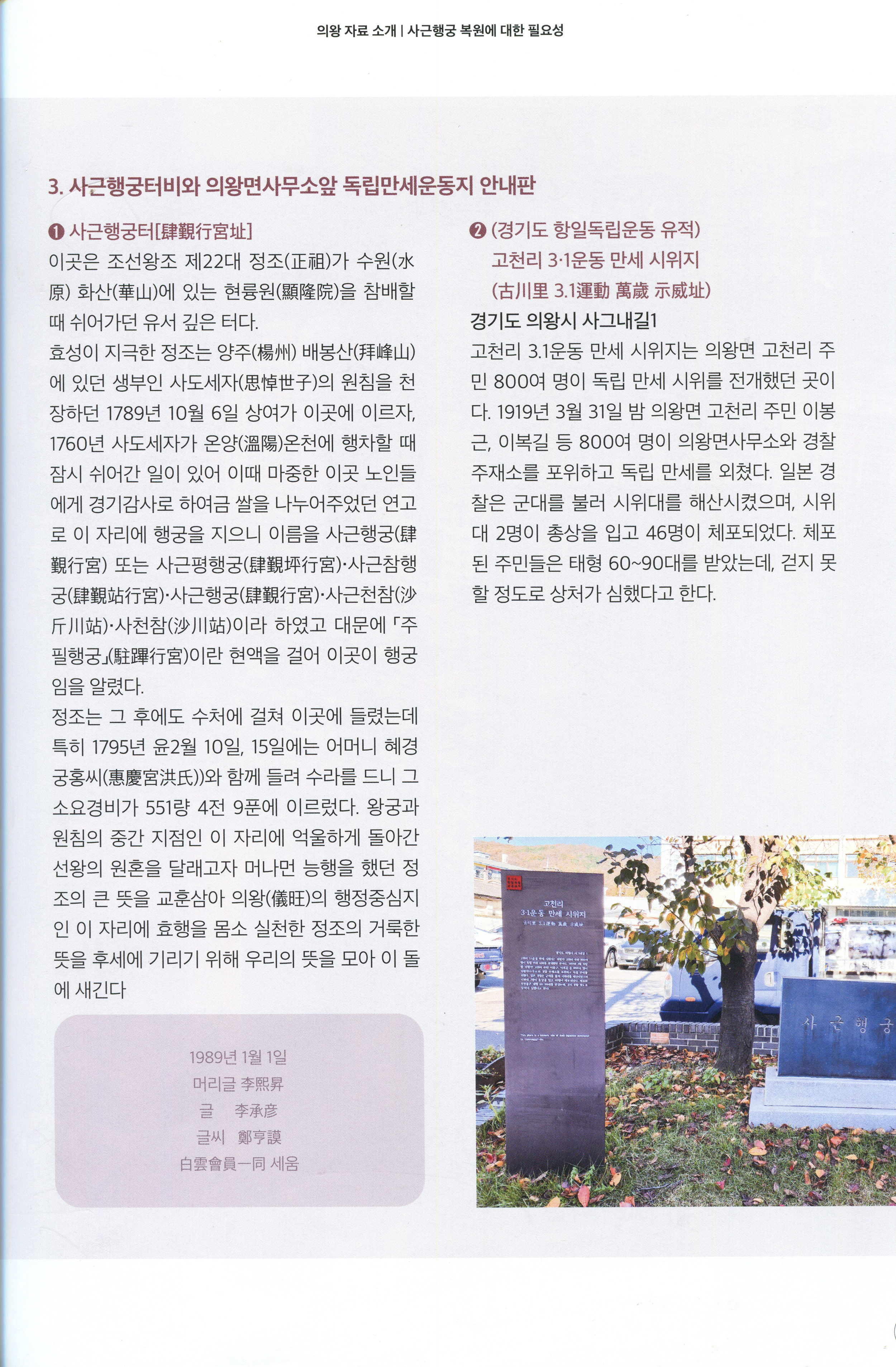 정조의 효와 애민사상 및 국가 수호 정신은 물론 나라의 독립을 위한 의왕시민의 3.1정신을 계승하고 문화유산을 길이 후손에게 남겨줄 수 있기를 간절히 바랍니다