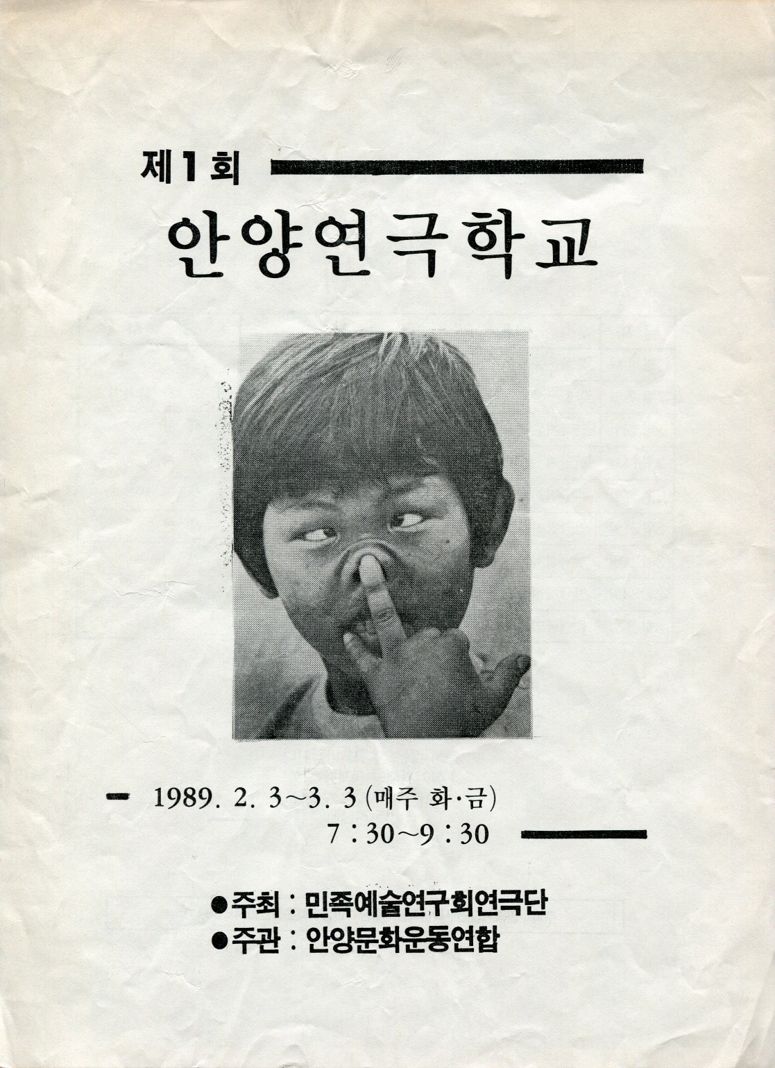 2024.01.26/ #아카이브 #유인물 #안양문화운동연합 #since1989/ 민족예술연국연구히에서 주최하고 안양문화예술운동연합에서 주관하여 1989년 2월에 개최된 제1회 안양연극학교를 홍보하는 유인물이다. 이억배 작가가 교장으로 있었으며 엄인희, 김석만, 조성연이 강사로 활동하였다.