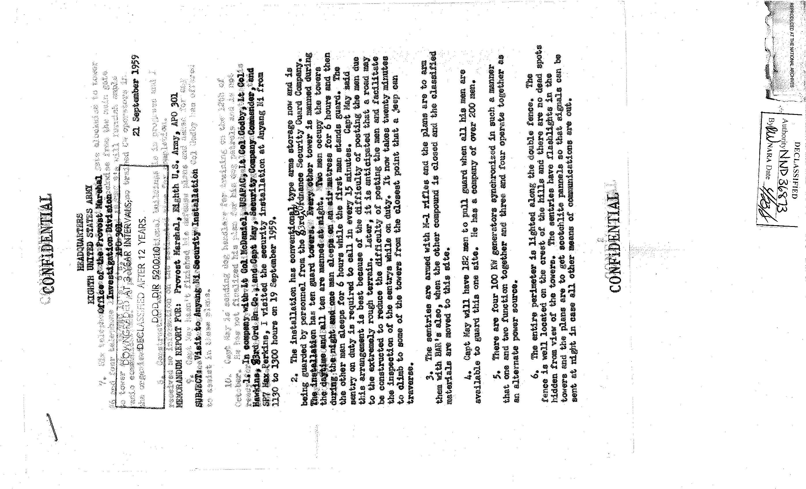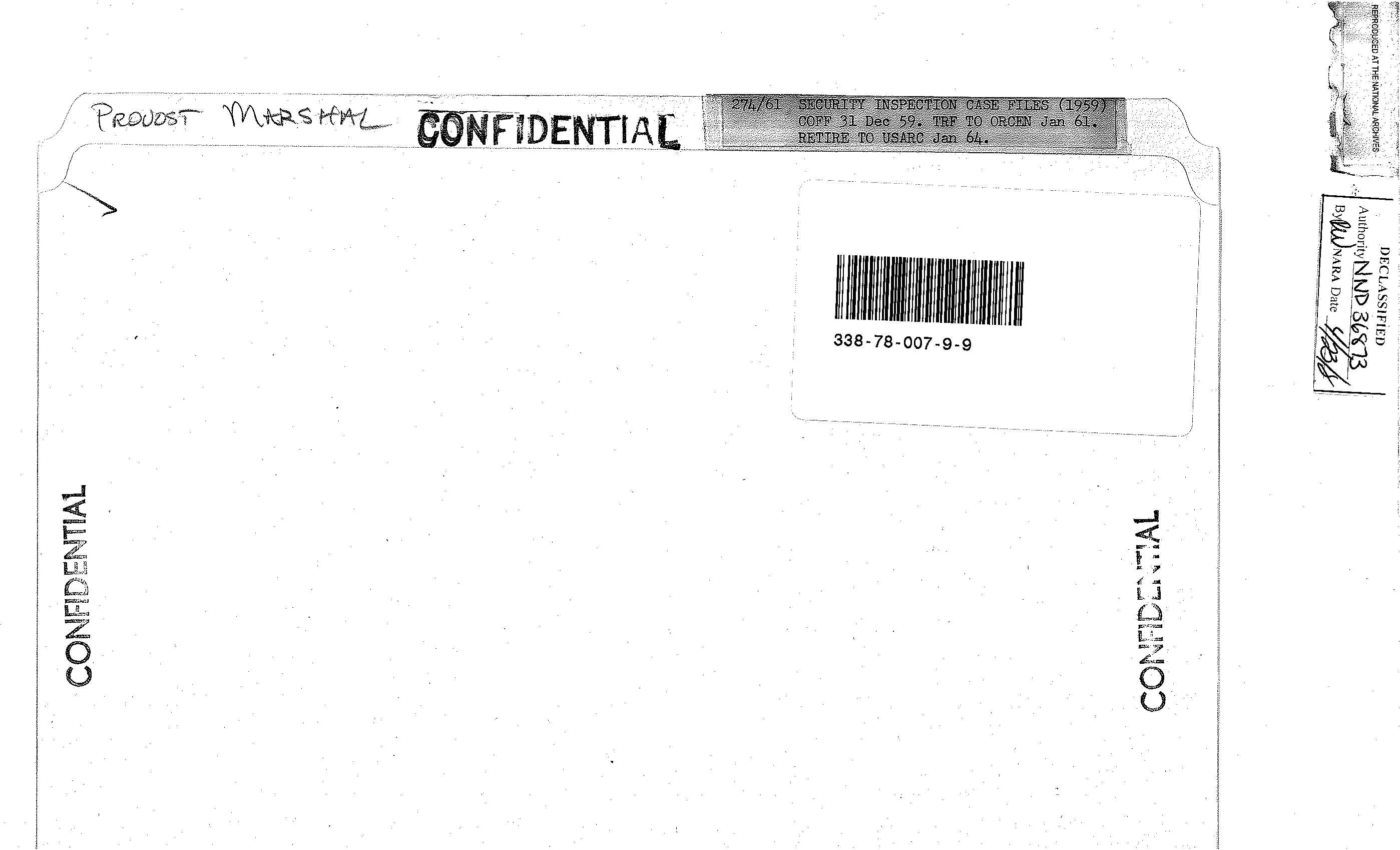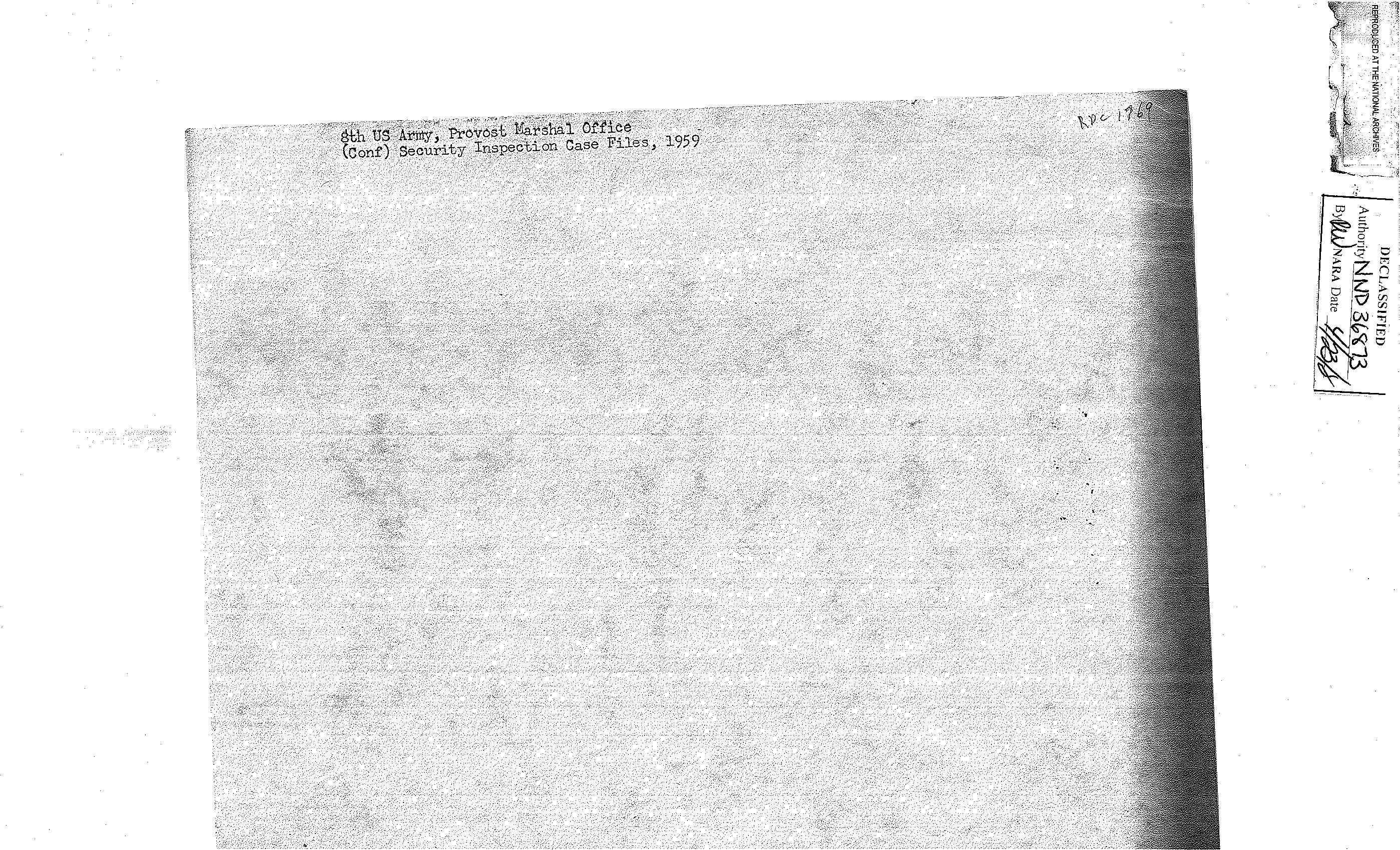 이 사료철은 헌병사령부(Office of the Provost Marshal) 보안 감사 사례 파일이다. 안양의 83병기대대(83rd Bt Ordnance) 방문과 보안 시설에 대한 감사 보고가 들어있다. 이 부대는 특수탄약을 관리하던 부대로, 탄약 벙커에 있던 전술 핵탄두와 로켓을 관리, 운용했다. 캠프 페이지(Camp Page)와 캠프 카이저(Camp Kaiser) MSA의 물리적 보안 상태, SASP-20의 물리적 보안(Physical Security) 상태에 관한 보고서 등이 들어 있다. 춘천의 캠프 페이지는 제4미사일사령부가 주둔했고, 핵무기가 배치되었던 곳이다.