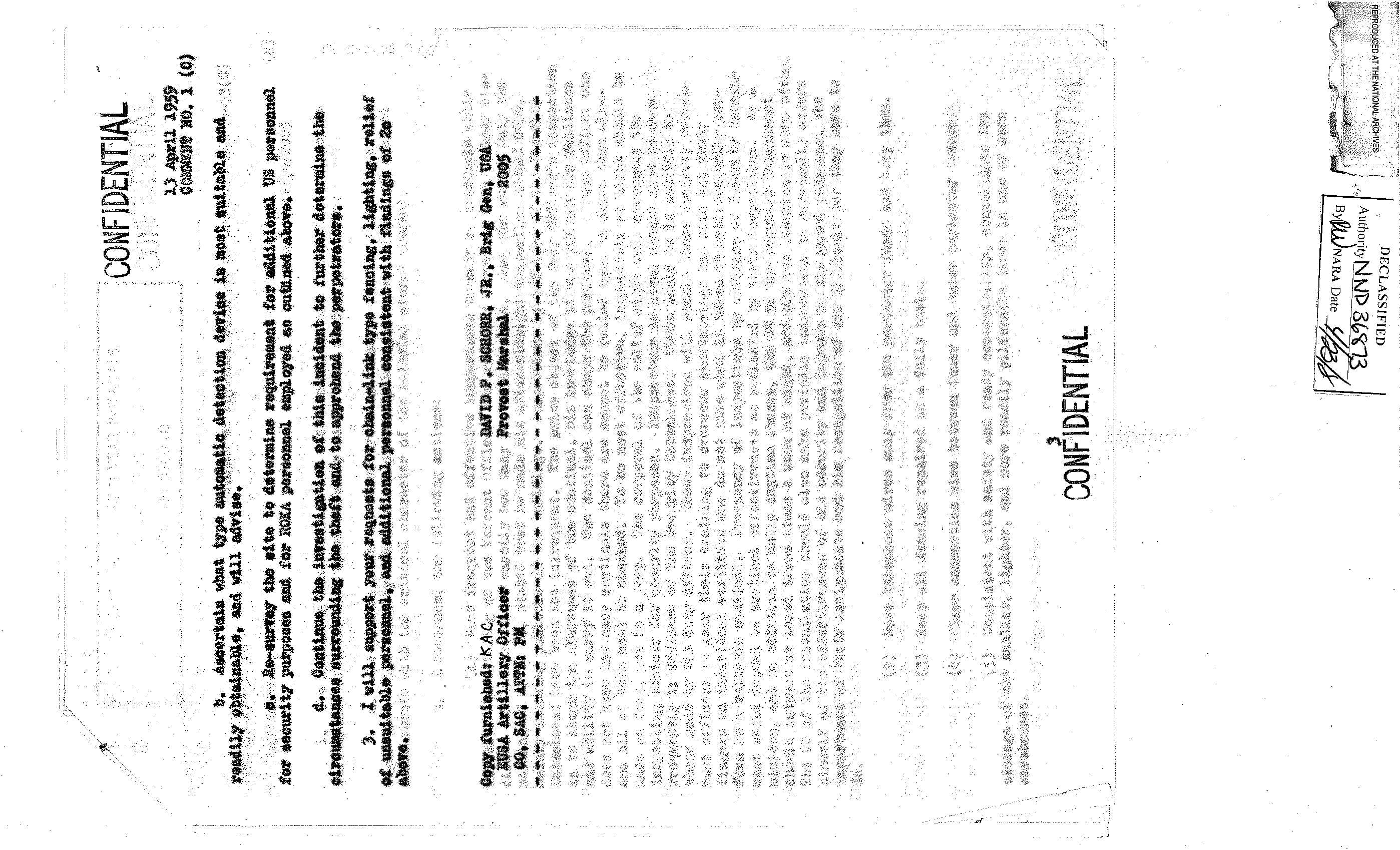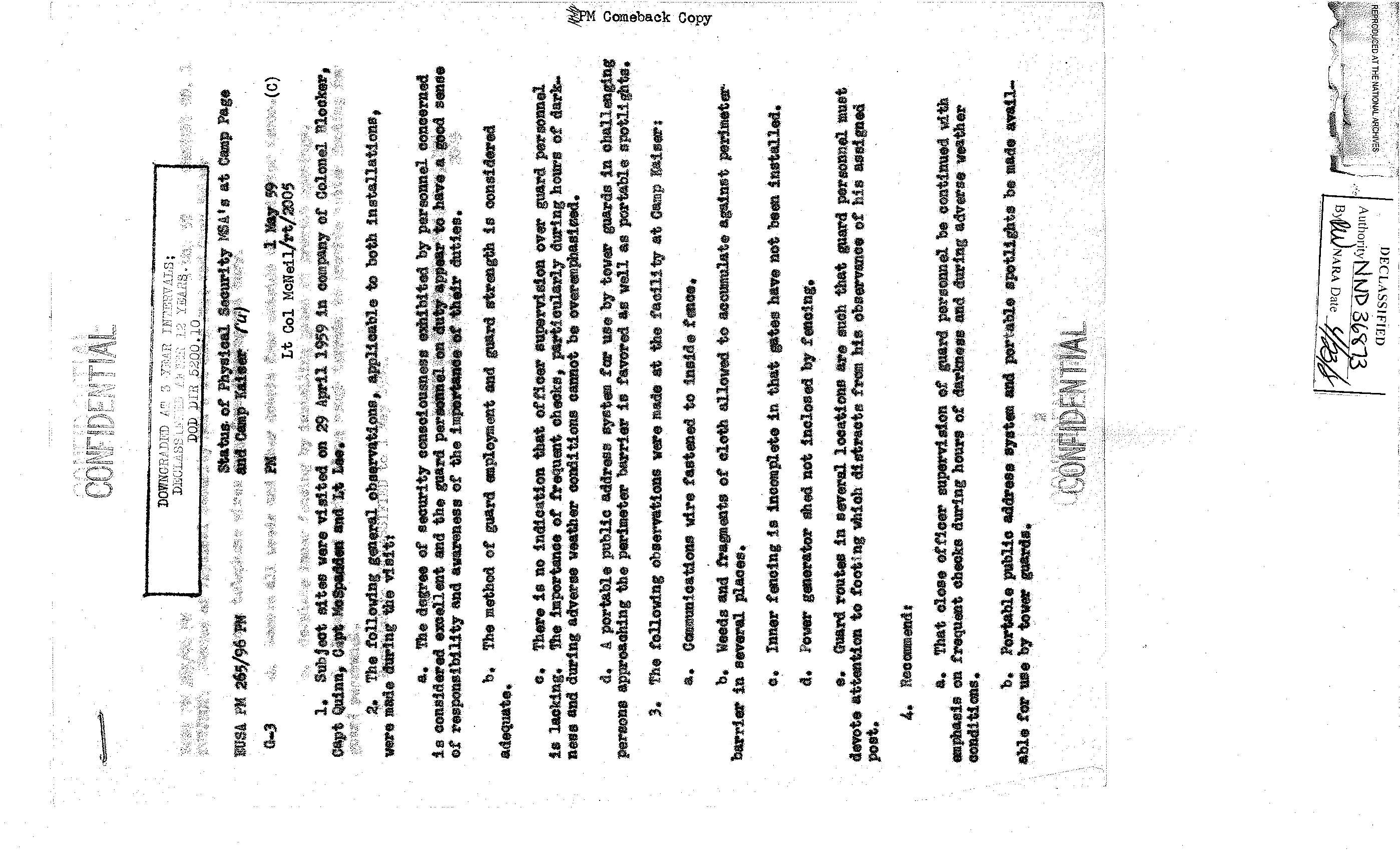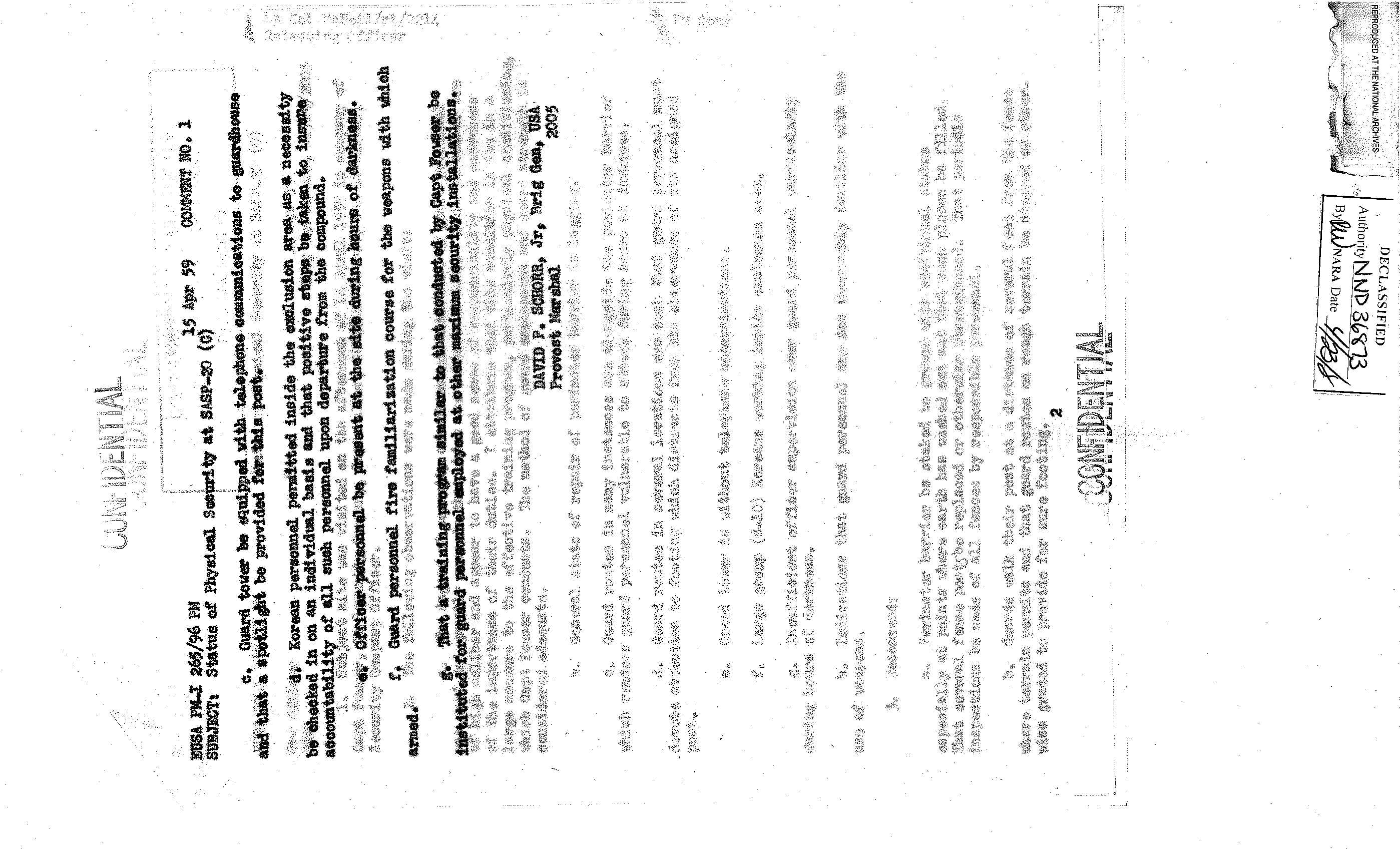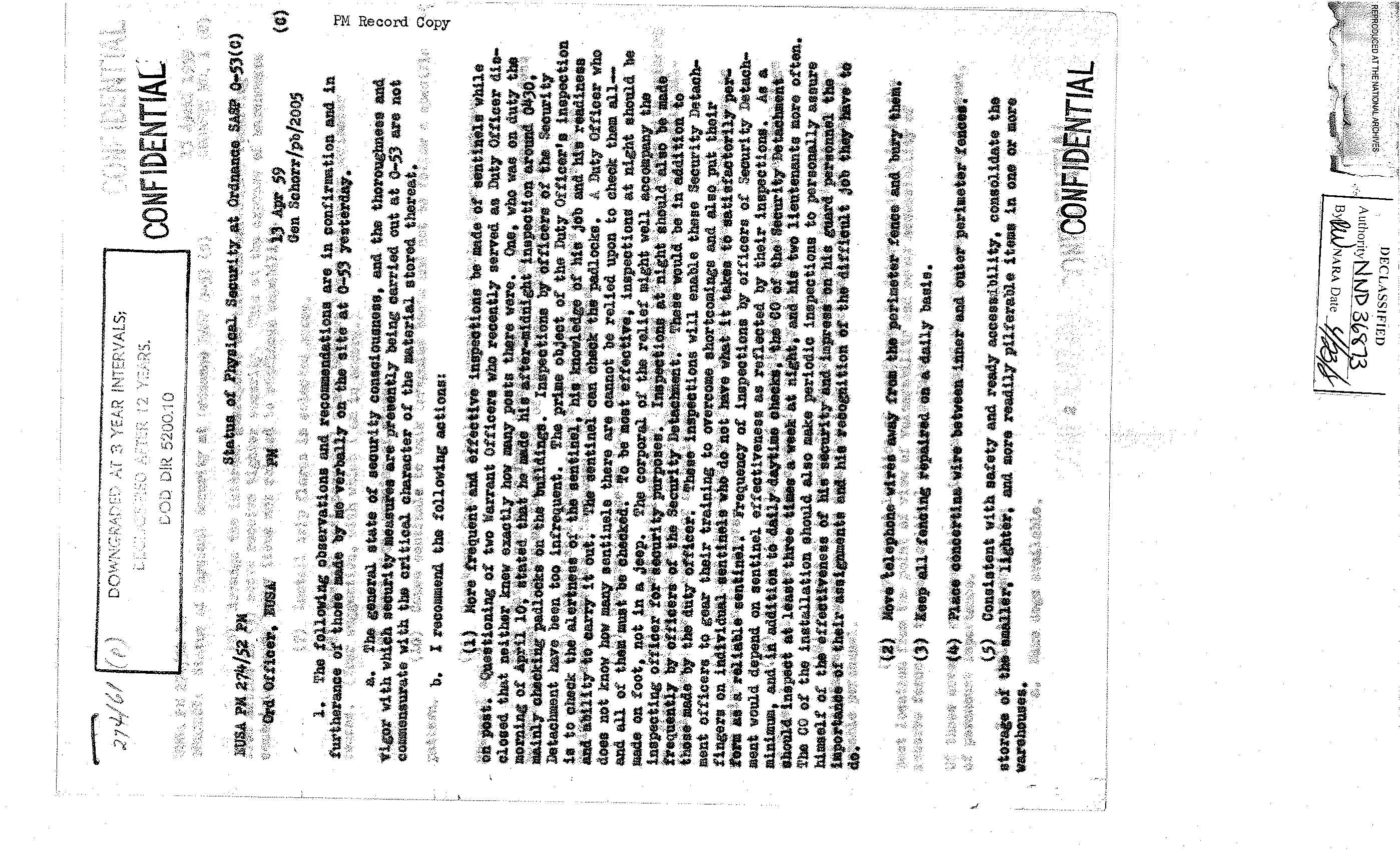 이 사료철은 헌병사령부(Office of the Provost Marshal) 보안 감사 사례 파일이다. 안양의 83병기대대(83rd Bt Ordnance) 방문과 보안 시설에 대한 감사 보고가 들어있다. 이 부대는 특수탄약을 관리하던 부대로, 탄약 벙커에 있던 전술 핵탄두와 로켓을 관리, 운용했다. 캠프 페이지(Camp Page)와 캠프 카이저(Camp Kaiser) MSA의 물리적 보안 상태, SASP-20의 물리적 보안(Physical Security) 상태에 관한 보고서 등이 들어 있다. 춘천의 캠프 페이지는 제4미사일사령부가 주둔했고, 핵무기가 배치되었던 곳이다.