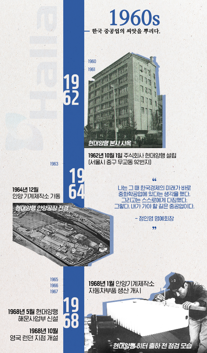 정인영 명예회장은 외국에 나갈 기회가 있을 때마다 국제사회의 기계공업 추세를 탐색합니다. 자동차 산업과 중공업이 미래 산업을 이끌게 될 것이라는 것을 알았습니다. 그는 지금이 기계공업을 시작할 적기임을 직감하게 됩니다. 기회는 생각보다 빨리 찾아왔습니다.