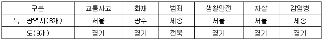 시 지역에서는 충남 계룡이 4개 분야(화재·범죄·자살·감염병)에서, 경기 과천·의왕(생활안전·자살·감염병), 구리(교통사고·생활안전·감염병), 군포(교통사고·화재·생활안전), 하남(화재·자살·감염병), 용인(교통사고·자살·감염병)은 3개 분야에서 각각 1등급을 달성했다.