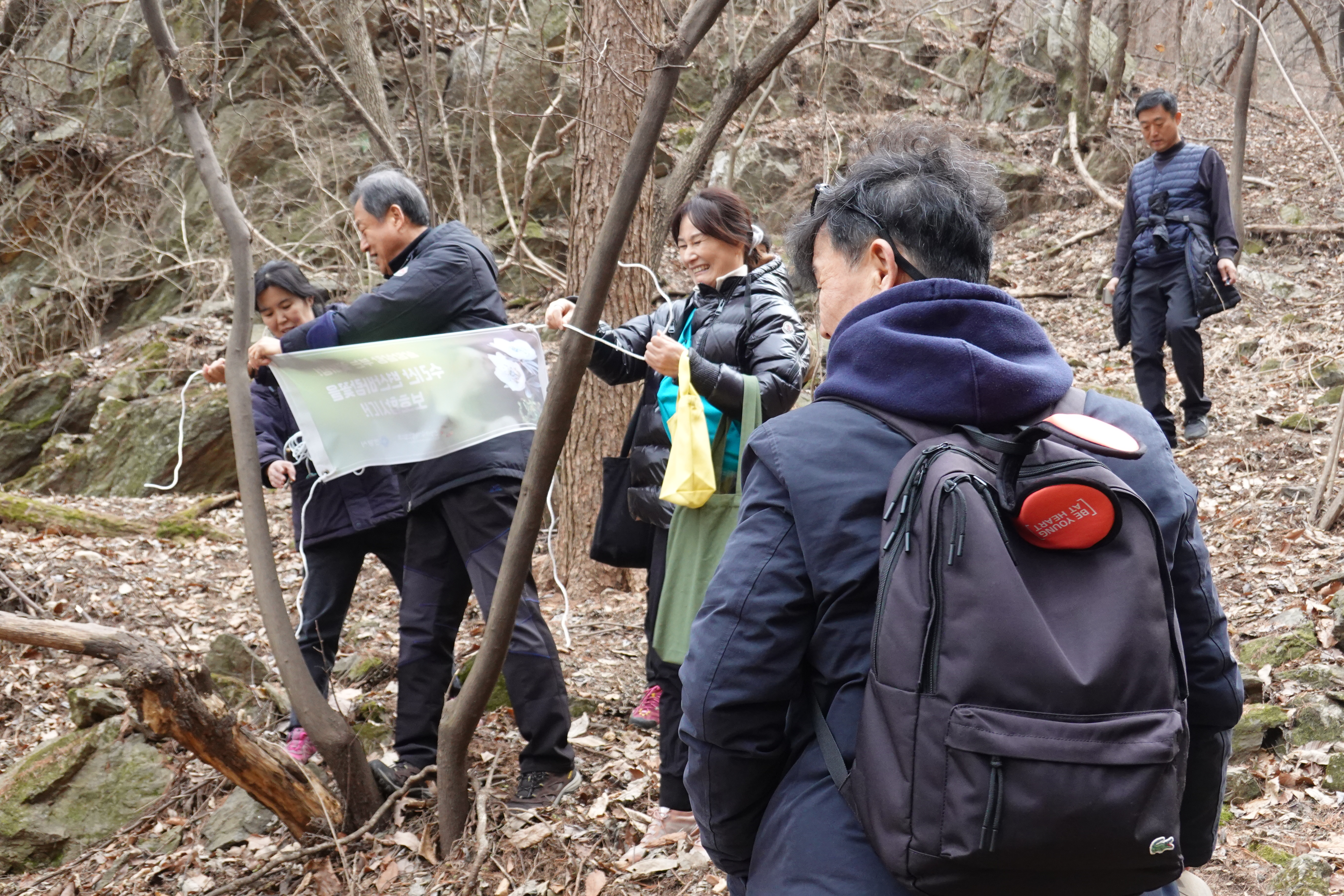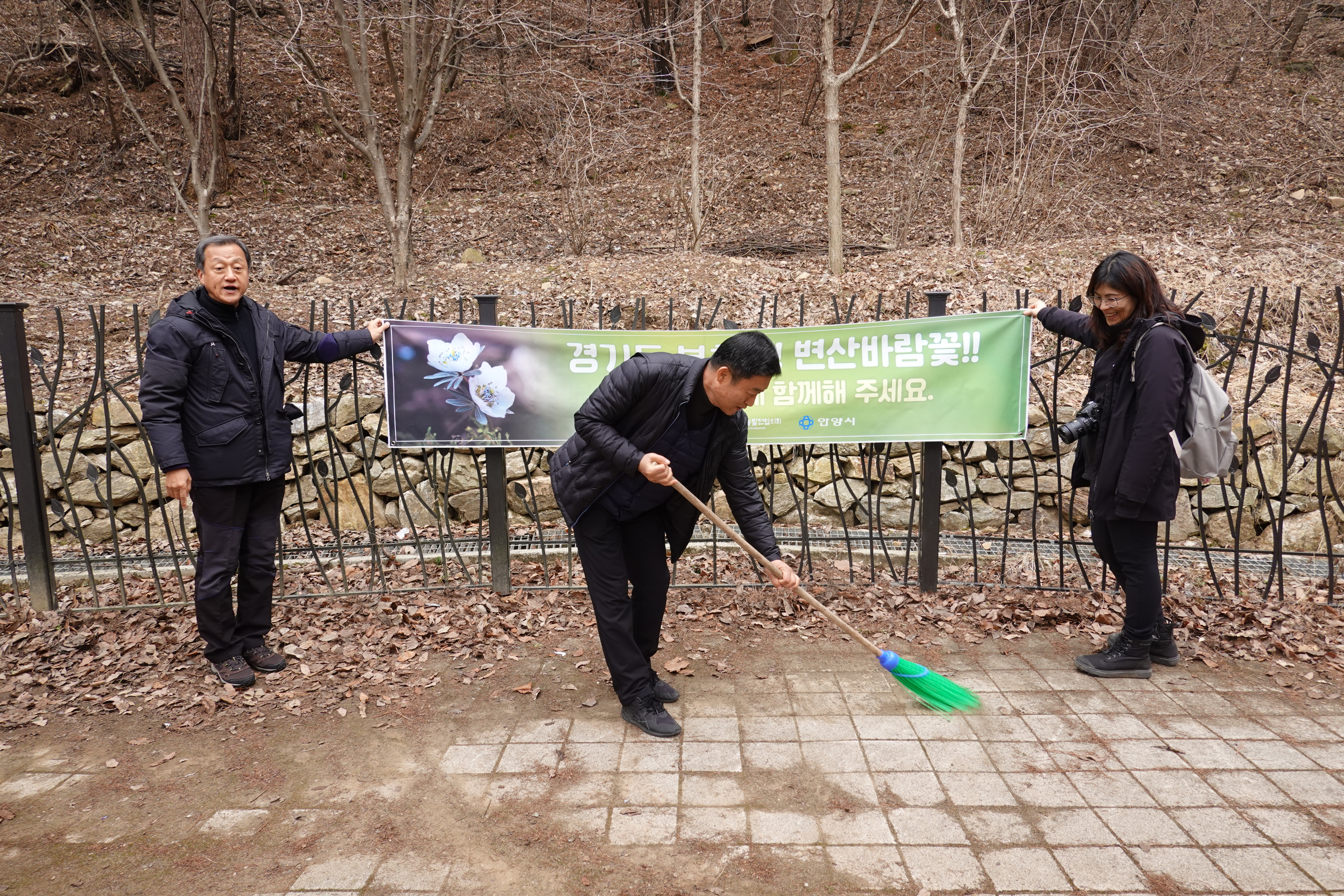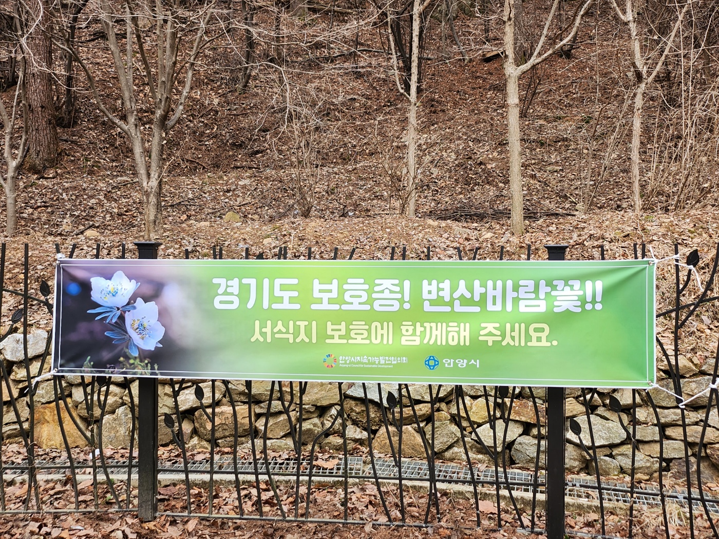 금년에는 안양지속협 생태전환위원회(위원장 정종호) 주관으로 15명의 위원들이 지난 11일 “경기도보호종! 변산바람꽃 ! 서식지 보호에 함께 해주세요" 현수막을 부착하고 서식지 주변 쓰레기도 줍는 등 정화활동도 전개했다.