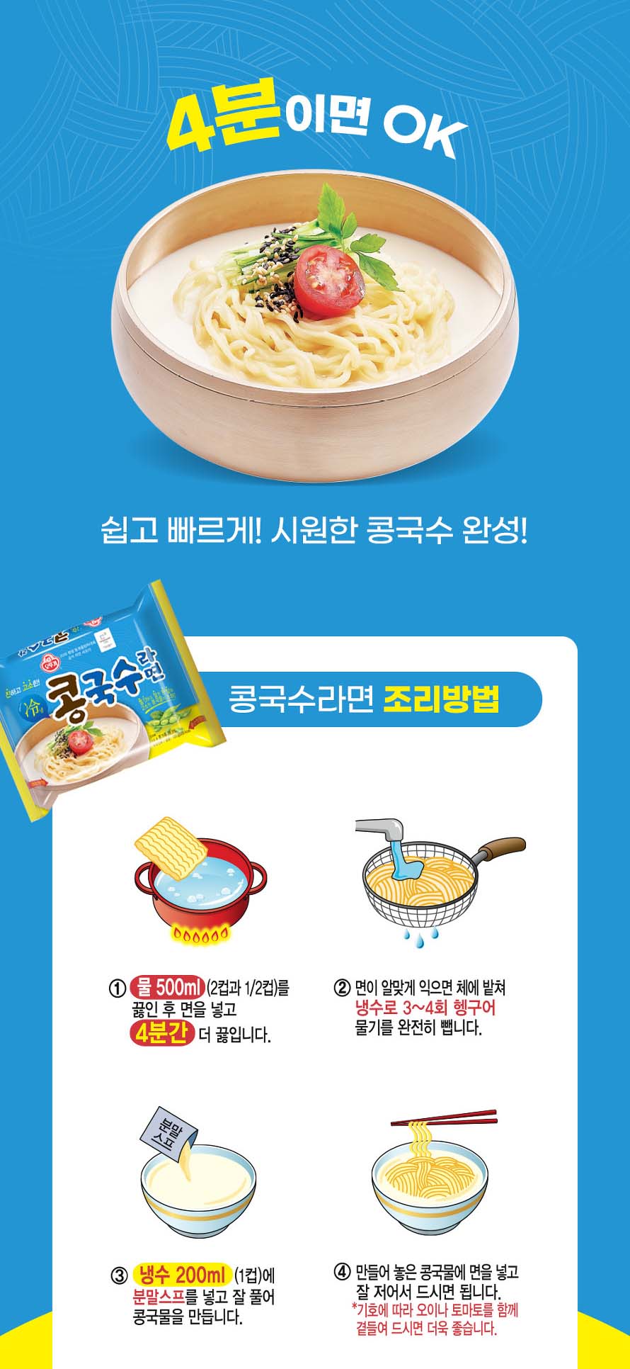 한편 오뚜기 콩국수라면은 여름철 대표적 음식인 콩국수의 맛을 그대로 느낄 수 있으며, 콩국수의 식감을 재현한 쫄깃하고 찰진 면발과 진하고 고소한 콩국물이 특징으로 전문점 콩국수의 맛을 가정에서도 간편하게 맛볼 수 있다. 진한 콩국물의 고소한 맛을 재현한 분말스프에 볶은 참깨와 볶은 검은깨를 넣어 보임성을 향상시켰으며, 쫄깃한 면과 함께 참깨가 씹히면서 한층 더 깊은 콩국수의 고소함을 느낄 수 있다. 분말스프 중량은 40g으로 기존 라면 분말스프보다 약 30g 더 많다.