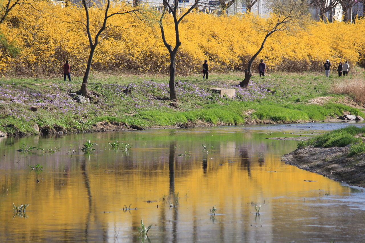 2023.03.29/ #도시기록 #개나리 #안양천 #노란물감/ 안양천 뚝방에 노란 개나리꽃 만발. 안양천 물에 비친 노란 개나리 물결은 마치 노란 물감을 풀어놓은듯 하다.