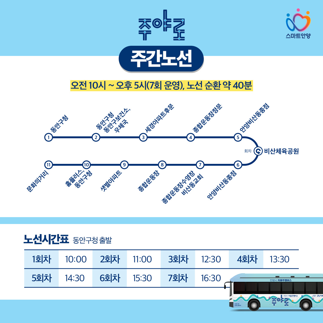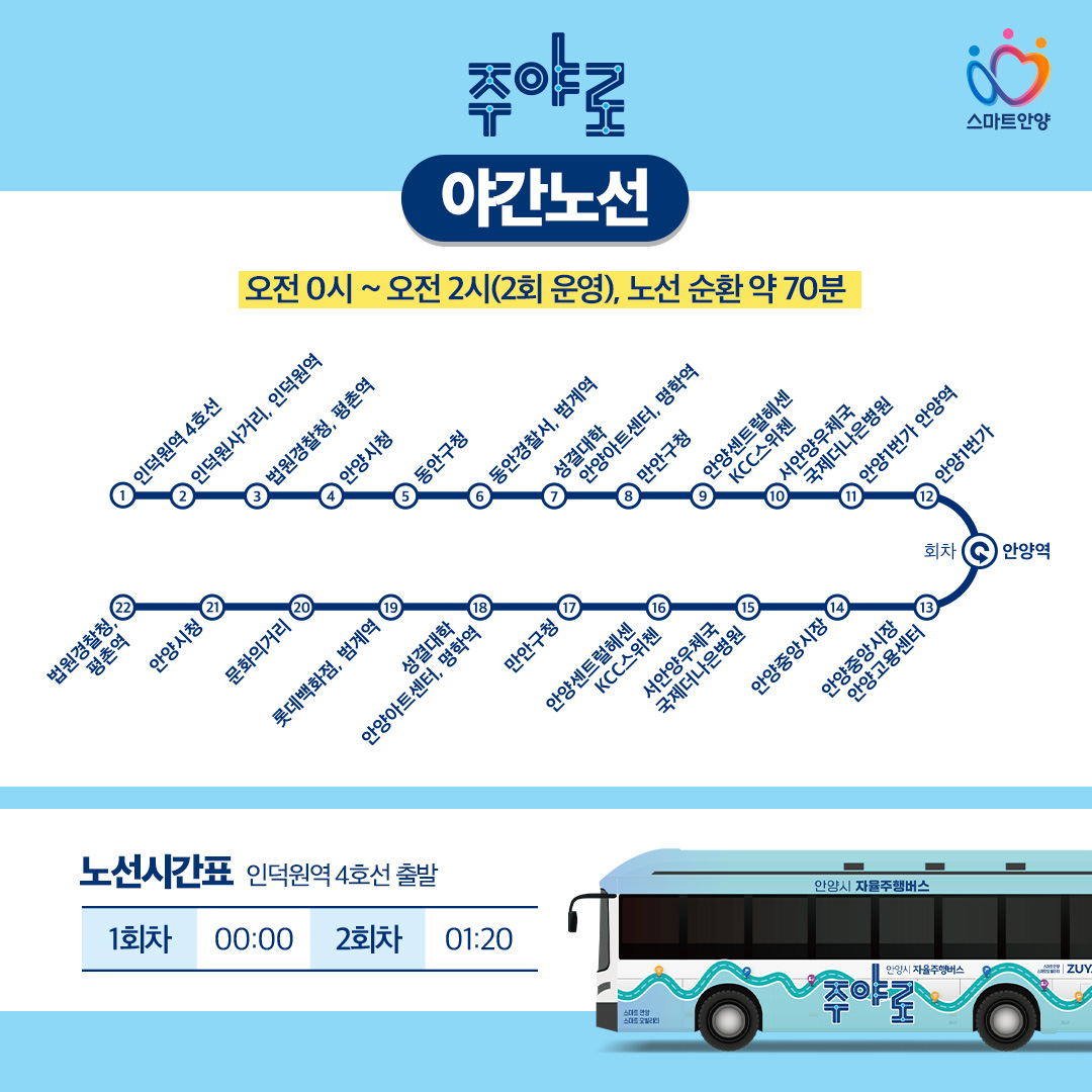 주야로는 오전 10시부터 오후 5시까지 유동인구가 많은 지역이지만 대중교통으로 한 번에 이동이 어려웠던 범계역~비산체육공원 구간(왕복 6.8㎞, 11개 정류장)에서 운행된다. 자정부터 새벽 2시까지는 인덕원역~평촌역~범계역~명학역~안양역을 연결하는 노선(왕복 14.4㎞, 22개 정류장)에서 시민 교통편의를 돕는다.