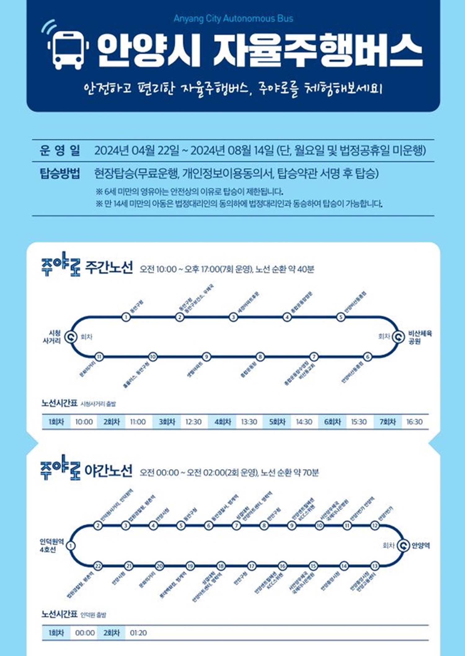 주야로 운행노선 및 버스정류장, 배차시간 등 세부사항은 안양시 누리집 및 블로그, 버스정류장 안내문에서 확인할 수 있다.