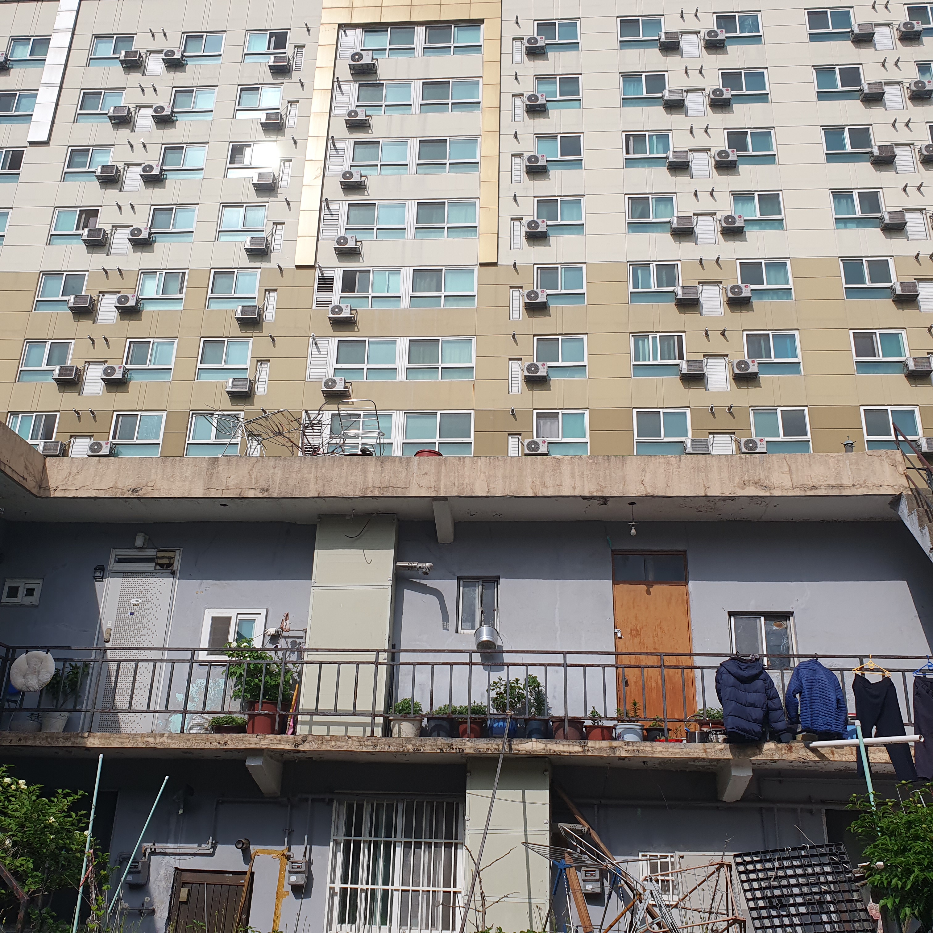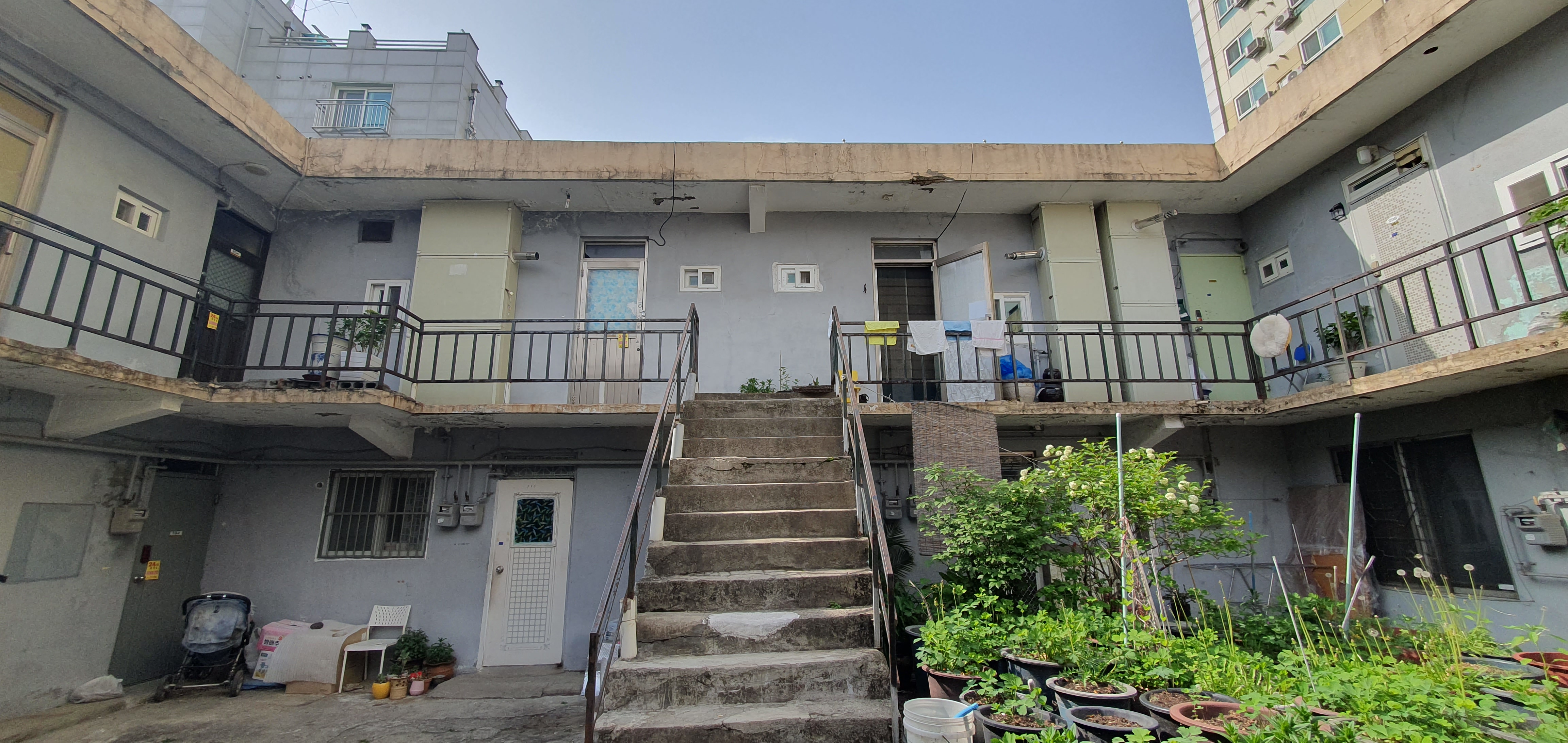 2024.04..26/ #도시기록 #안양 #동네 #골목 #안양6동 #이화연립/ 안양6동에 있는 미음자주택에 오랫만에 들려보다. 안양6동 변전소 가는 도로에서 좁은 골목길로 접어들면 중정(마당)이 있는 오래된 공동주택(안양6동 수리산로 28번길 10) 하나가 시선을 끌 정도로 매력적이다, 이 건물의 명칭은 이화연립으로 1978년 지어져 세월만큼이나 노후화되고 낡아 지난 1993년 정부(당시 내무부가 1993년 1월15일부터 4월15일까지 전국의 건물 9천1백14개소 2만8천2백46채에 대해 안전점검 실시)의 건물 안전진단 결과 재건축진단을 받았다. 하지만 외형적으로 보이는 낡음과 안전문제와는 별도로 건물안에 들어서면 요즈음에는 보기 드문 공동체 지향적 건축물이라는 점에서 볼수록 정감이 가는 공동주택으로 영화나 드라마 촬영 장소로 이용되기도 한다.
