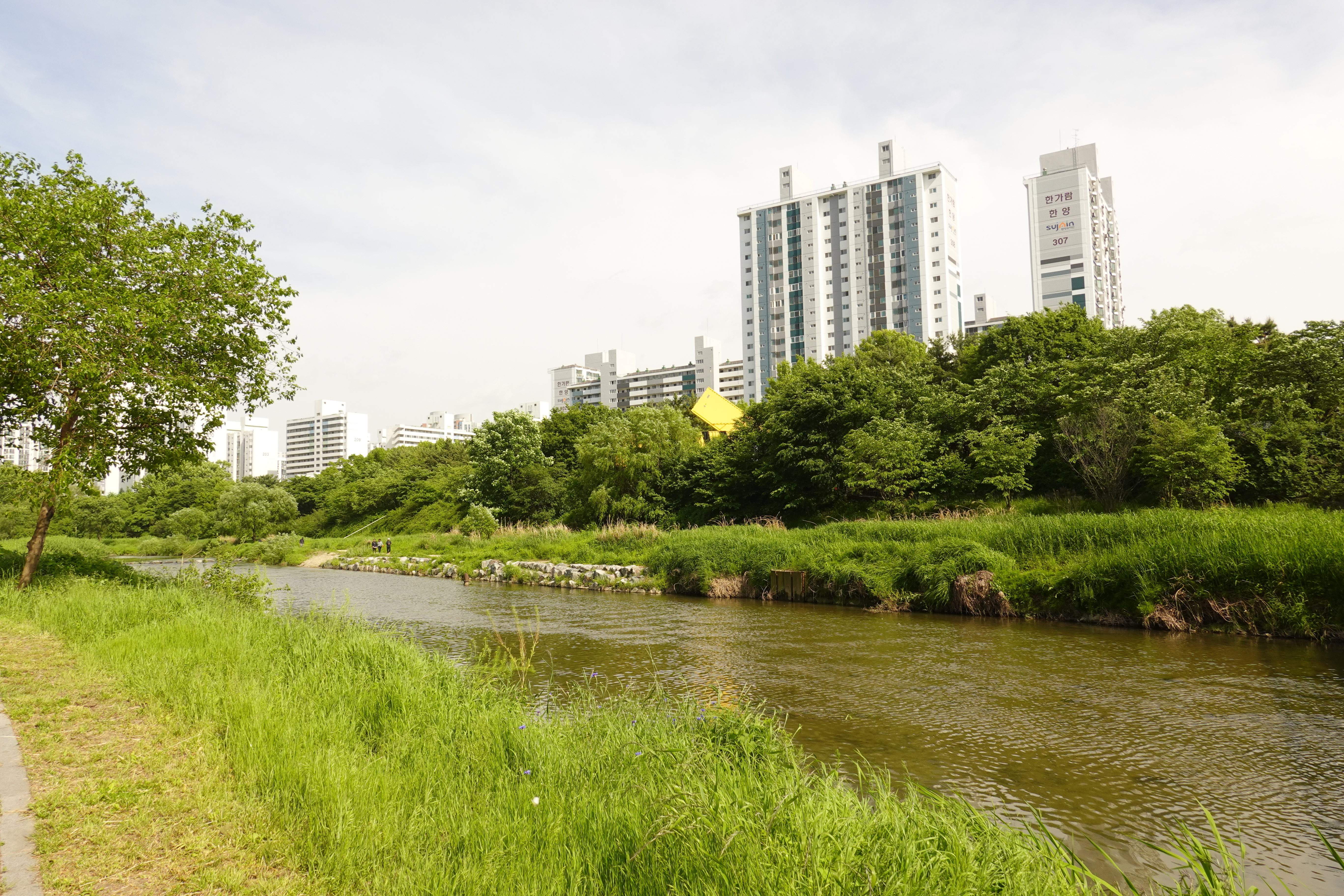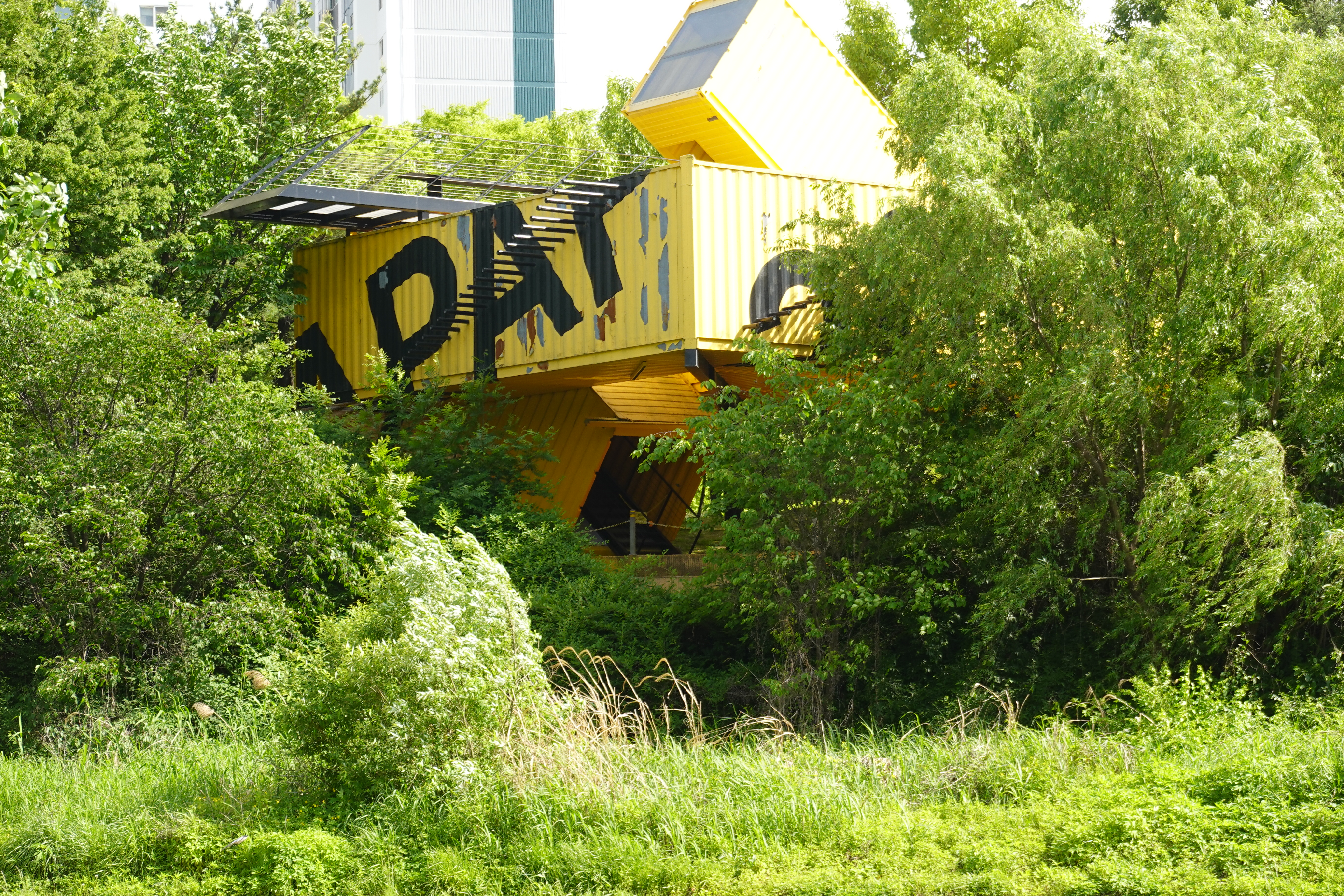 2024.05.12/ #도시기록 #안양 #학의천 #학운공원 #apap #오픈스쿨/ 안양시 관양동 학운공원 B구역(학의천 내비산교옆)에 있는 시설물인 오픈스쿨은 2010년 개최된 제3회 안양공공예술프로젝트(apap)에서 설치한 영구작품이다. 이 작품은 뉴욕을 중심으로 활동하고 있는 롯-텍(Lot-Ek)이 설계한 것으로 건축면적이 238㎡에 달하는 이 구조물은 노란색 컨테이너 8개가 화살표 모양으로 조합돼 있는 필로피 구조로 1층을 공중으로 뛰어 산책로를 확보했고, 실내는 강연과 전시가 가능하도록 설계돼 있다. 2011년 미국 뉴욕건축가협회 주최로 뉴욕에서 열린'2011년 디자인 어워드'에서 치열한 경쟁끝에 건축부문 수상작으로 선정될 만큼 국제적으로도 유명해진 작품이나 제대로 활용을 못한채 마치 버려진듯한 공간으로 전락해 안타깝다. 더욱이 시간이 흐르면서 노란 페인트칠이 벗겨져 보수를 하지만 최근 여기저기 벗겨짐이 심해 흉물스러운 모습이다.