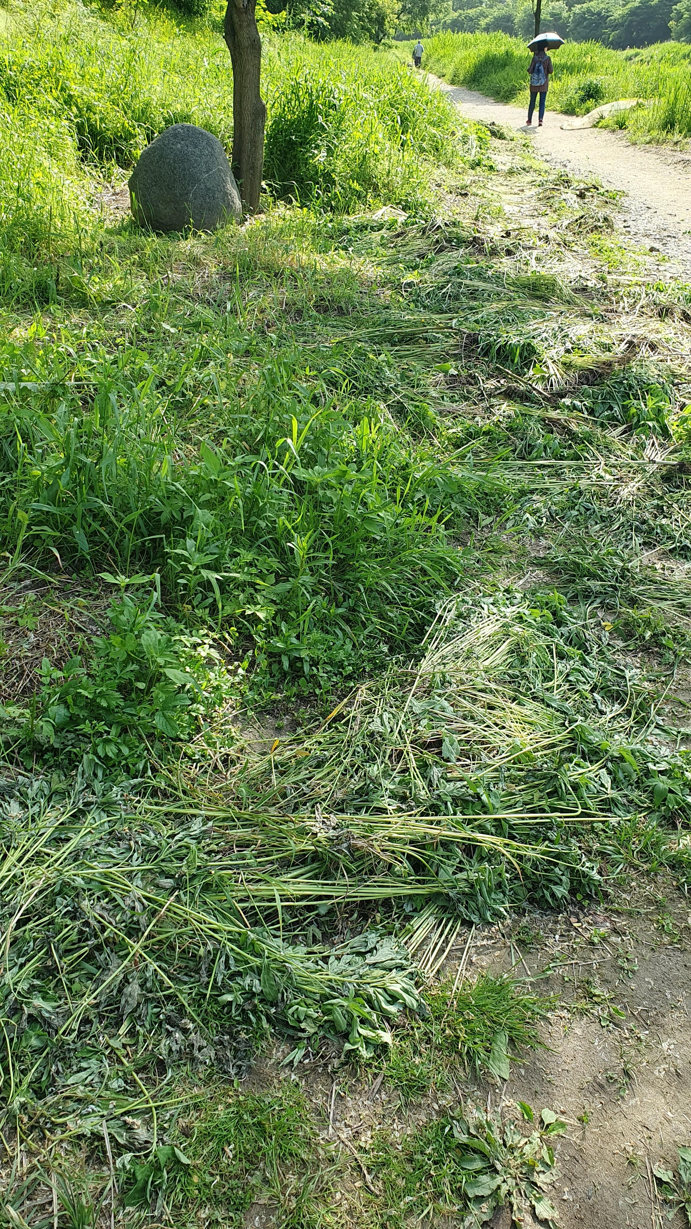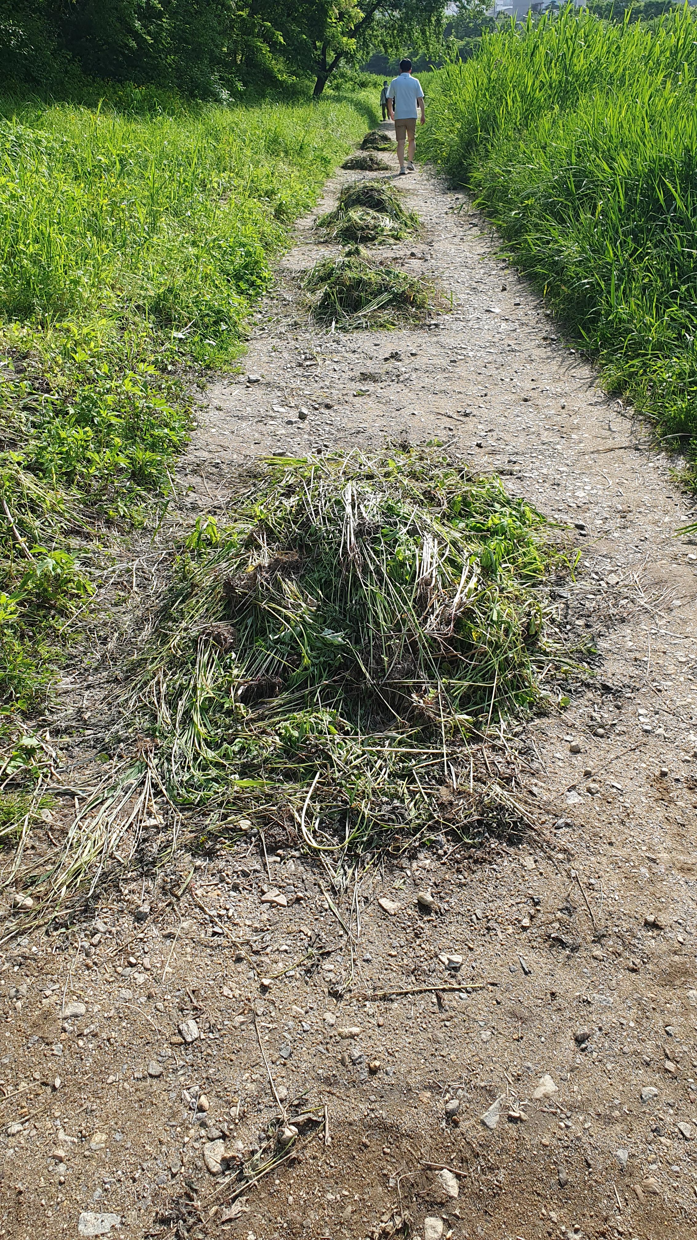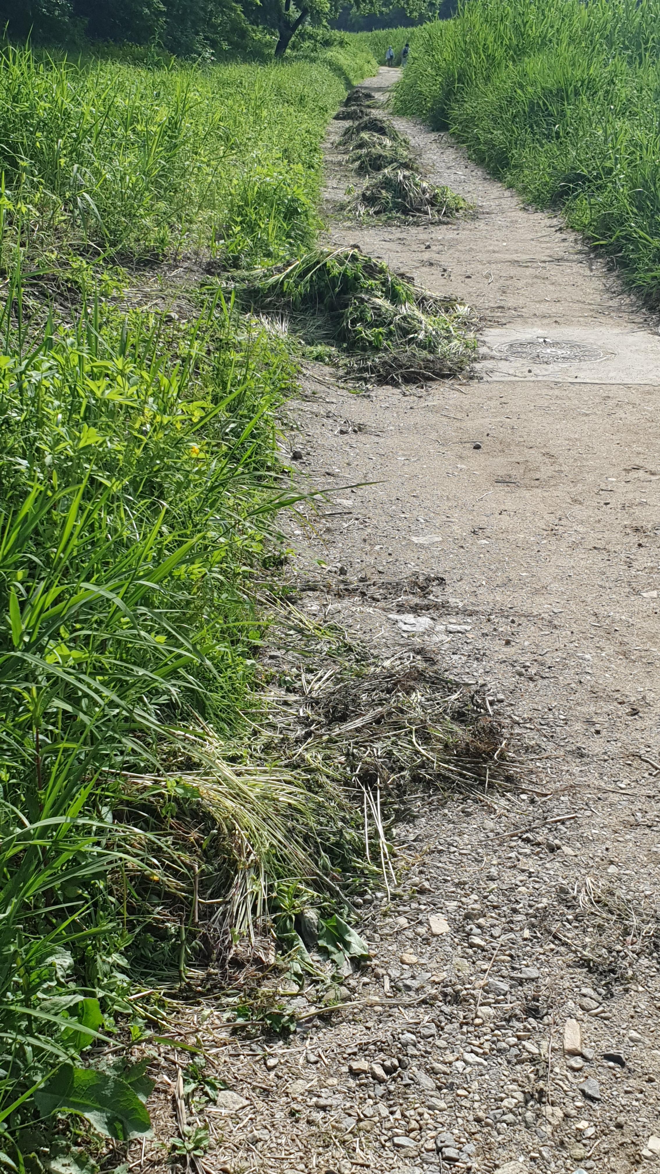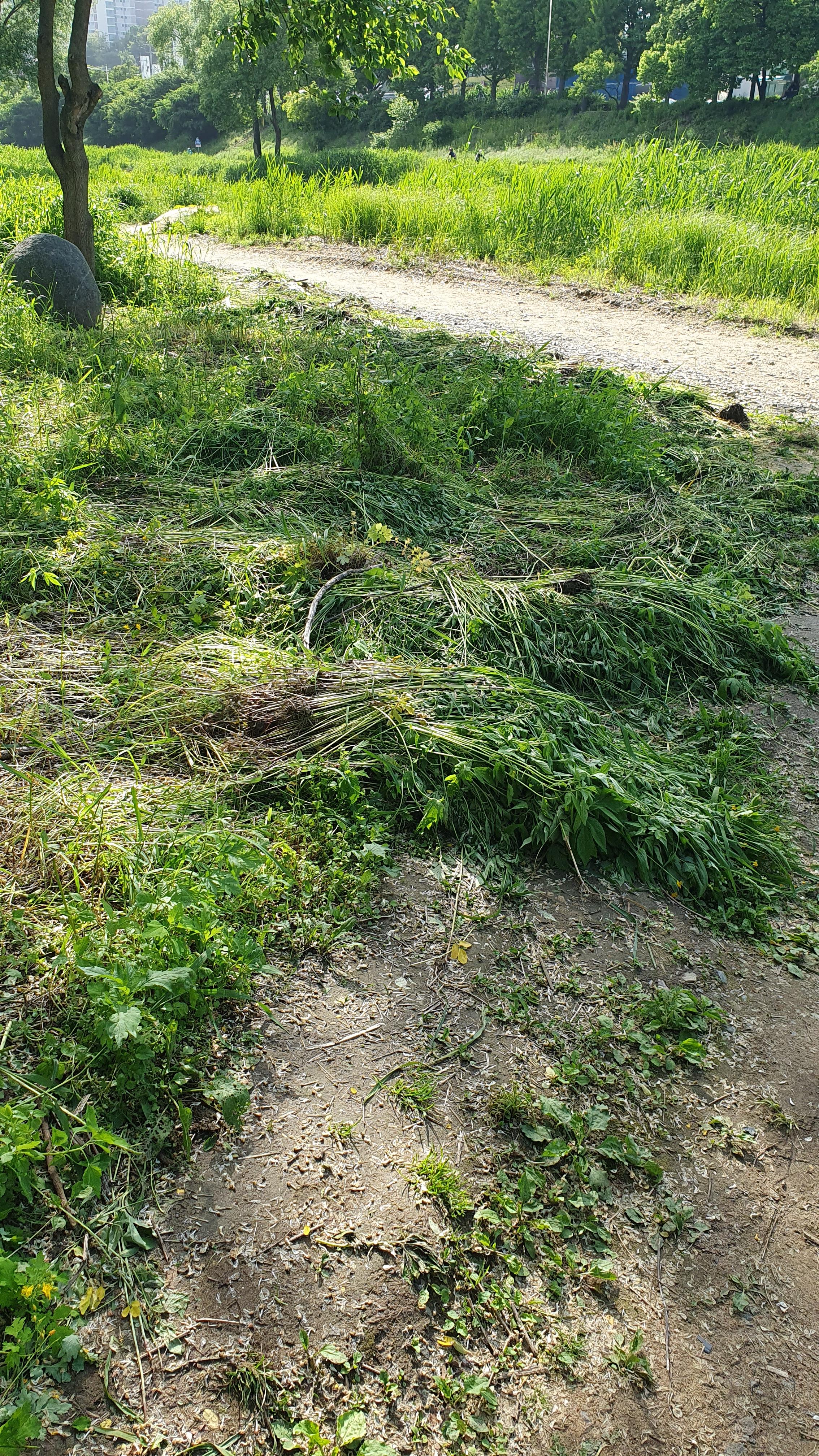 2024.05.12/ #도시기록 #안양 #학의천 #에공/ 안양 학운공원 둔치인 학의천 남단 산책로(흙길)의 수풀을 베어낸 모습이다. 흙길 산책로 옆으로 일부만 베어낸 모습을 볼때 기획적이고 의도적인 행동이고 이유가 있어 보이는데 왜 그랬을까. 이같은모습은 학의천 흙길 산책로뿐만 아니라 북단 포장길 산책로옆도 마찬가지다. 분명 이유가 있겠고 궁금하지만 자연 그대로 두었으면 싶은 흙길 산책로 주변의 수풀은 대체 왜 베어냈을까. 이런 작업을 할때 큰 안내판은 아니어도 안내문이라도 나무에 걸어 이해를 구하면 어떨까 싶다. 삼성천 오리 해코지에 주민이 종이에 글씨 써 코팅해 부착한 것처럼 소통이 중요하다.