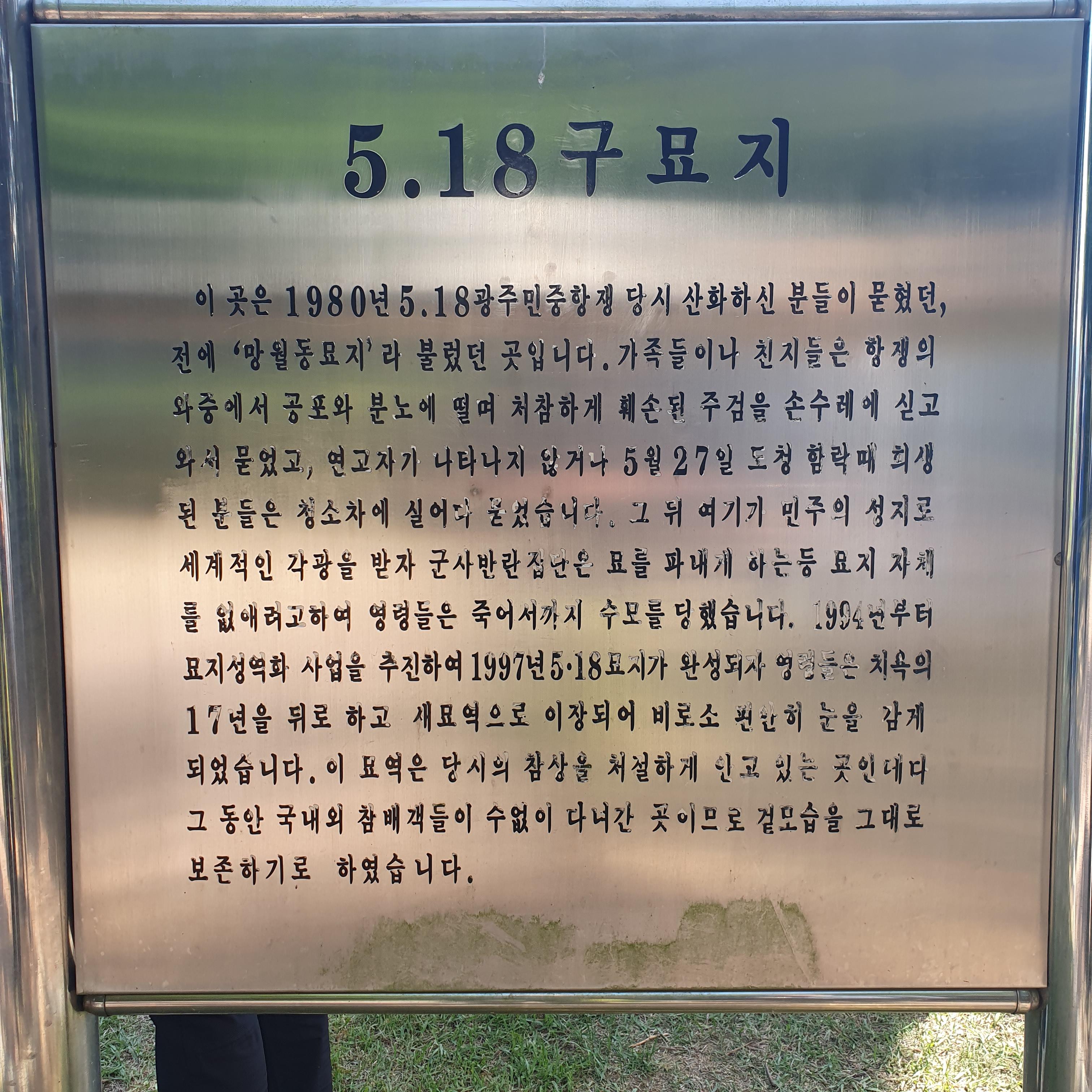망월동 구묘역에서 언덕길을 내려오면 신묘역인 국립 5.18민주묘지로 연결된다. 광주광역시 북구 운정동 소재 국립민주묘지는 1994년 11월 1일 착공해 1997년 5월 13일 완공했다.