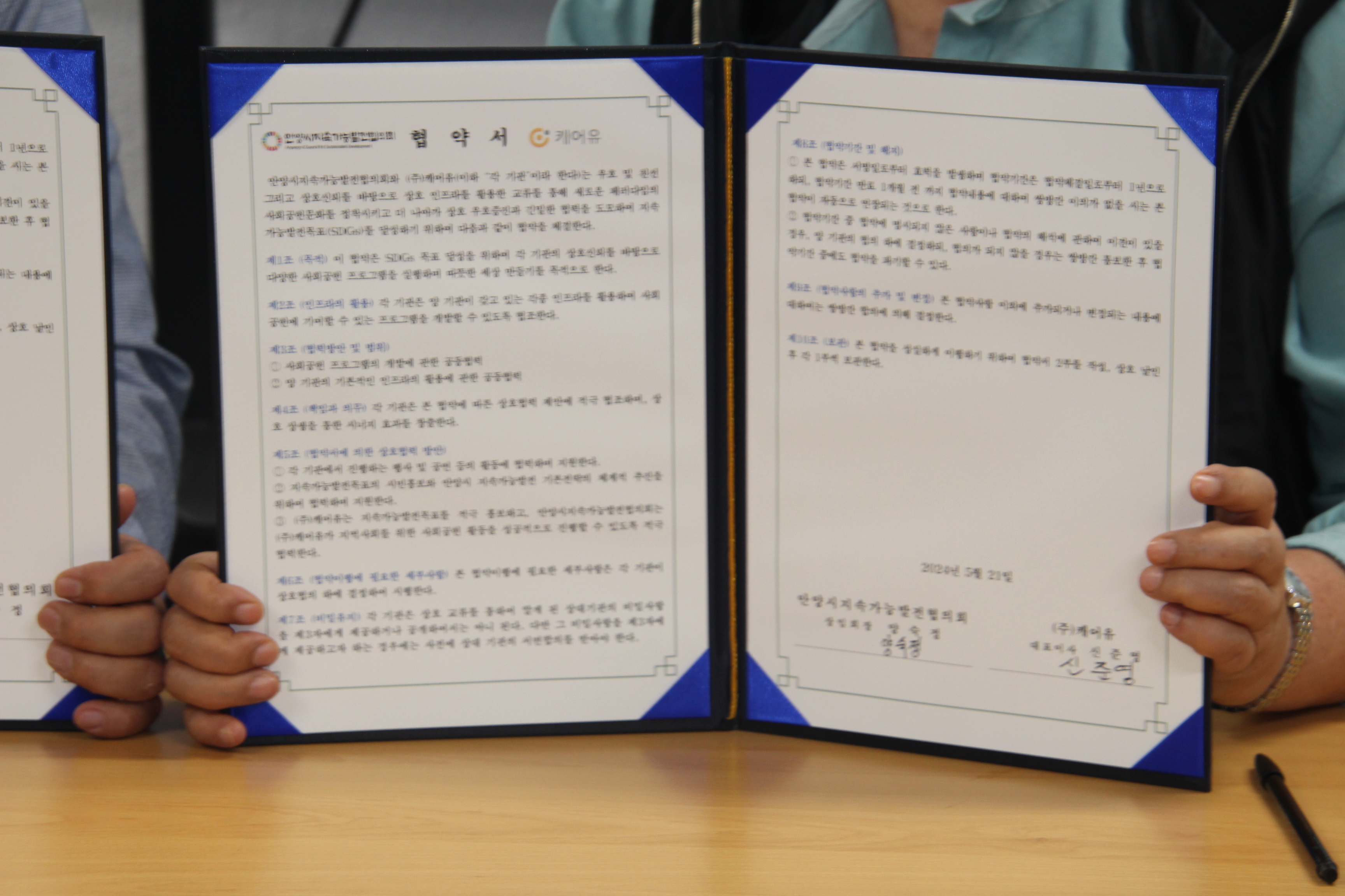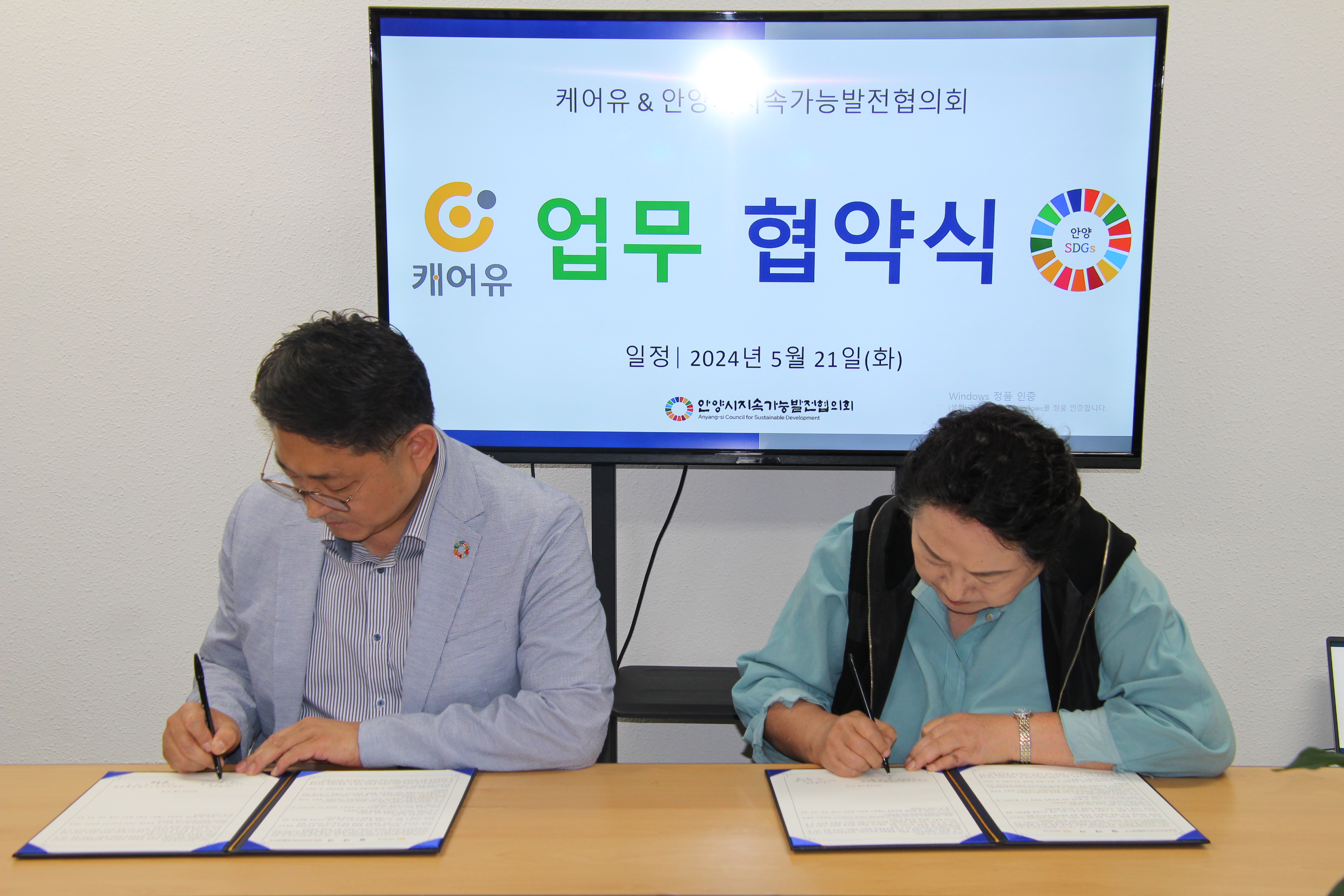 캐어유는 안양시지속가능발전협의회(상임회장 양숙정)와 사회적기업 캐어유(대표 신준영)가 지난 21일 안양시청 2층에 자리한 안양지속협 사무실에서 디지털정보격차 해소를 비롯한 안양시의 지속가능한 발전을 위한 지역사회공헌활동에 대한 업무협약을 체결하였다.
