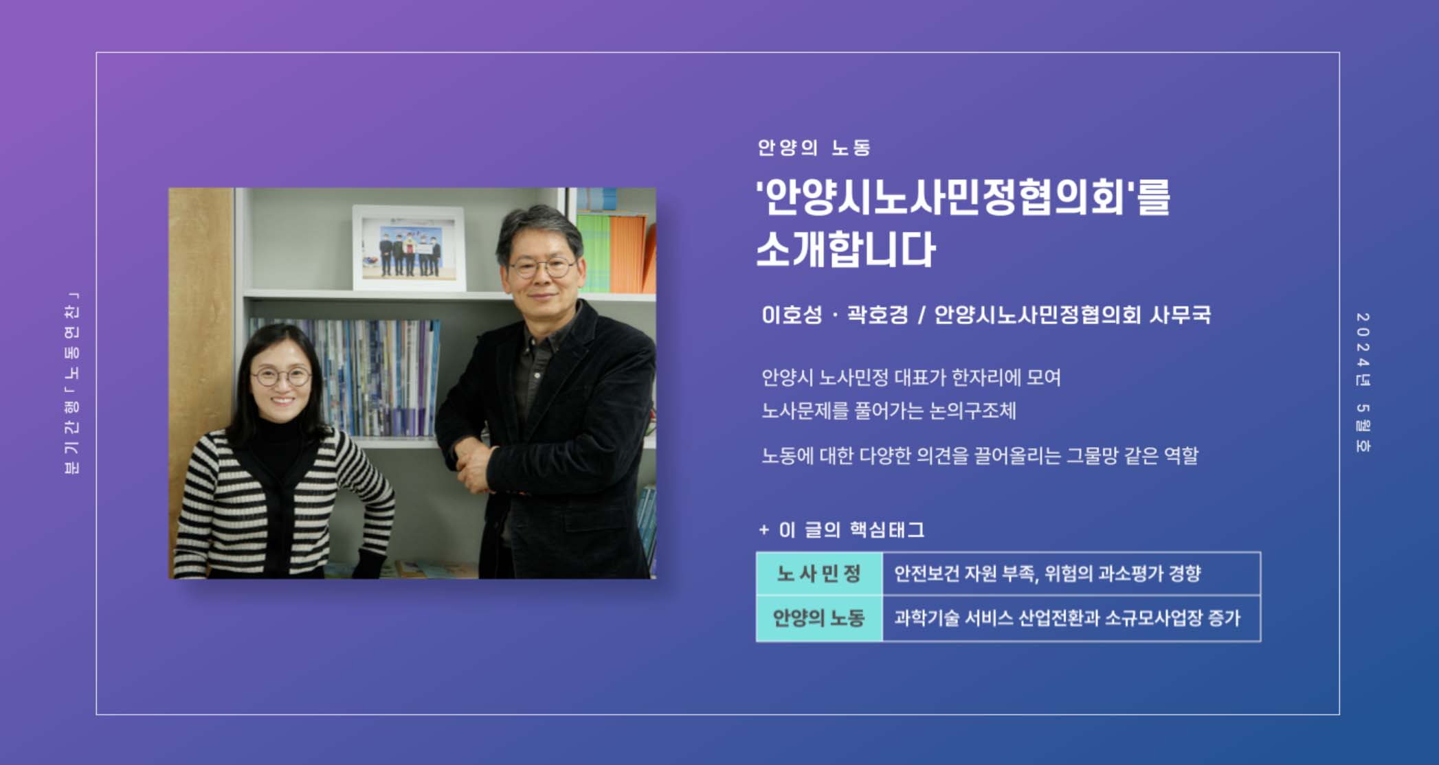 안양시 노사민정의 참여와 협력을 통해 지역사회의 현안을 협의 심의하는 기구인 안양시노사민정협의회. 그곳에는 사무국 업무를 담당하는 이호성 사무국장님과 곽호경 사무차장님이 있다. 안양시노사민정협의회 소속 분과위원회 관리부터 노동 관련 사업까지 모든 업무를 담당하며 사무국 살림을 살뜰하게 돌보고 있는 두 분은 알고 보면 노동 분야에서 잔뼈가 굵은 활동가들이다. 일반 독자들에게는 생소할 수 있는 안양시노사민정협의회는 어떤 곳이며, 그들이 바라보는 노동과 노사민정의 모습은 어떠할까?