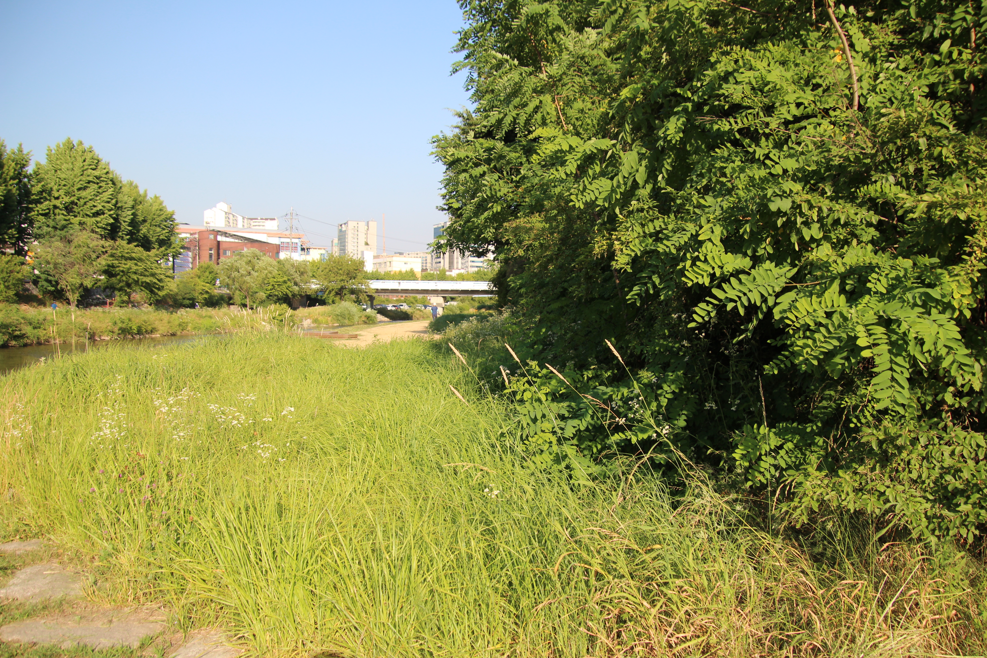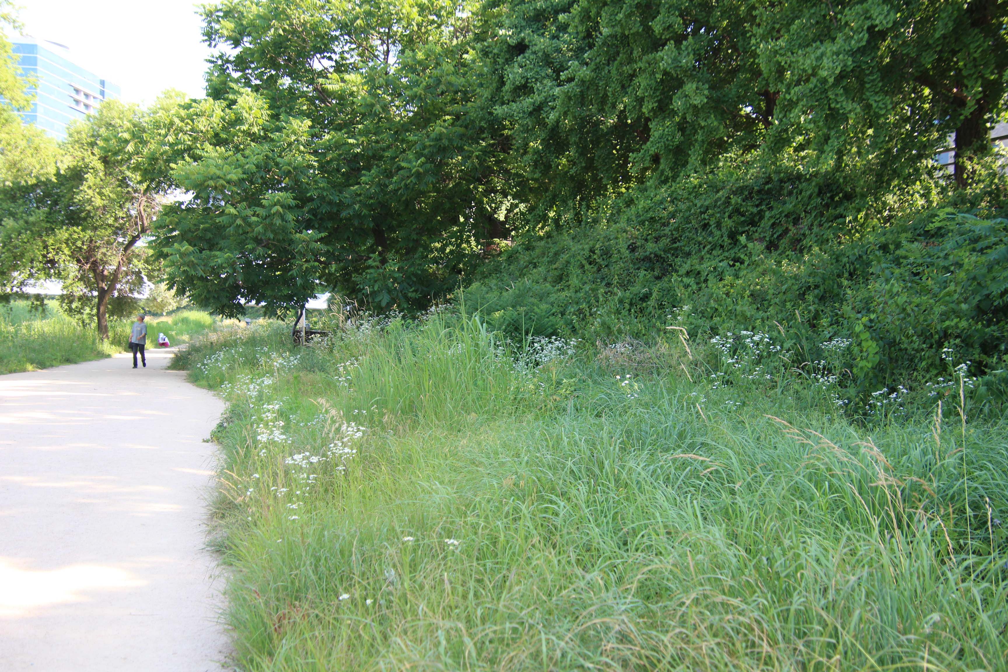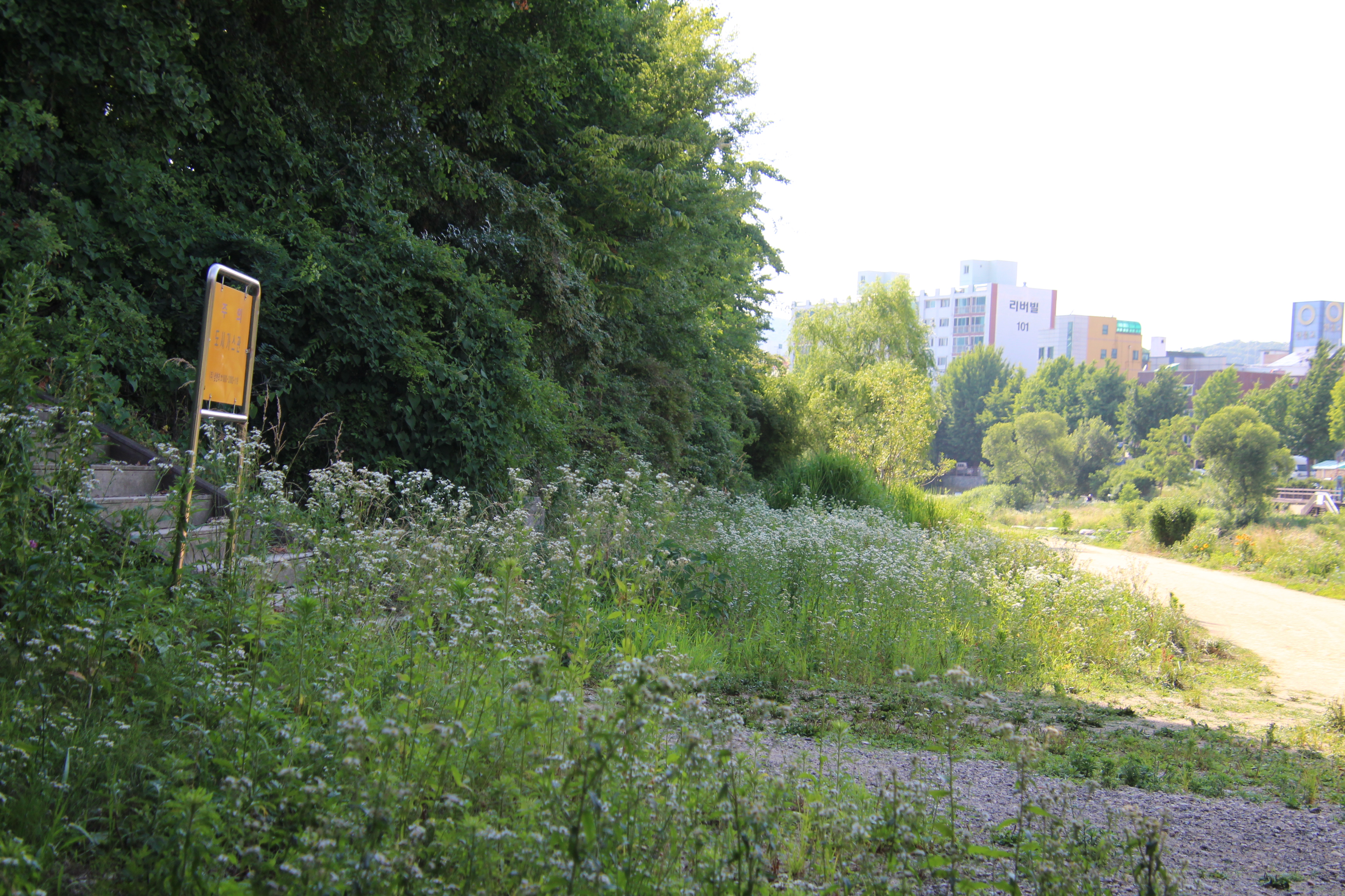 폭염이 작열하는 여름이지만 학의천 관양동(관양교~인덕원인도교)의 흙길을 걷다보면 꼬리명주나비들의 멋진 비행을 볼 수 있다. 나비를 보기 위해서는 기다리는 인내가 필요하다. 수풀에 앉아있는 나비가 날아오를때 까지 기다려야 하기 때문이다. 두어곳 있는 나무 그늘아래에서 멍 때림이 필요할듯 싶다.