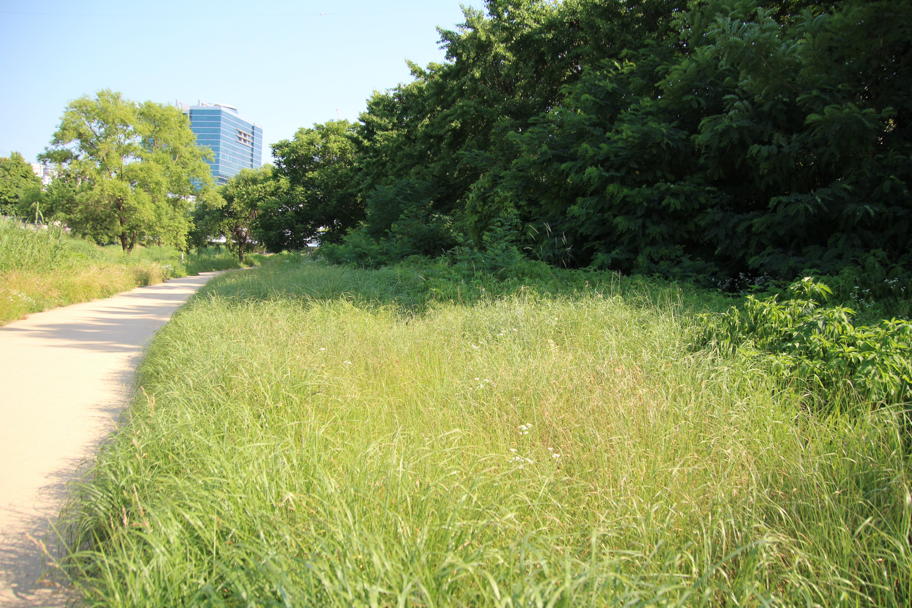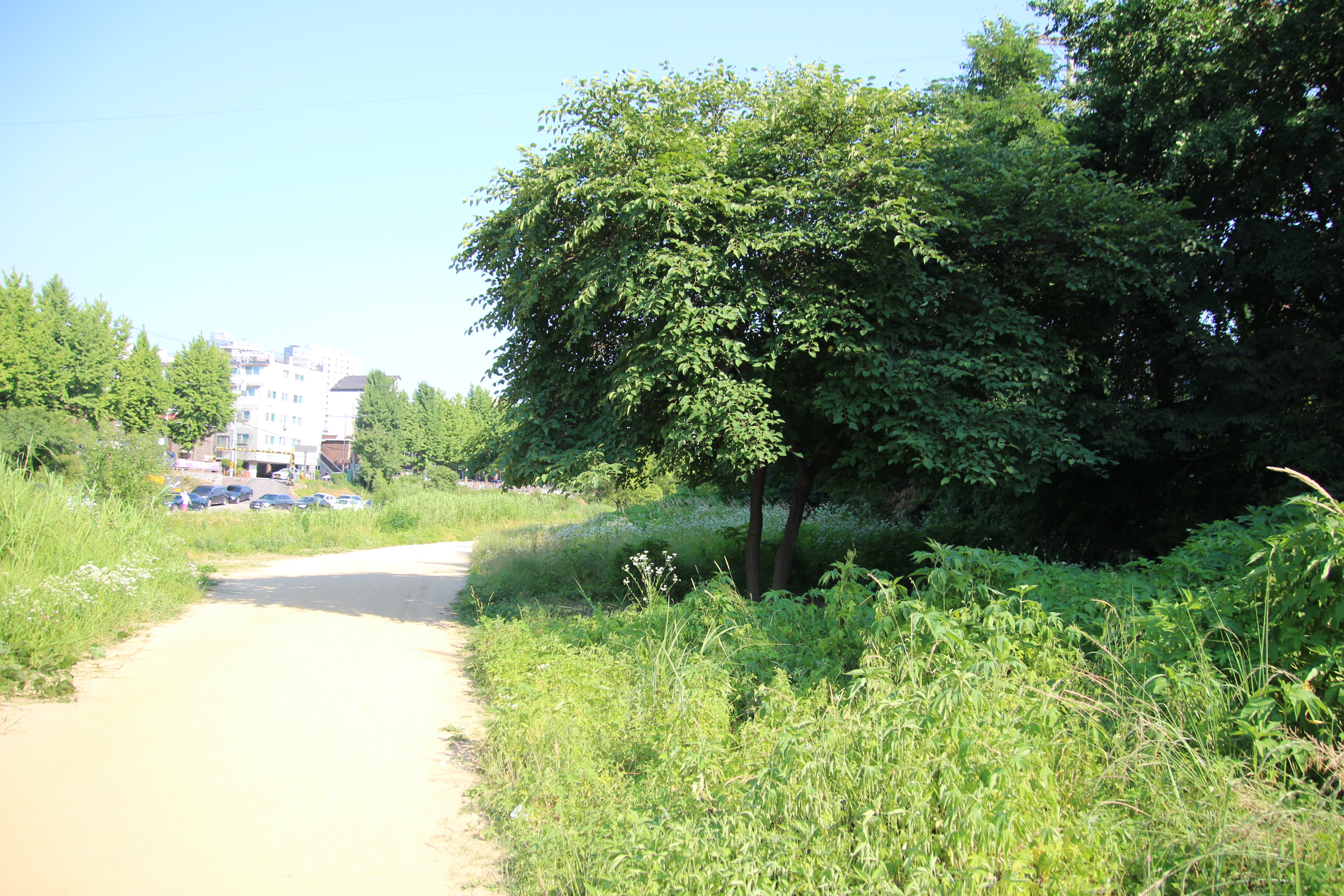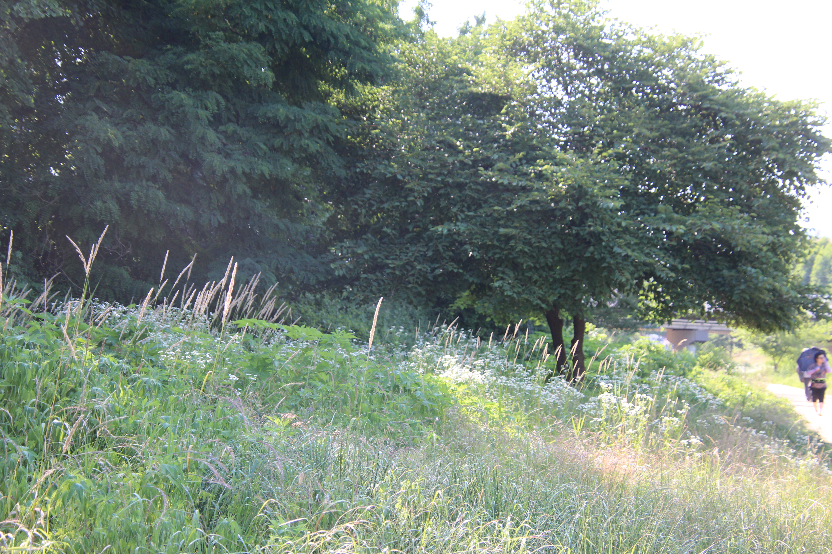 폭염이 작열하는 여름이지만 학의천 관양동(관양교~인덕원인도교)의 흙길을 걷다보면 꼬리명주나비들의 멋진 비행을 볼 수 있다. 나비를 보기 위해서는 기다리는 인내가 필요하다. 수풀에 앉아있는 나비가 날아오를때 까지 기다려야 하기 때문이다. 두어곳 있는 나무 그늘아래에서 멍 때림이 필요할듯 싶다.