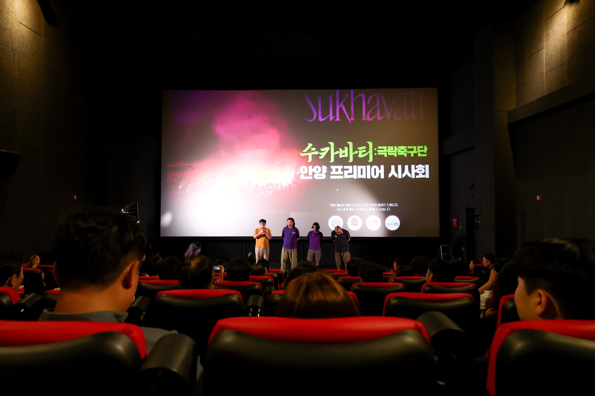 대한민국 최초 축구단 서포터스 다큐멘터리 영화 <수카바티:극락축구단>이 오는 7월31일 전국 개봉을 앞두고 열린 이날 시사회는 안양시관계자, 선수단, 서포터 등을 초청해 진행됐다. 안양에서 나고 자란 안양 토박이 장현정 아나운서가 행사 진행을 맡았다. 첫 순서로 선호빈・나바루 감독과 출연자 최지은・최캔디가 무대 인사에 나섰다. 선호빈 감독은 “영화를 통해 축제를 만들어보겠다”라고 이야기했고, 나바루 감독도 “많은 분들에게 위로가 될 수 있는 영화다. 재밌게 보시고 소문 내주시면 좋겠다”라며 더 많은 축구팬들의 관람을 독려했다.