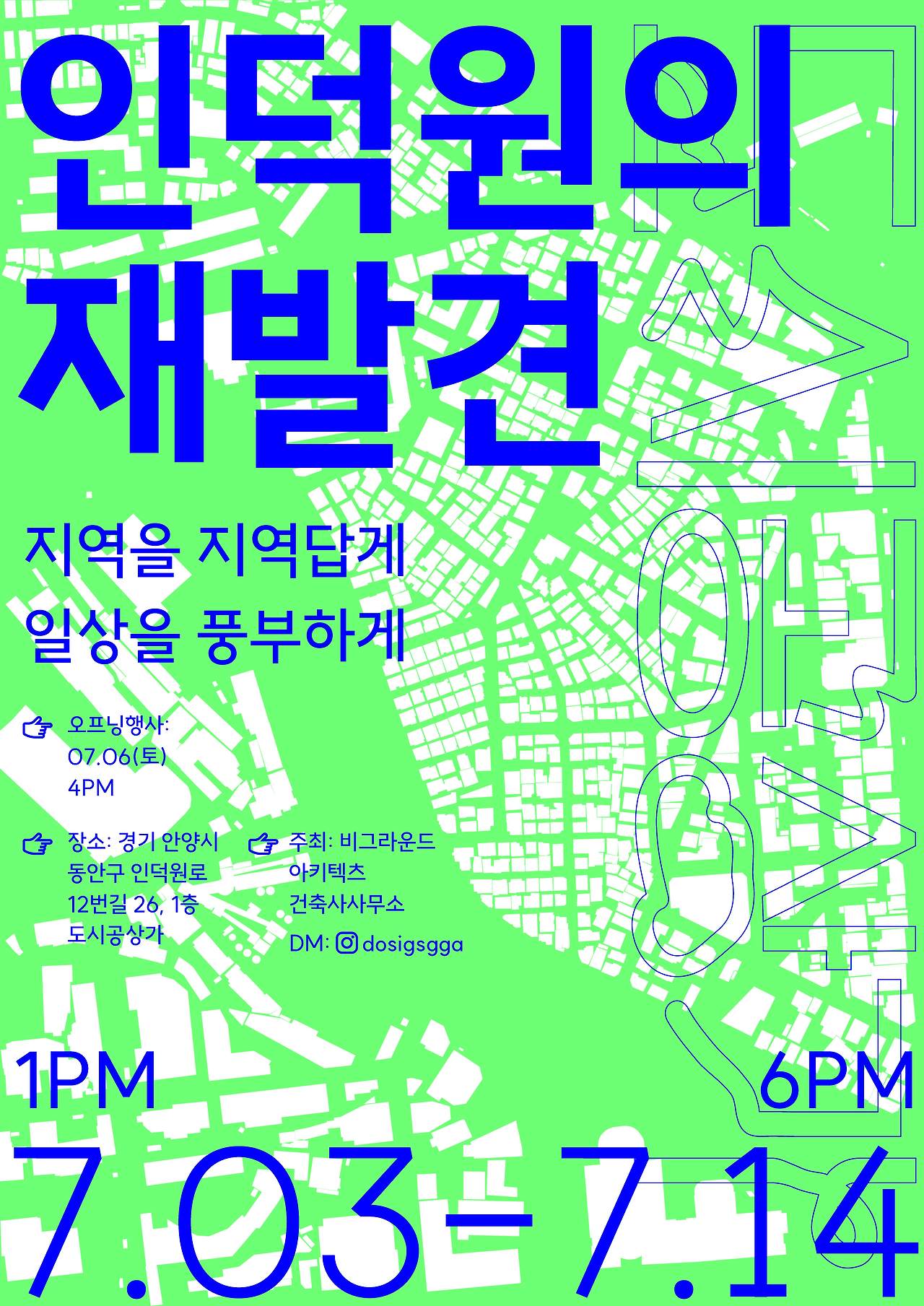 한편 <도시공상가>에서는 오픈 기념 및 첫 전시회로 '인덕원의 재발견'이 열리고 있다. 이 전시는 인덕원에서 5년째 사무실을 운영하는 비그라운드아키텍츠 건축사사무소에서 기획하고 준비했으며 7/3 -7/14까지 진행된다.