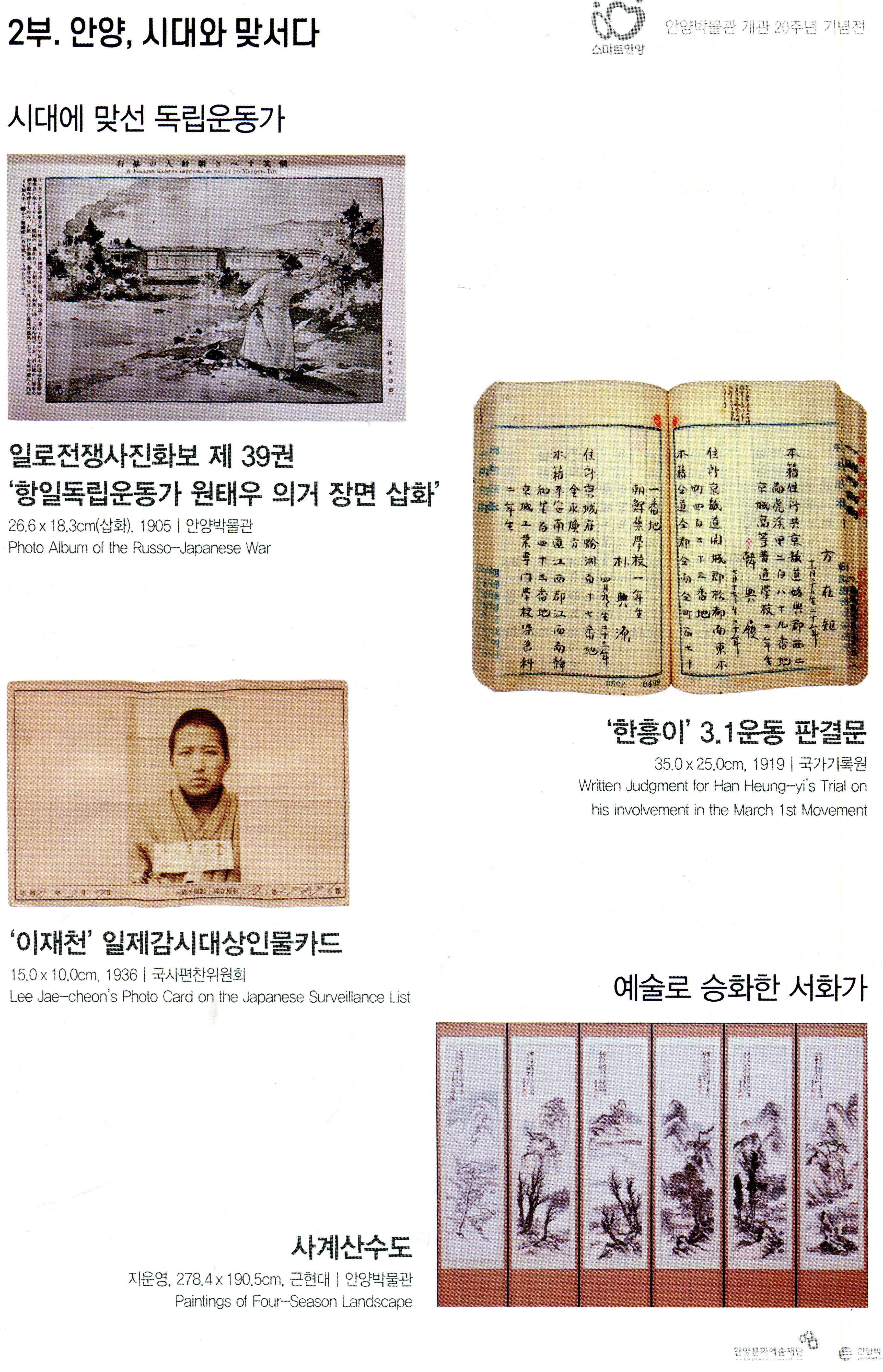 조선시대 풍류 공간이었던 관악산과 삼성산의 옛 모습과 여름 휴가지로 각광받았던 안양유원지 등 찬란히 성장해 온 안양의 모습을 선보이며, 특히 현존하는 유물 중 관악산을 담은 서화첩으로 첫 사례인 '삼성기유첩三聖記遊帖'이 처음 공개됐다.