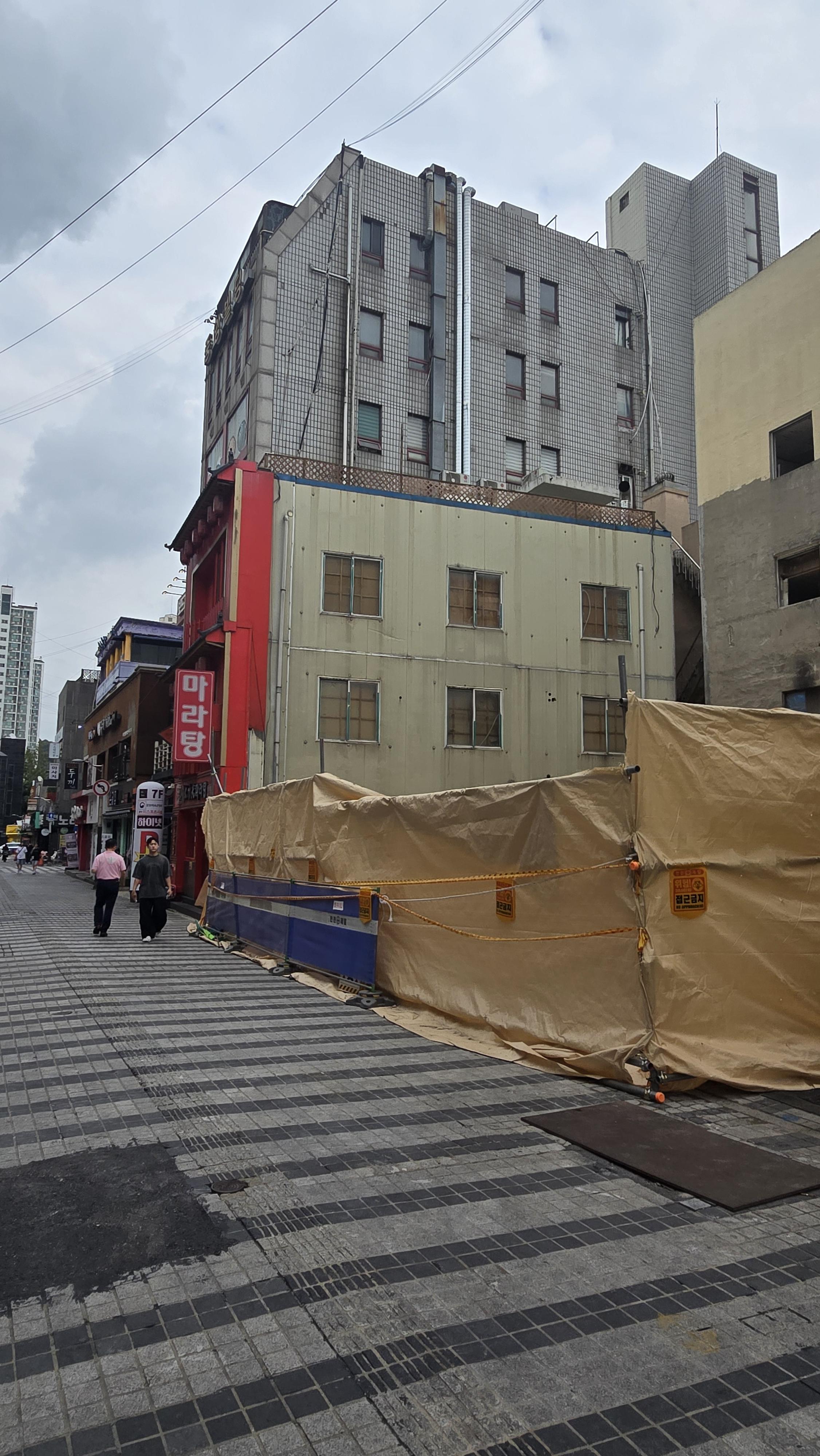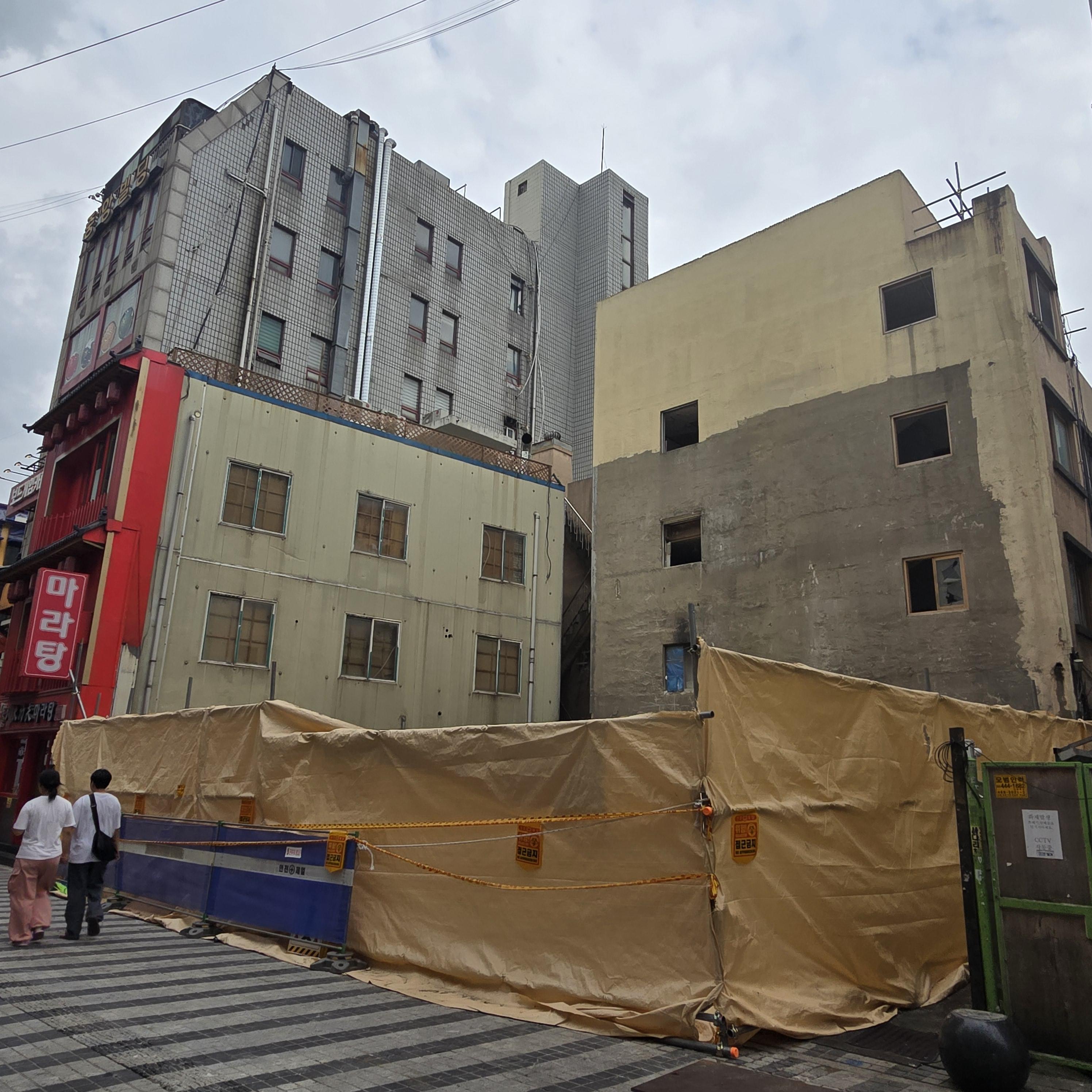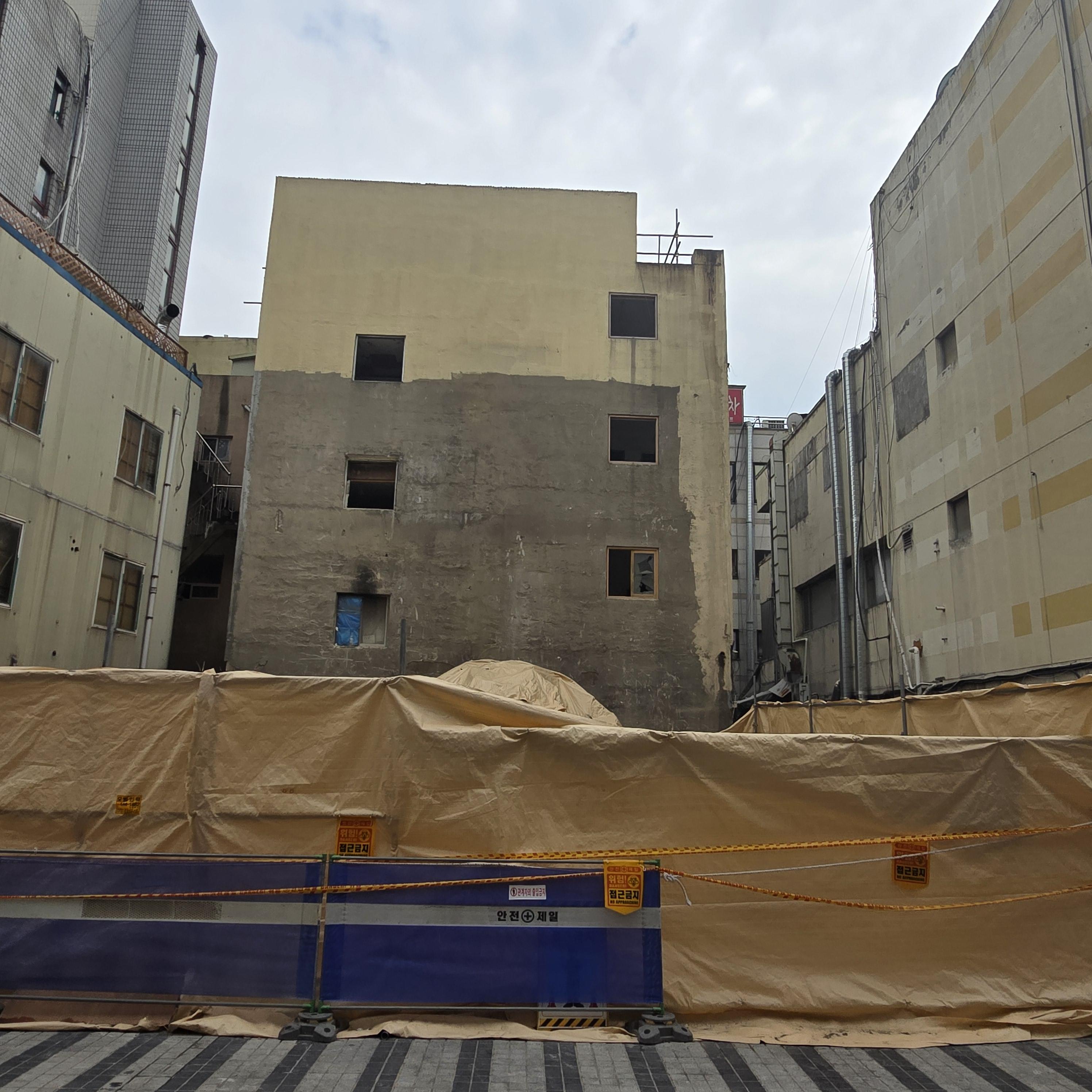 2024.08.08/ #도시기록 #안양 #안양일번가 #건물철거/ 경기 침체와 불황으로 빈점포가 엄청나게 많아진 안양일번가에서 월곶-판교지하철 신설에 따른 일번가역과 안양역 환승 통로 및 환기구, 개구부 설치 등으로 일부 건물이 철거되기 시작해 새로운 변화의 바람이 불고있다.