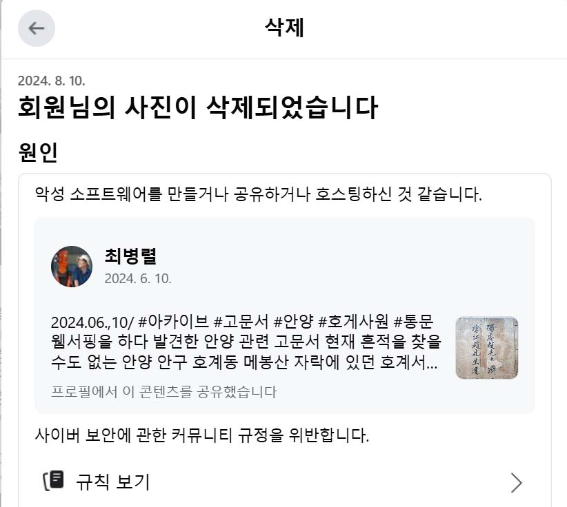 페부기 너 진짜 왜 그러냐. 더위 먹었니? 안양시 정보와 소식 글을 페북그룹과 페이지에 공유한것에 대해 제멋대로 글 삭제하고 계정까지 제한하더니 보름정도 지난후인 지난 10일 느닷없이 기술적 오류라고 메세지를 보내온지 하루도 안돼 8월 10일 오후 이번엔 2023.12.20과 2024.06.10에 올린 사진이 사이버보안에 관한 커뮤니티규정 위반이라 삭제하고는 또다시 계정 제한하는 짓거리를 하고 있다. 페부기 AI가 바이러스에 감염됐던가, 고장이거나, 미치지않았나싶다. 니기미