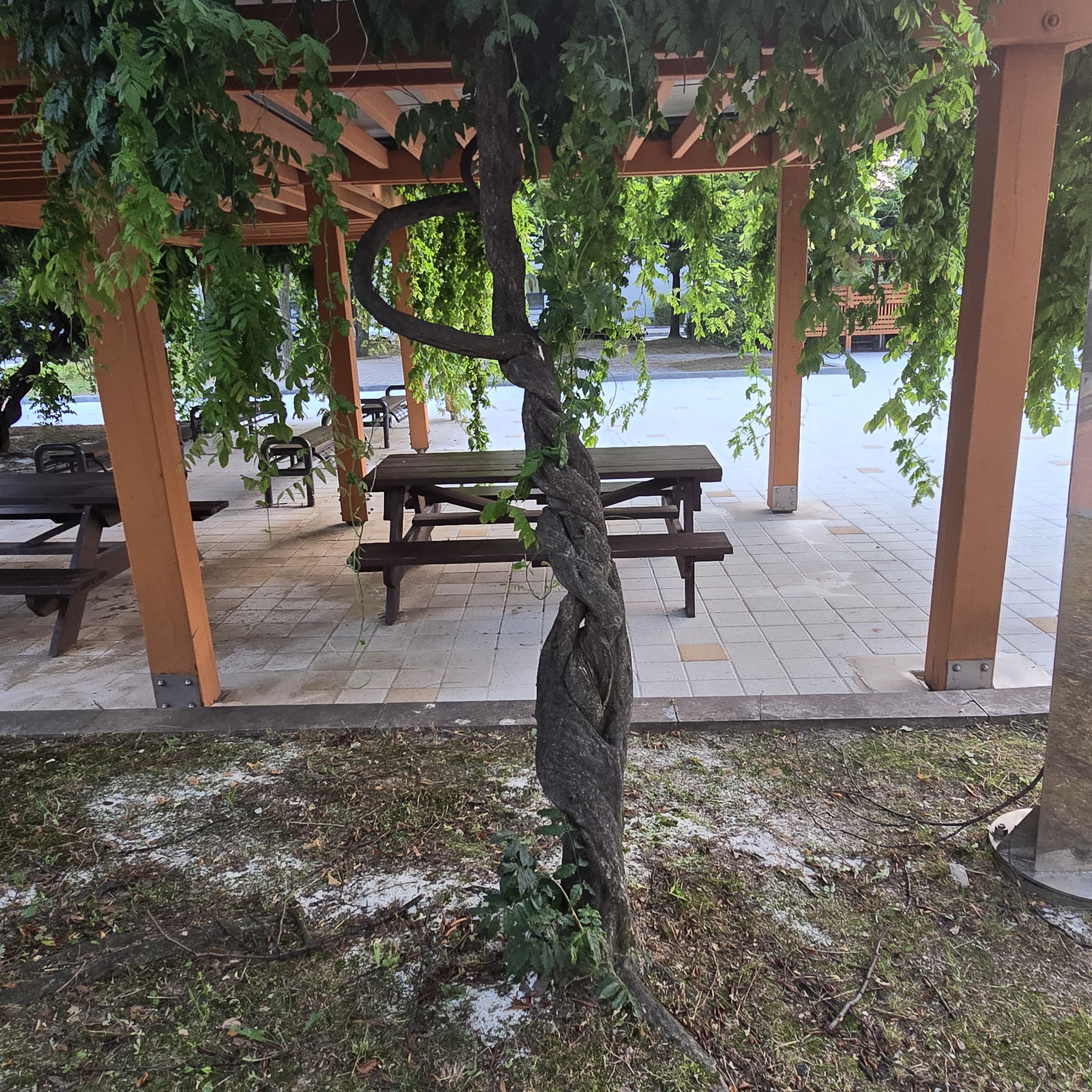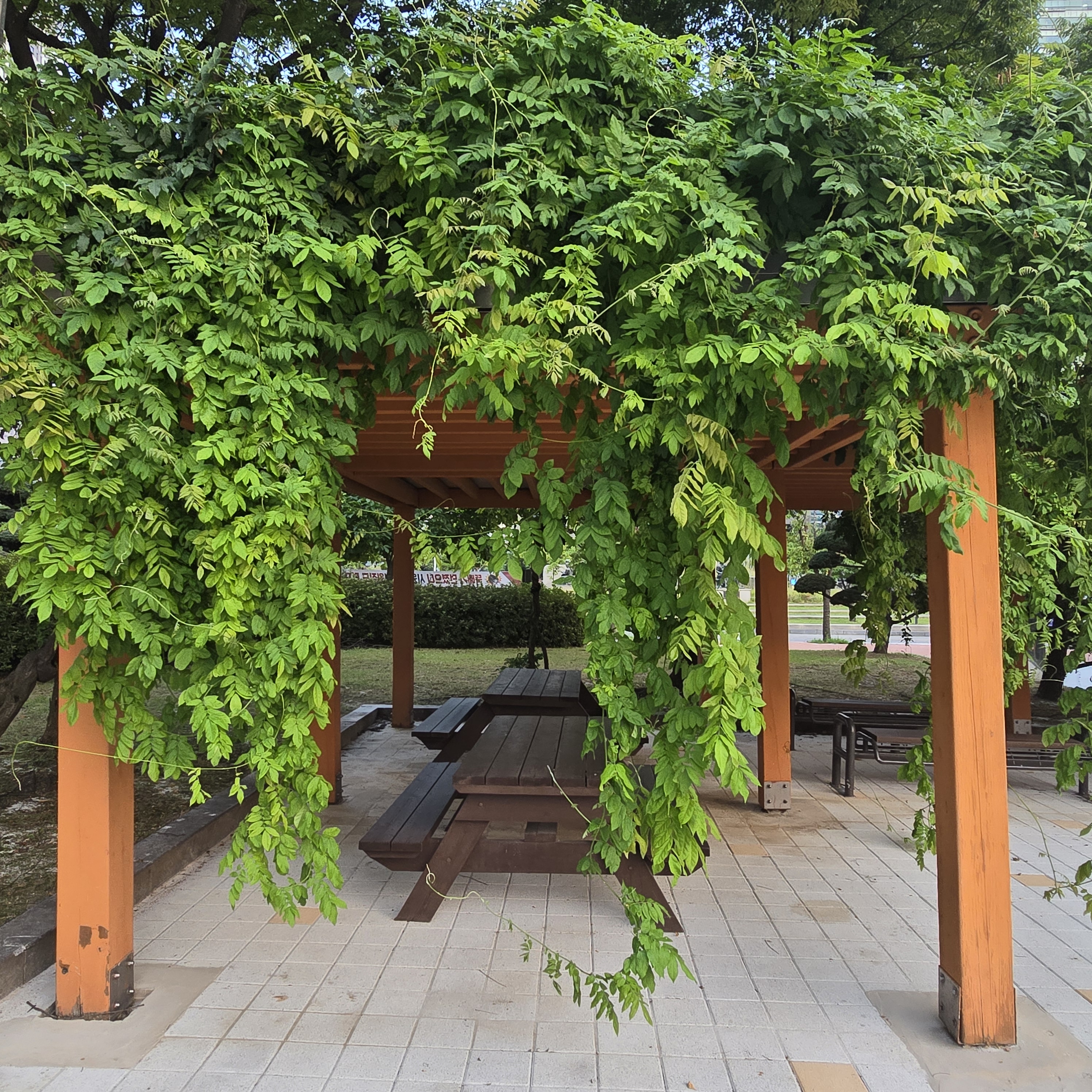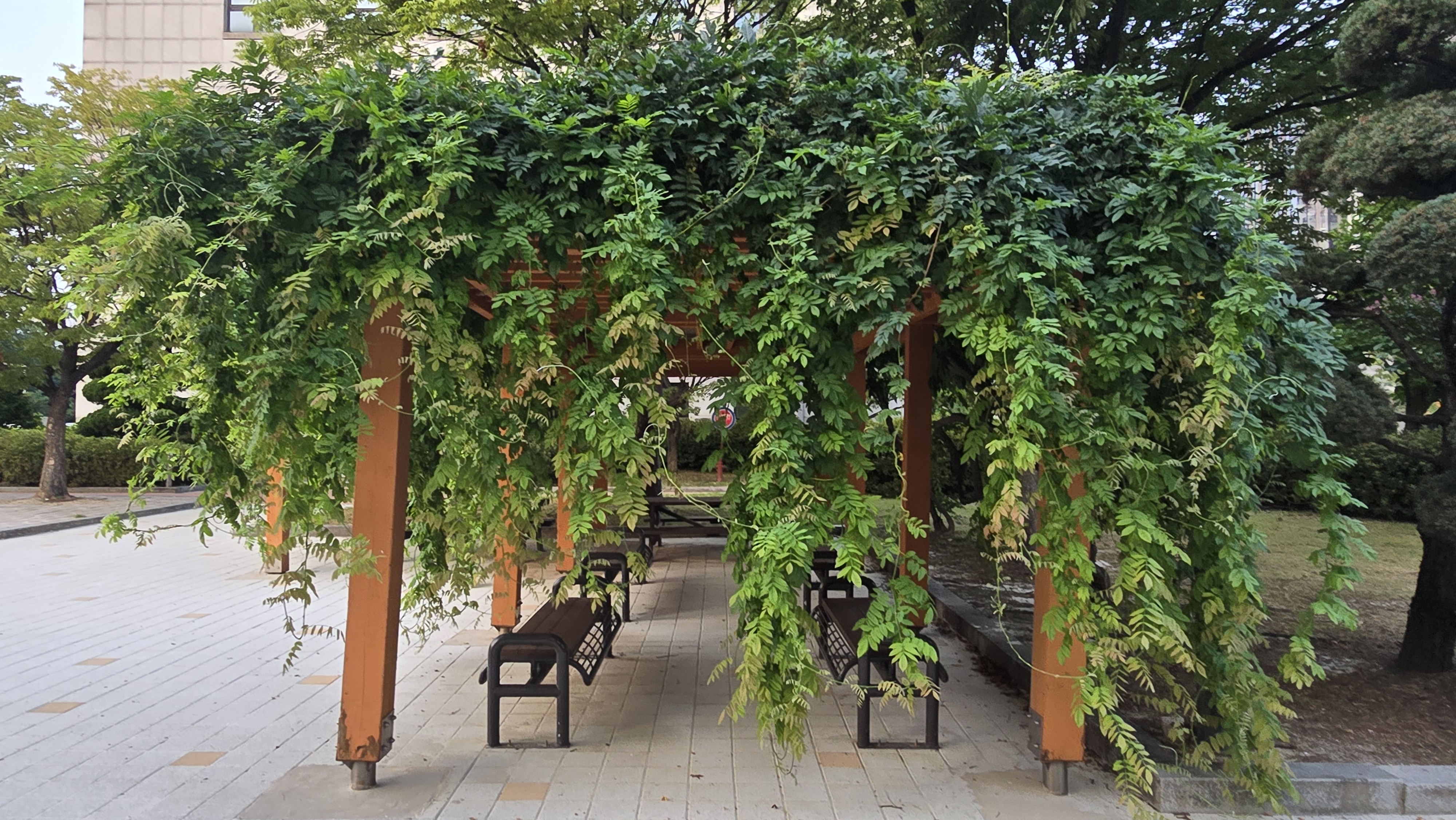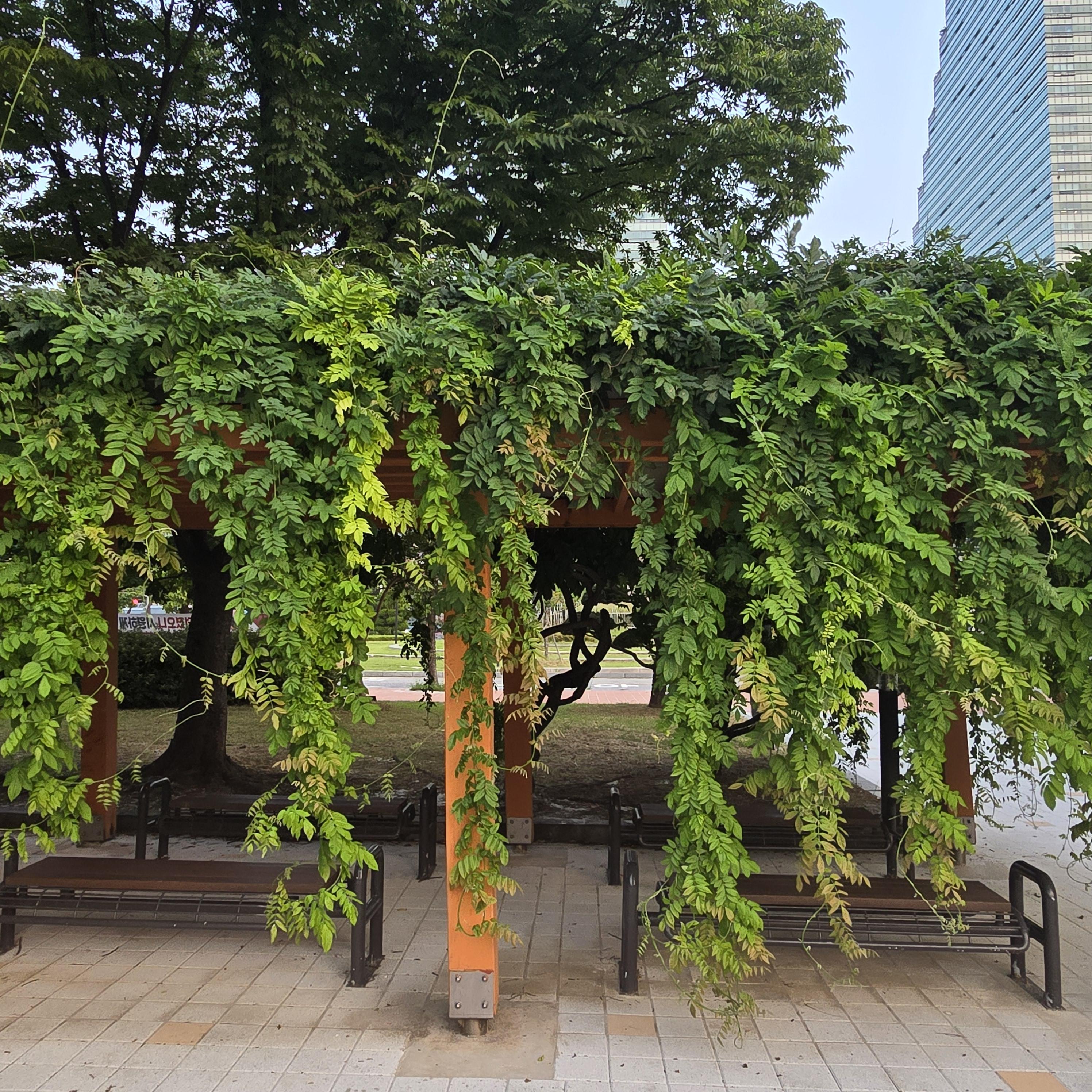 2024.08.12/ #도시기록 #등나무 #인양시청/ 안양시청 본관 건물 서쪽출입문앞 등나무 쉼터. 등나무 한그루가 만든 넝굴이 쉄터 전체를 덮앞다. 자연의힘. 등나무쉼터 옆으로 포도나무 넝굴도 있었는데 언젠가 없애버려서 너무나 아쉽다. 그대로 두었더라면 지금쯤 포도송이에 매달린 포도알이 보라빛으로 땡글땡댕 영글어 갔을텐데. 과거 안양 특산물을 상징하던 포도나무가 시청내에서 사라진것이 안타깝다.