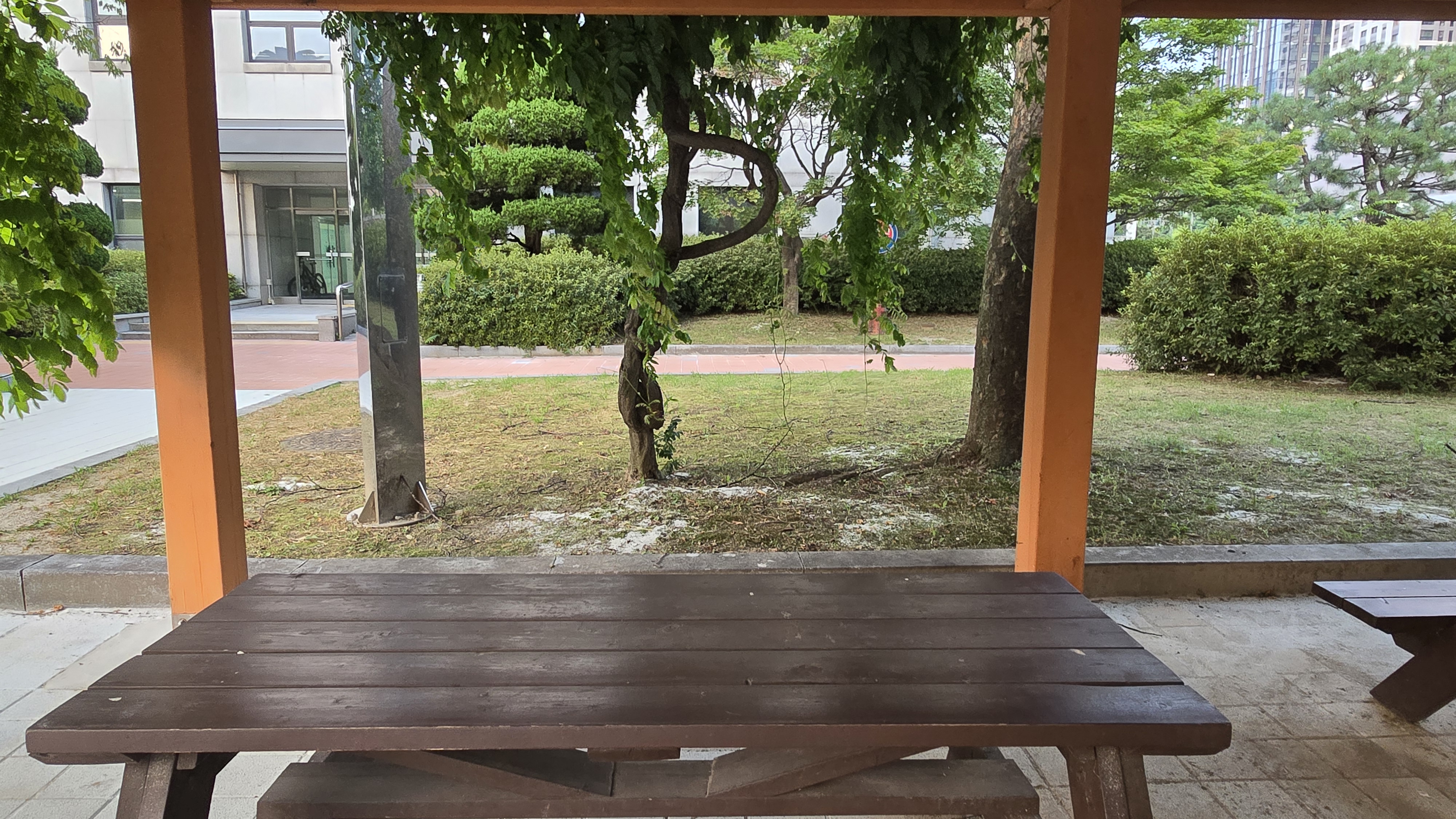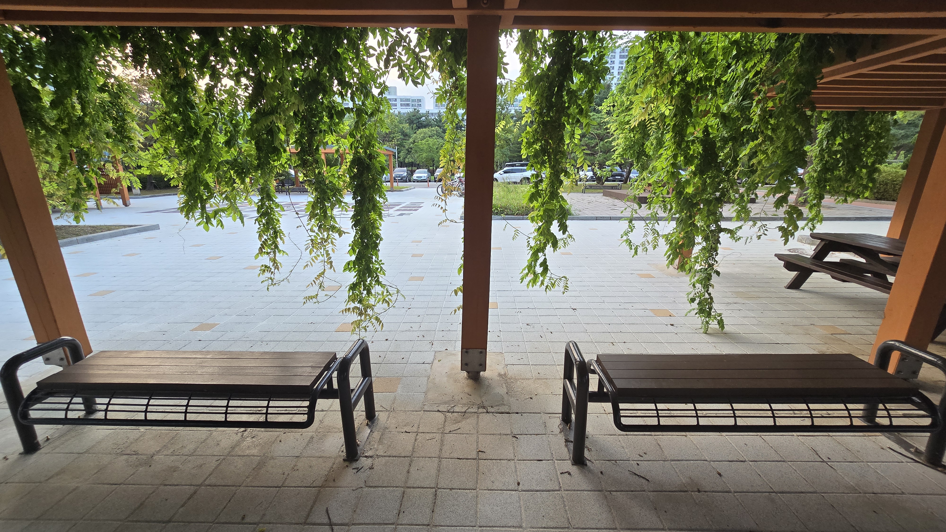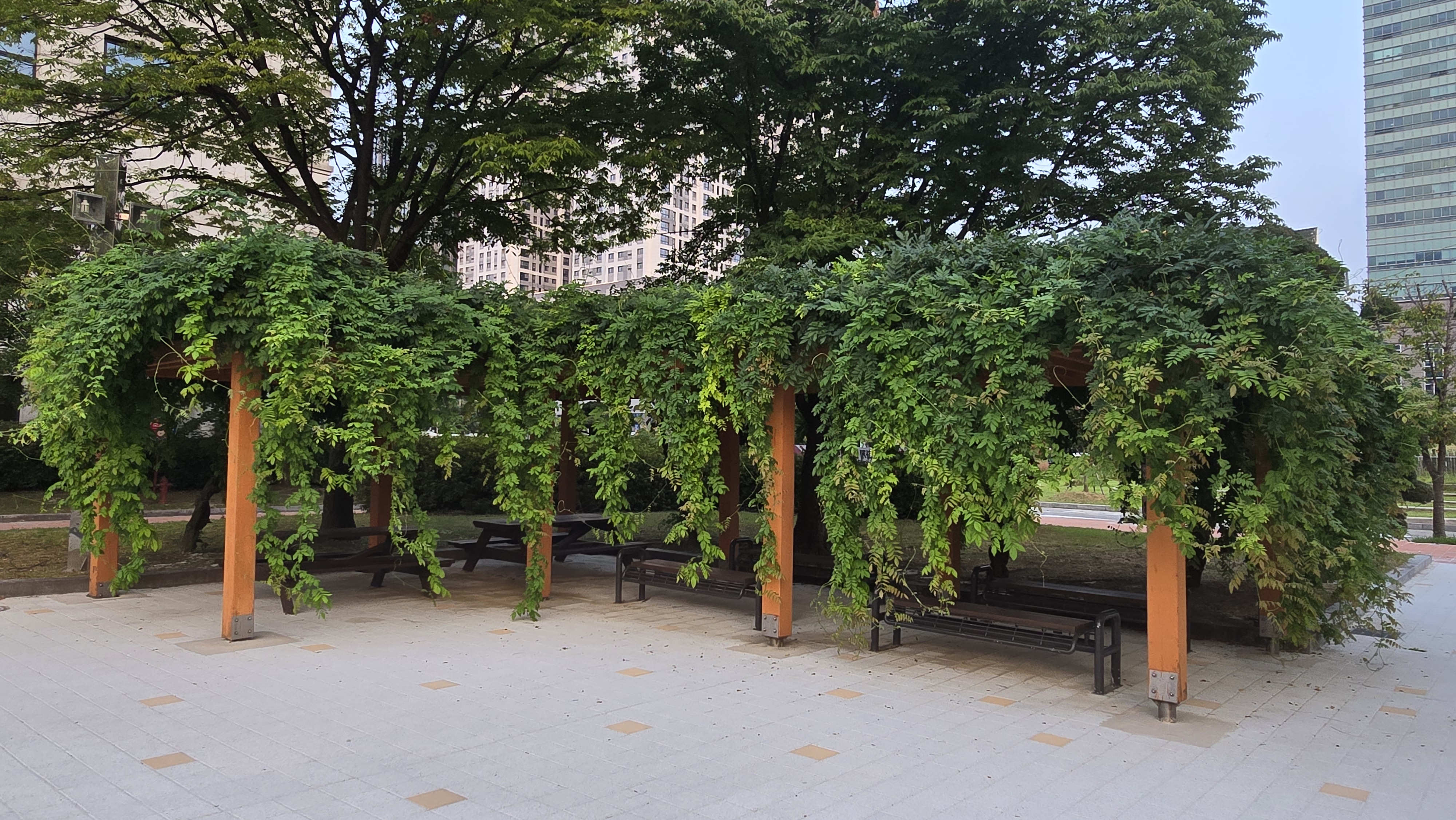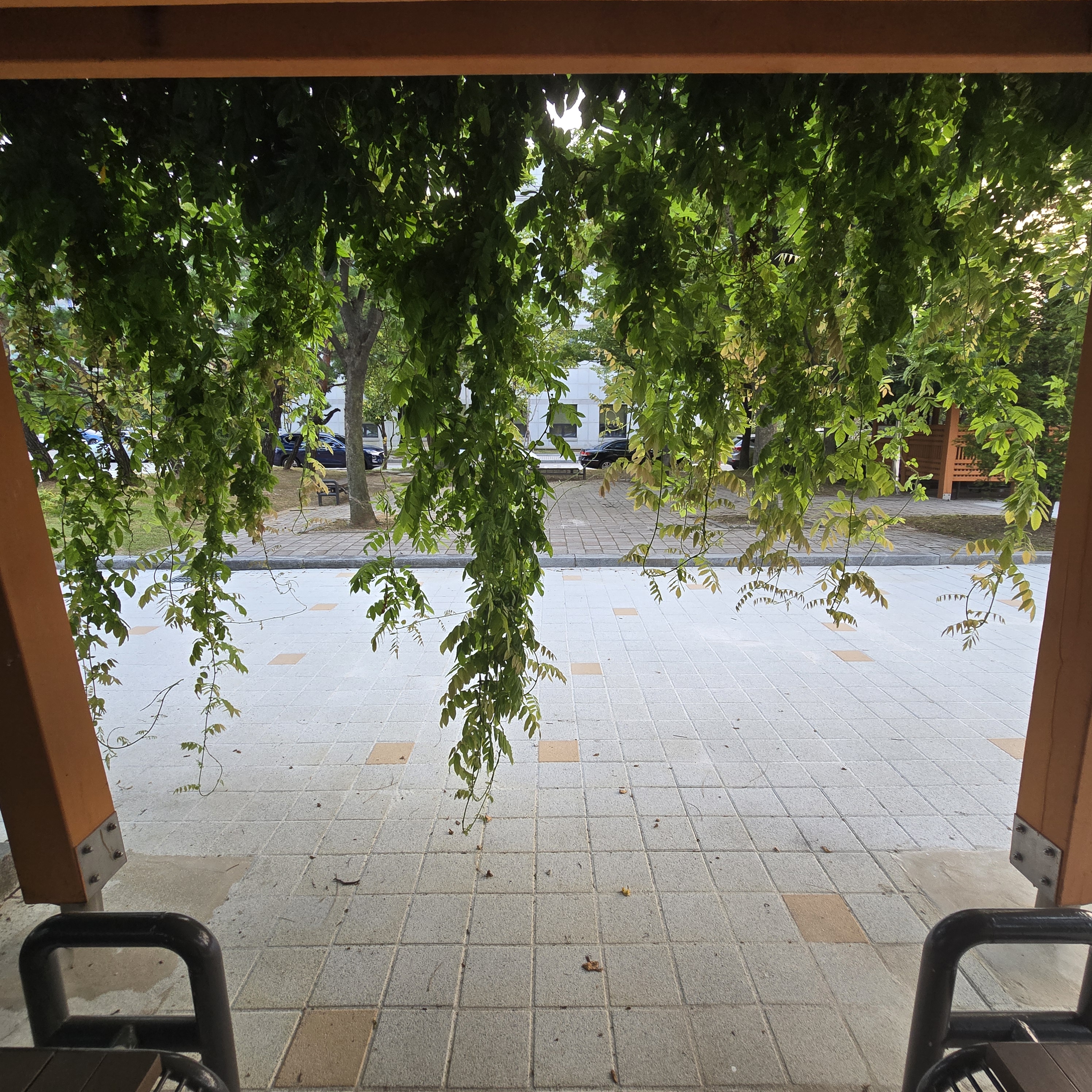 2024.08.12/ #도시기록 #등나무 #인양시청/ 안양시청 본관 건물 서쪽출입문앞 등나무 쉼터. 등나무 한그루가 만든 넝굴이 쉄터 전체를 덮앞다. 자연의힘. 등나무쉼터 옆으로 포도나무 넝굴도 있었는데 언젠가 없애버려서 너무나 아쉽다. 그대로 두었더라면 지금쯤 포도송이에 매달린 포도알이 보라빛으로 땡글땡댕 영글어 갔을텐데. 과거 안양 특산물을 상징하던 포도나무가 시청내에서 사라진것이 안타깝다.