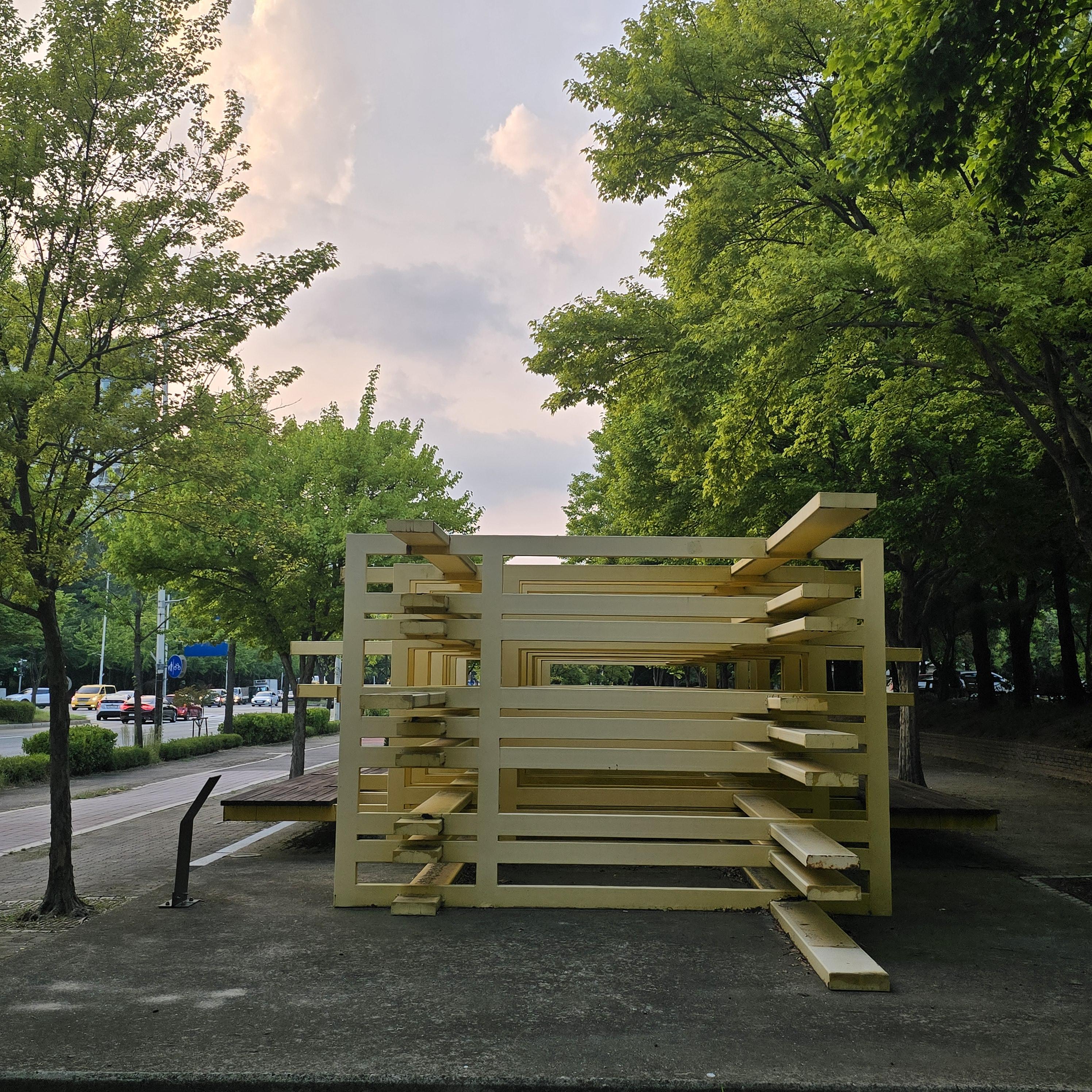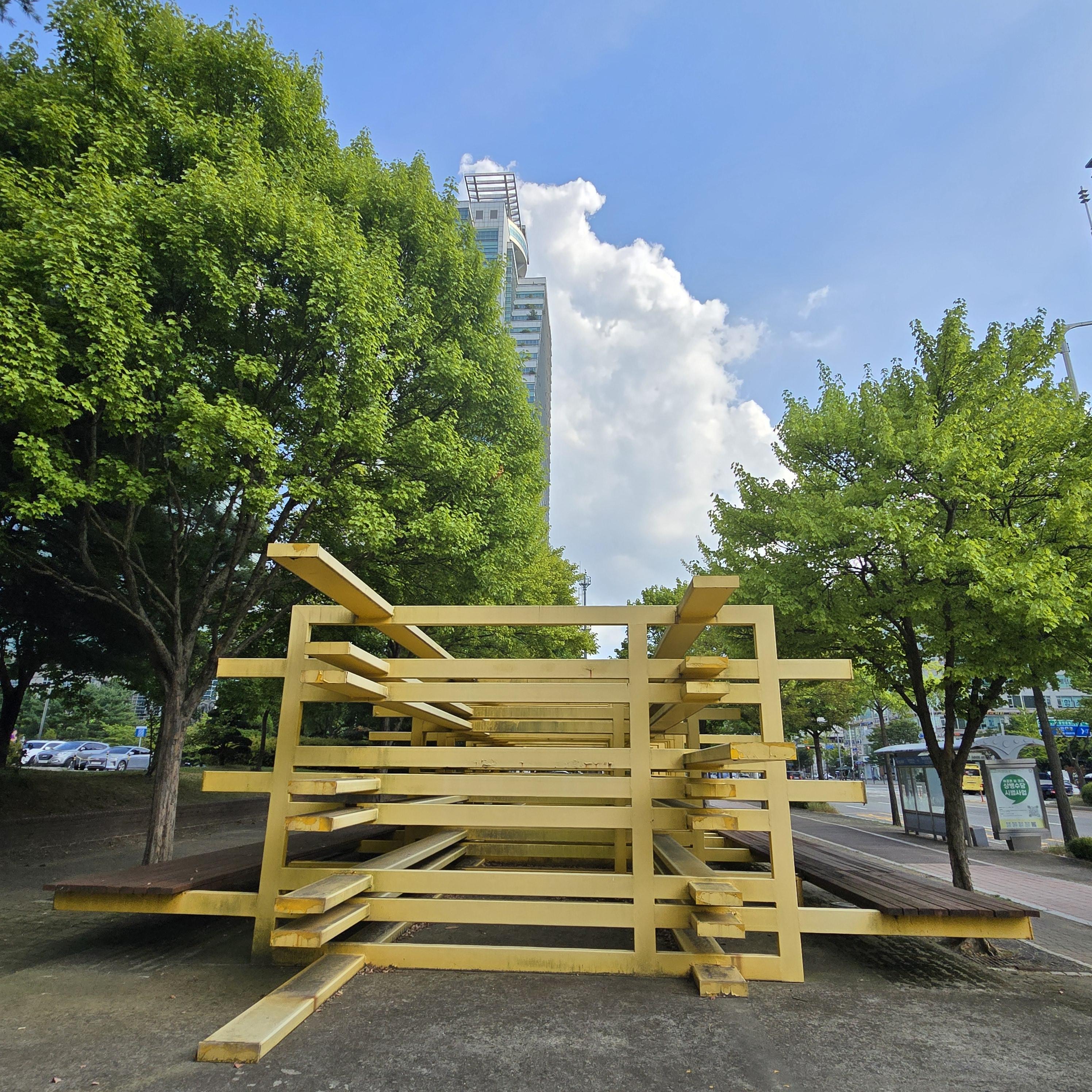 2024.08.19/ #도시기록 #안양 #apap작품 #평촌 #리암길릭/ 영국출신의 세계적 설치예술가인 리암 길릭(Liam Gillick, 1964-)의 작품으로 '안양광장을 위한 사회적 구조물제안'이란 제목의 노란색 구조물이다. 이 작품은 2007년 제2회 안양시 공공예술프로젝트(APAP)때 설치된 것이다.