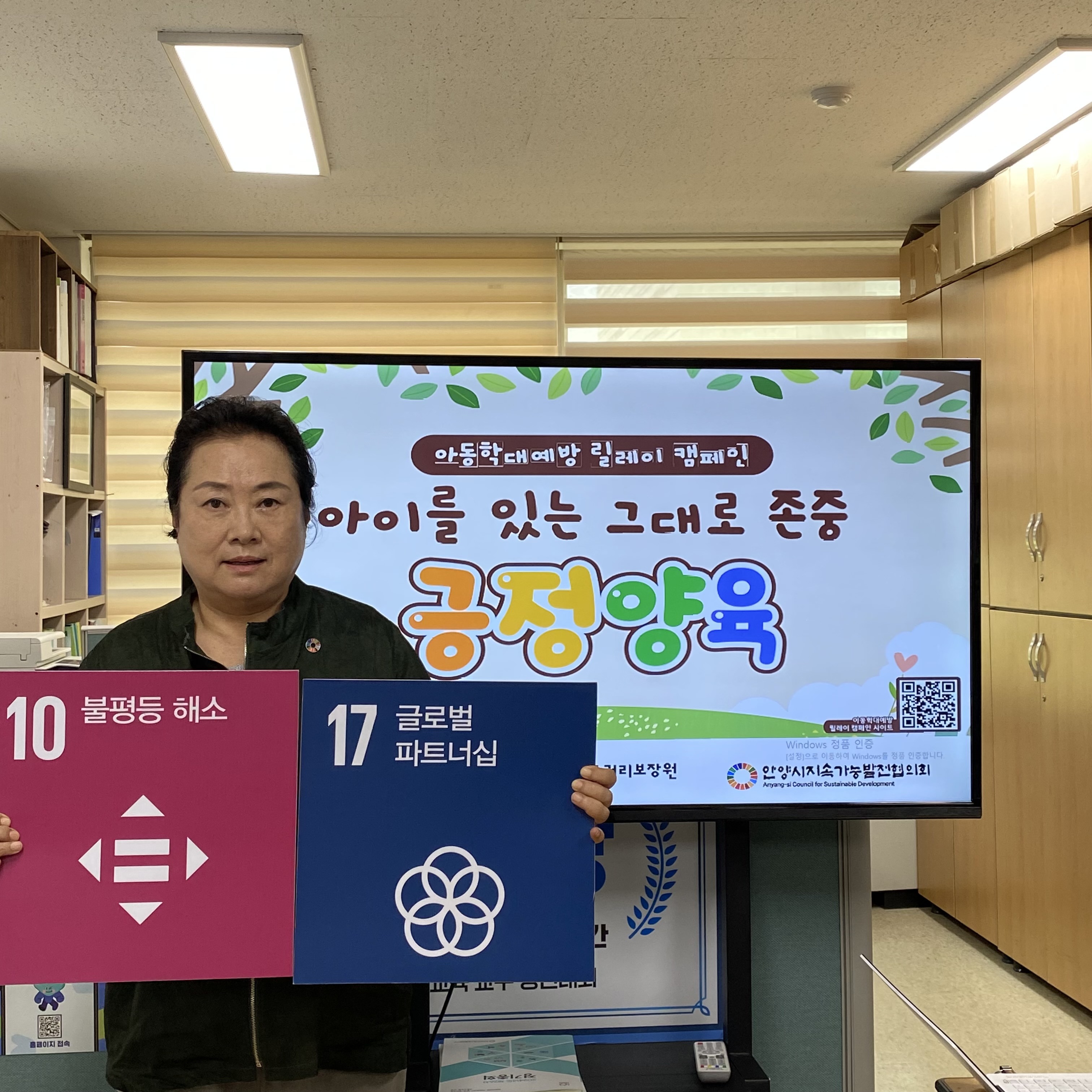 안양지속협 양숙정 상임회장은 안양외국어고등학교의 지목을 통해 캠페인을 전달받았으며 19일 열린 안양지속협 운영위원회에 참석한 위원들 앞에서 '긍정 양육' 피켓을 들고 릴레이 홍보 사진을 찍으면서 “ 안양시지속가능발전협의회는 모든 아동이 행복하고 건강한 사회에서 살아갈 수 있도록 아동학대에 대한 심각성을 일깨우고 예방할 수 있도록 관심을 기울이겠다"고 말했다