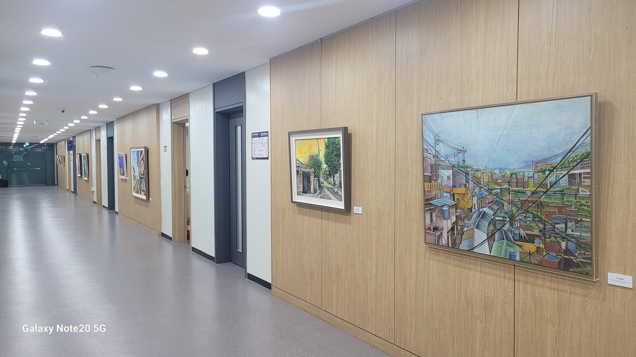 인재육성재단 복도 '쉼표[,]미술관의 손순자작가 초대전으로 미련한 사라져가는것의 기록 '안양냉천마을기억' 전이 지난 7월부터 시작돼 오는 29까지 진행되고 있다.